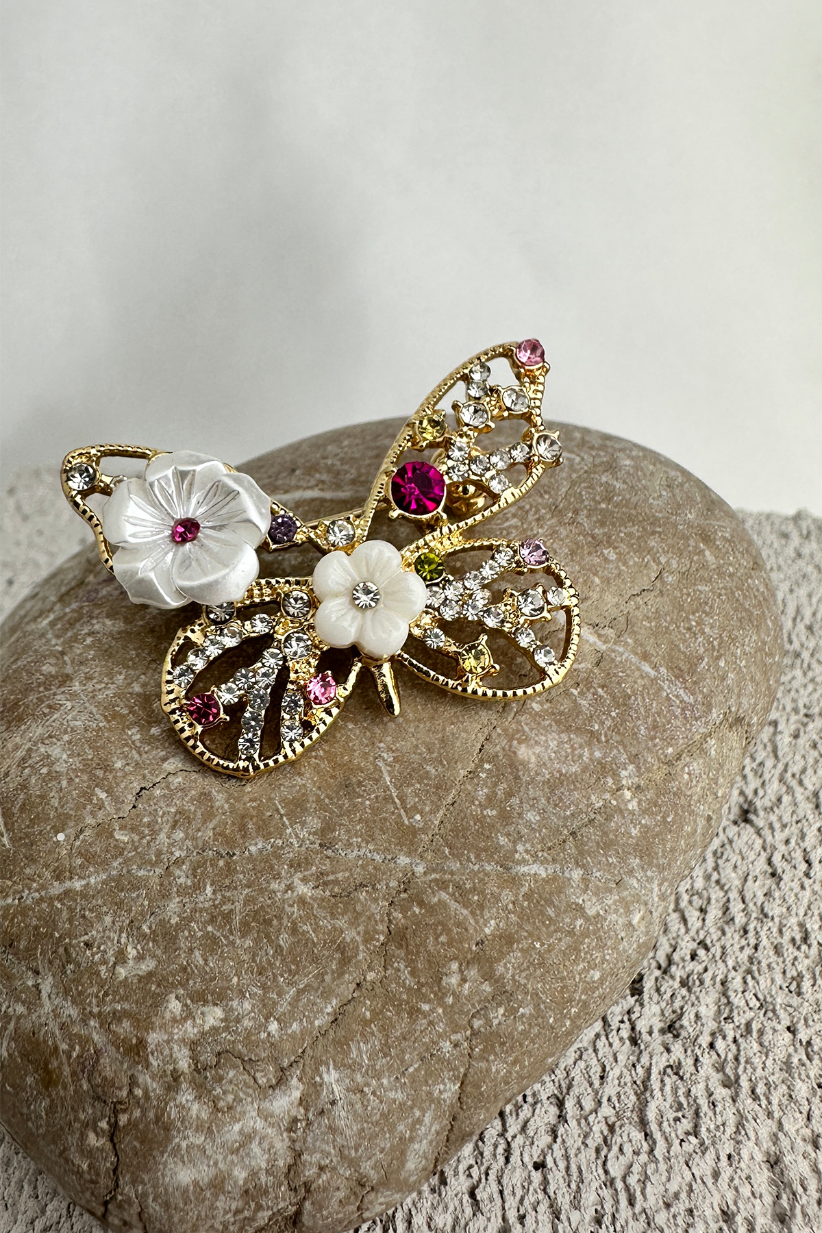 🌼 Tasarım: Kelebek formunda – Çiçek ve taş detaylı