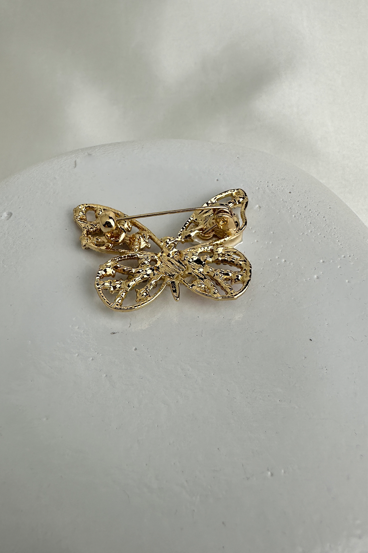 Altın Rengi Çiçek Detay Taşlı Kelebek Broş (4cm)