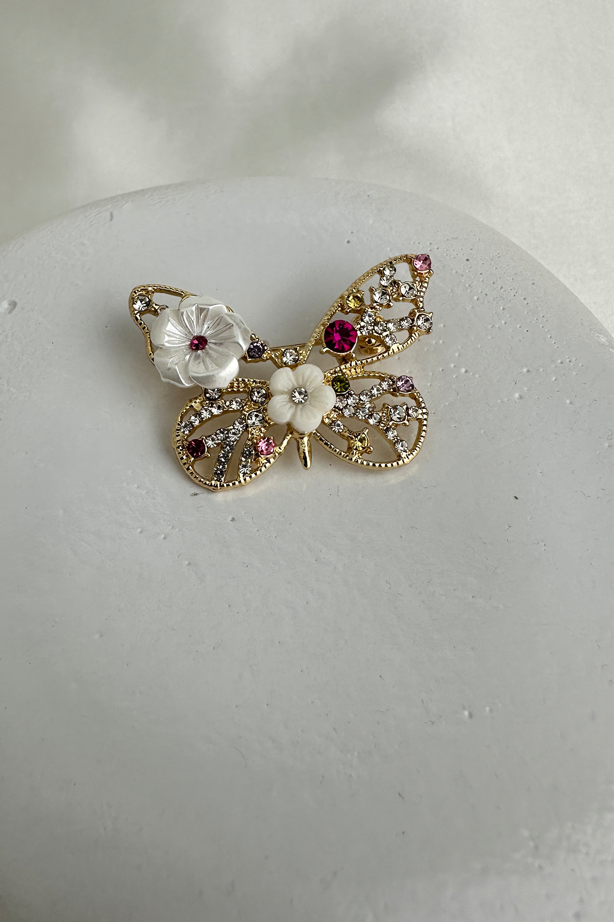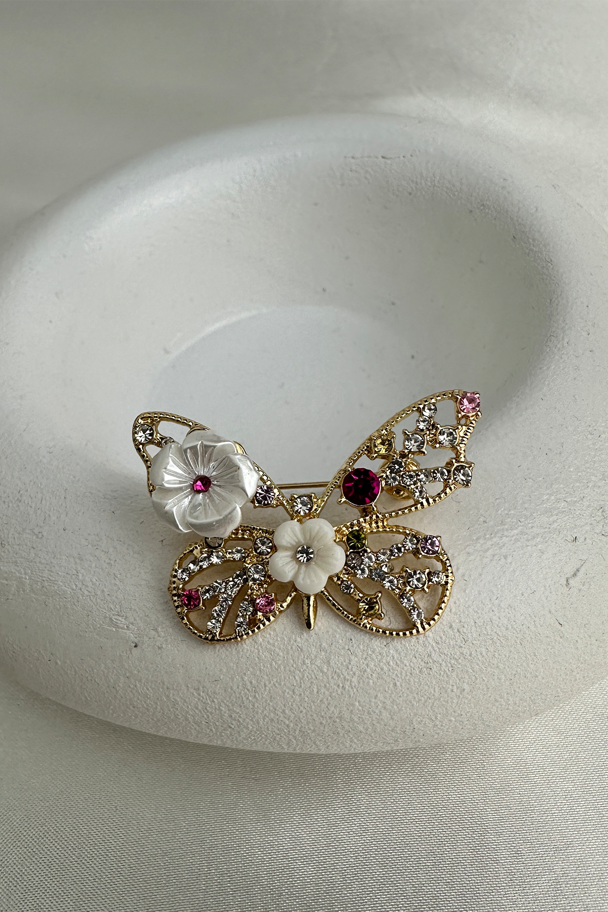 Altın rengi metal yapısı, ışıltılı taş süslemeleri ve zarif çiçek detaylarıyla bezenmiş bu kelebek broş, her kombine romantik ve şık bir dokunuş katıyor. 4 cm’lik ideal boyutu sayesinde hem dikkat çeker hem de zarif durur. Ceketlerden elbiselere, şallardan çantalara kadar pek çok parçada kullanabileceğiniz çok yönlü bir aksesuardır.