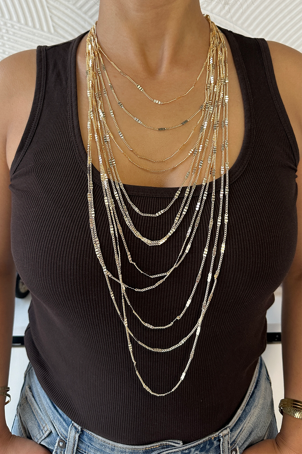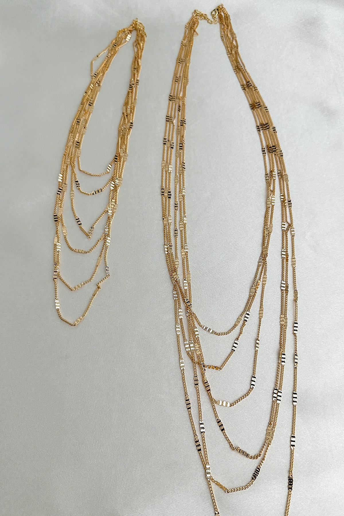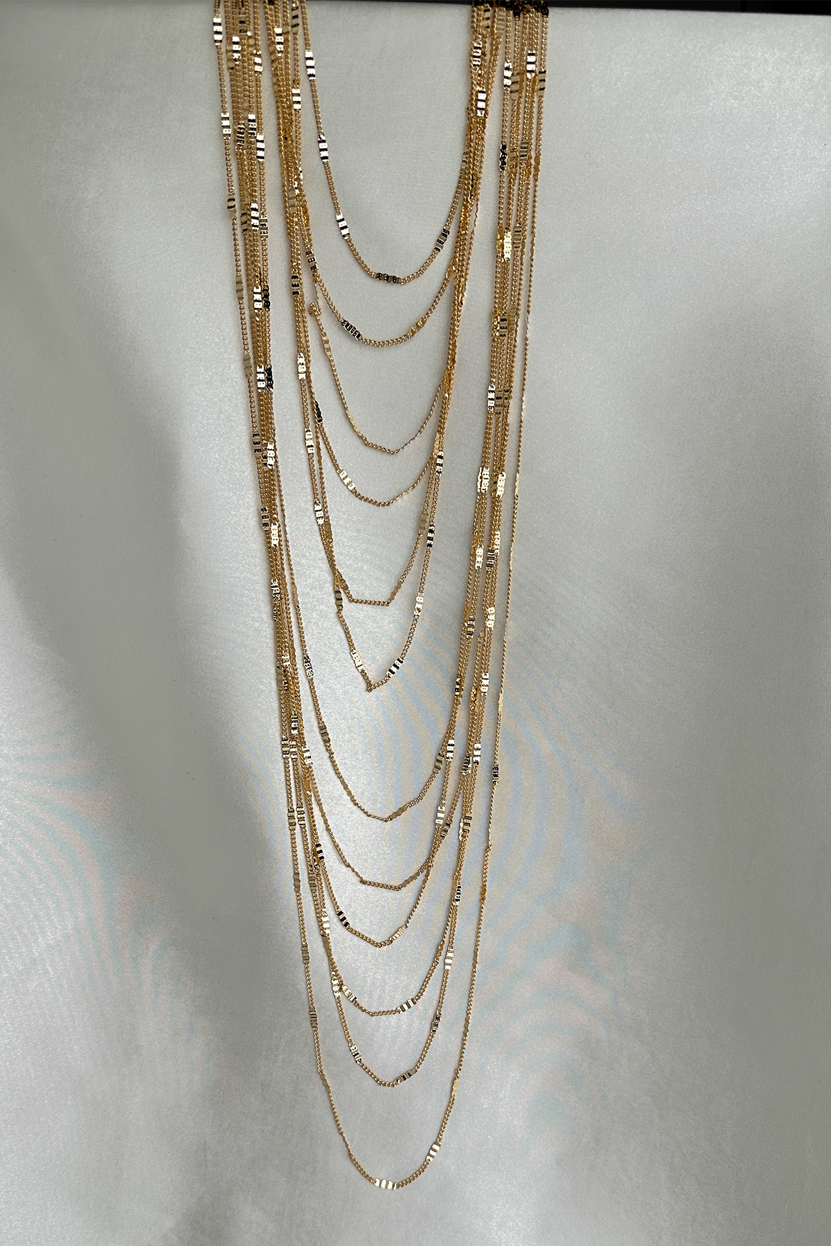 40 cm’den başlayıp 95 cm’ye kadar uzanan katmanlı yapısı, boyun ve dekolte hattında zarif bir duruş sergiler. Her bir zincir katmanı hafif ışıltısıyla öne çıkar; sade bir tişörtle bile ışıldamak artık çok kolay!
