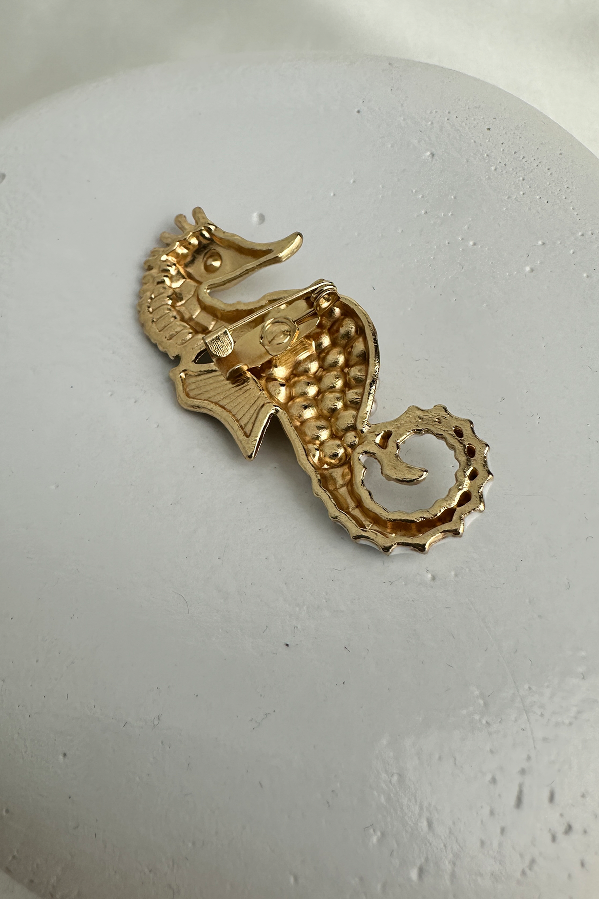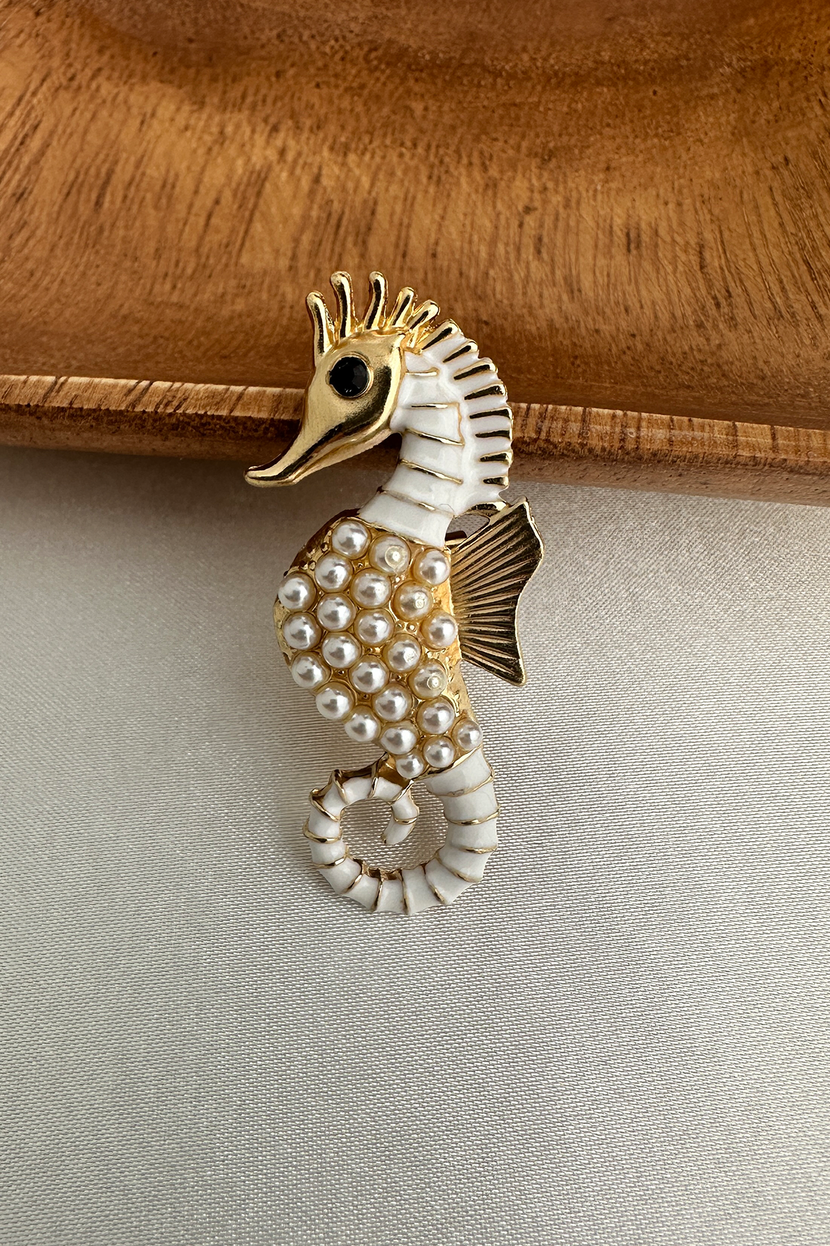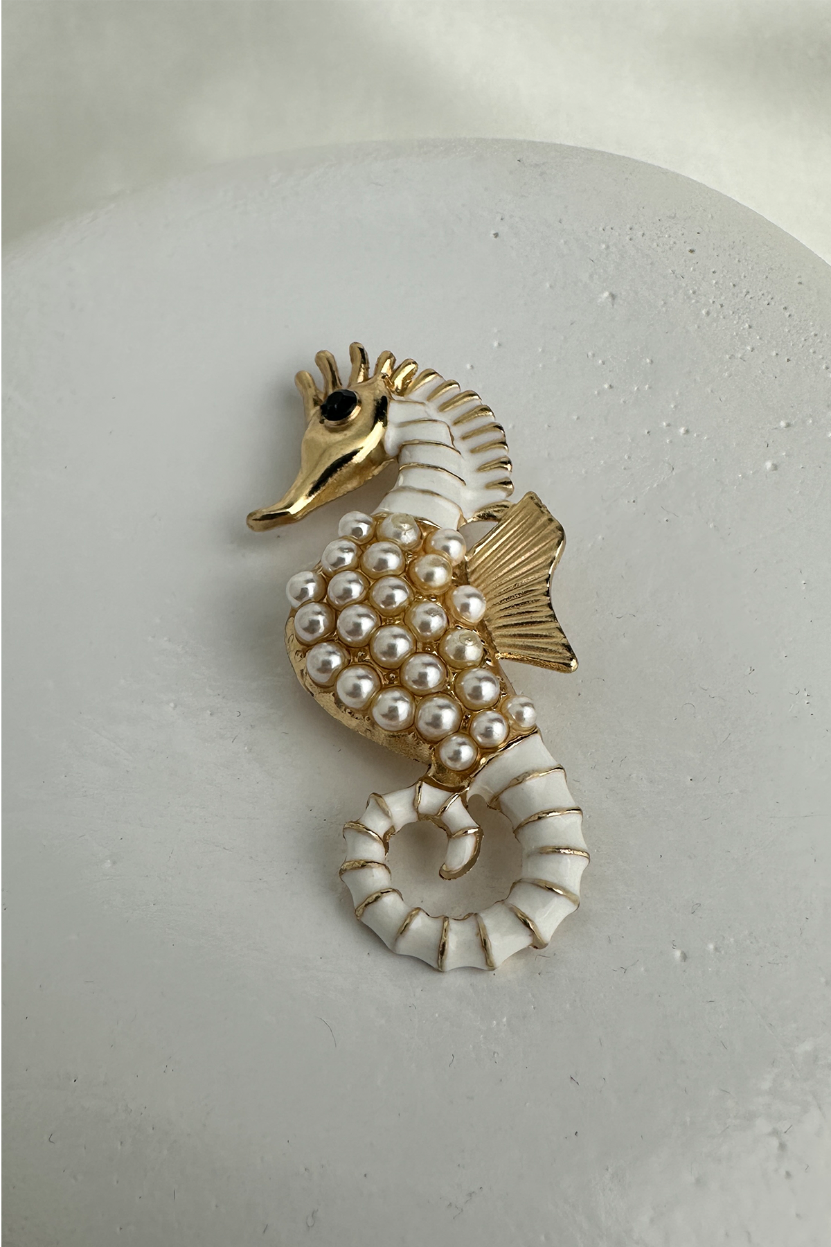 Zarafetin ve deniz esintisinin buluştuğu bu özel deniz atı broş, altın rengin ışıltısını inci detaylarla tamamlayarak göz alıcı bir şıklık sunar. İnce işçilikle tasarlanmış bu zarif parça, stilinize hem doğal hem de sofistike bir dokunuş katar.
