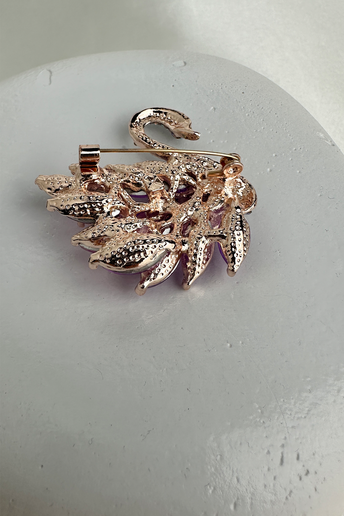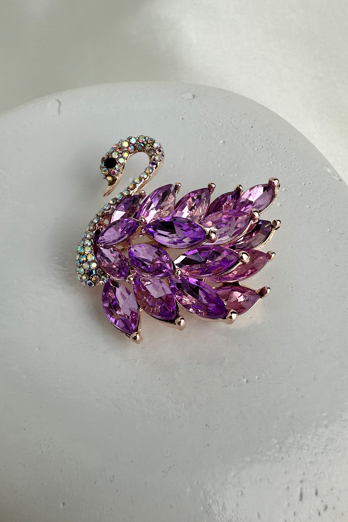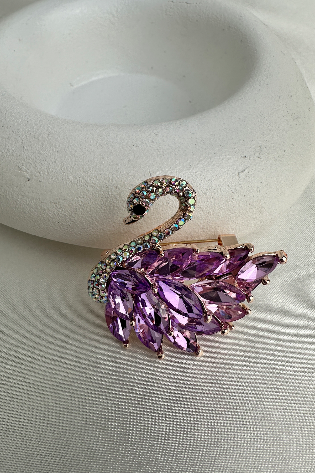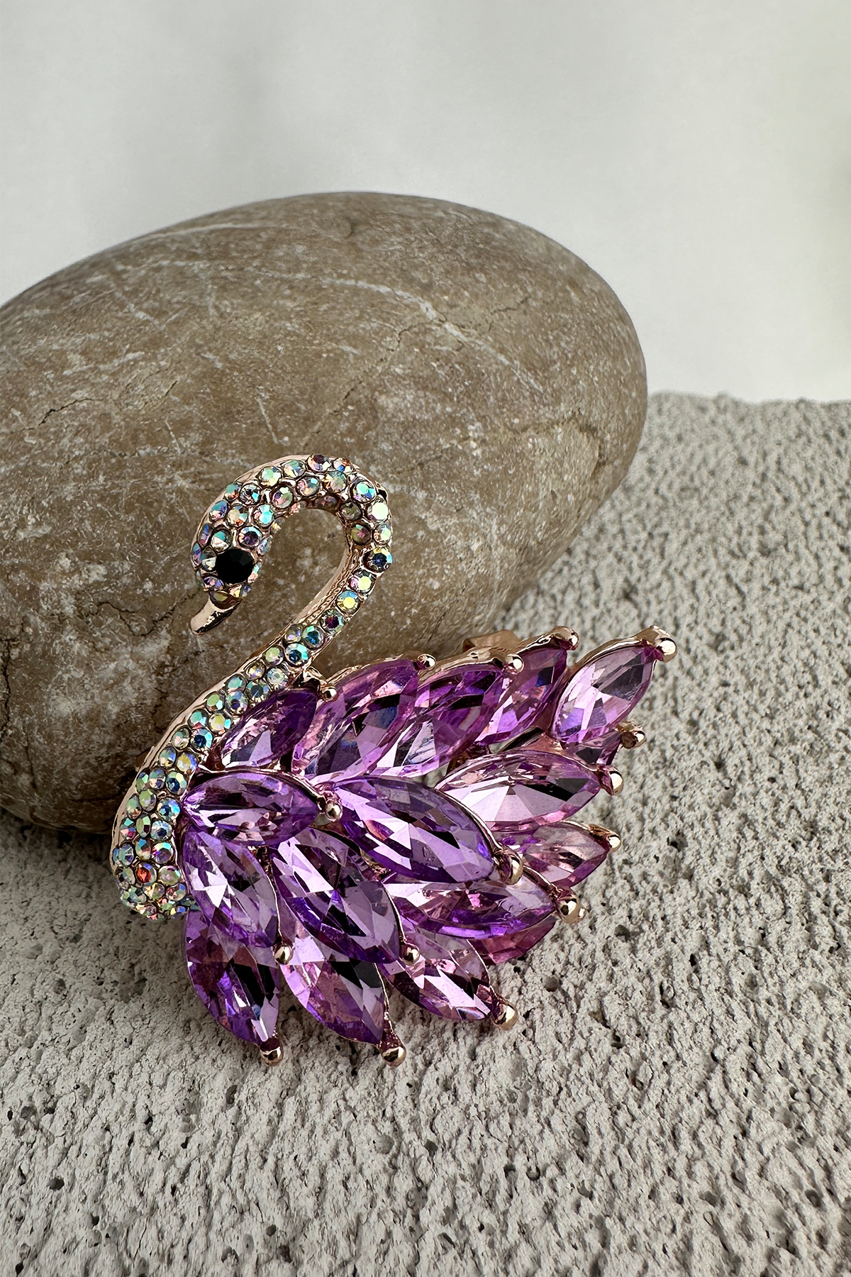 Göz alıcı mor mekik taş detayı ve şık altın rengi kaplamasıyla tasarlanan bu özel broş, kuğu figürünün zarafetini en ince detaylarıyla yansıtıyor. 4 cm'lik ideal boyutuyla hem günlük kombinlerinize hem de özel davetlerdeki şıklığınıza zarif bir tamamlayıcı olur.