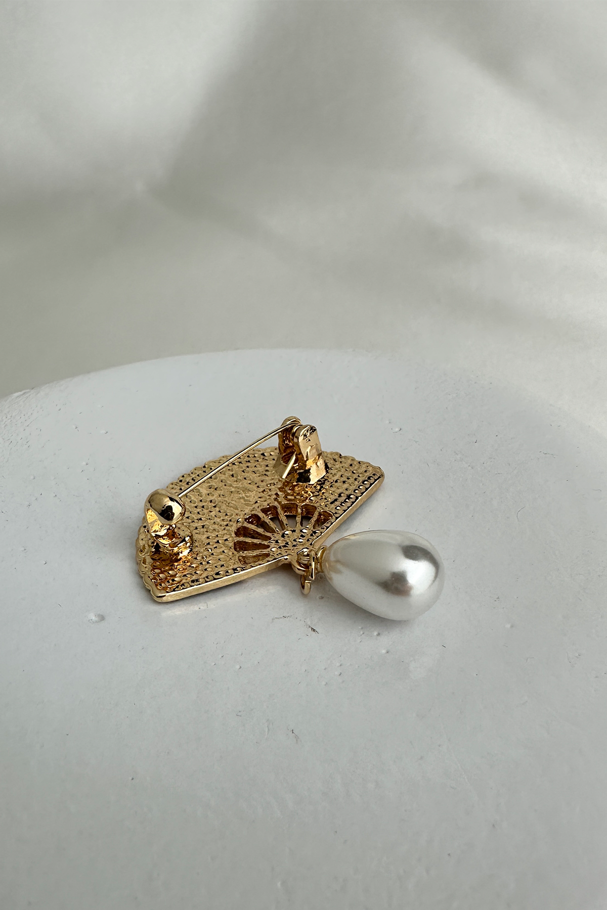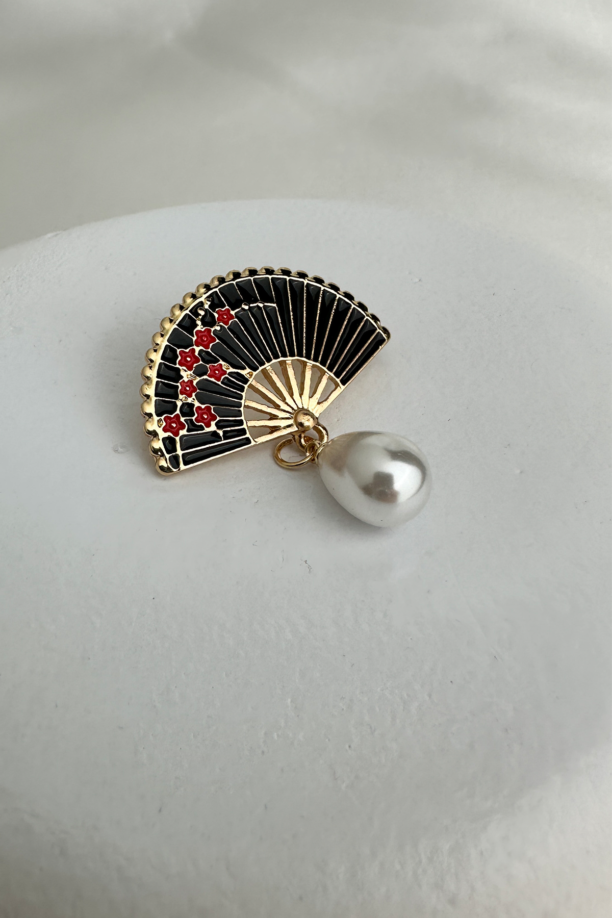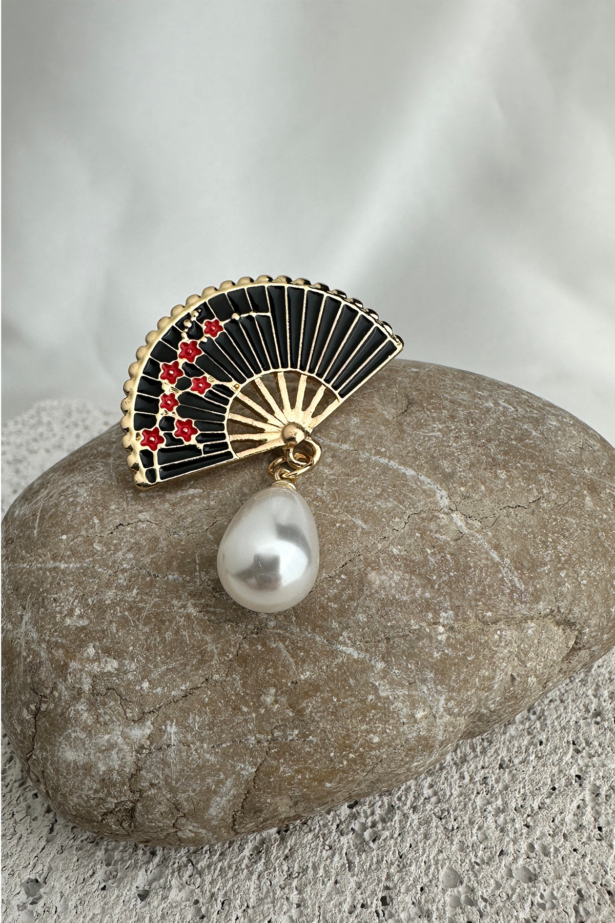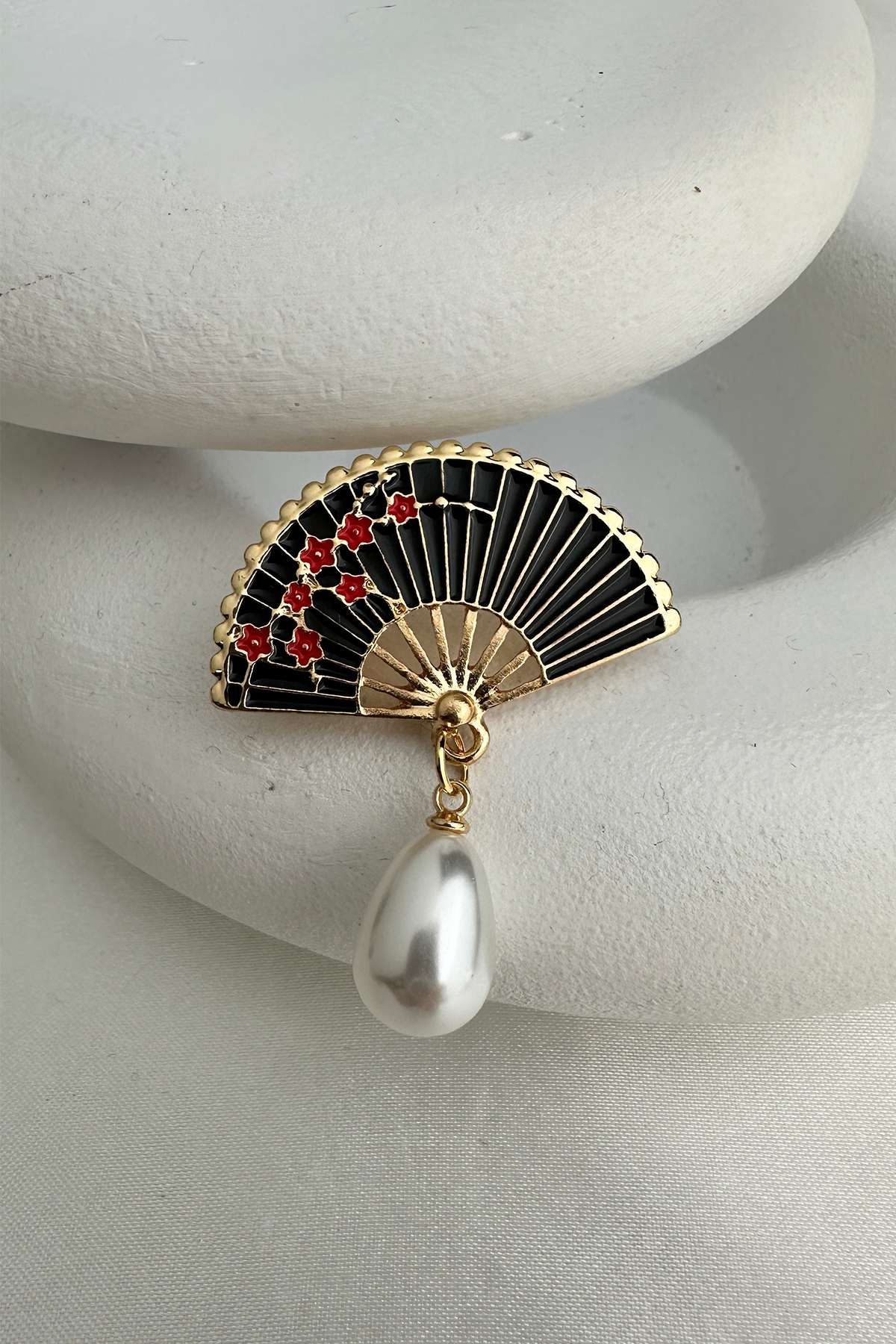 Bu göz alıcı broş, klasik tasarım çizgilerini modern detaylarla buluşturuyor. Altın rengi metal yüzeyiyle sofistike bir duruş sergilerken, siyah mine kaplamalı yelpaze formu ile zarif bir kontrast sunuyor. Yelpazenin ortasında yer alan oval formda, sallantılı inci detayı ise hareket ettikçe ışığı yansıtarak dikkat çekici bir ışıltı yaratıyor.
