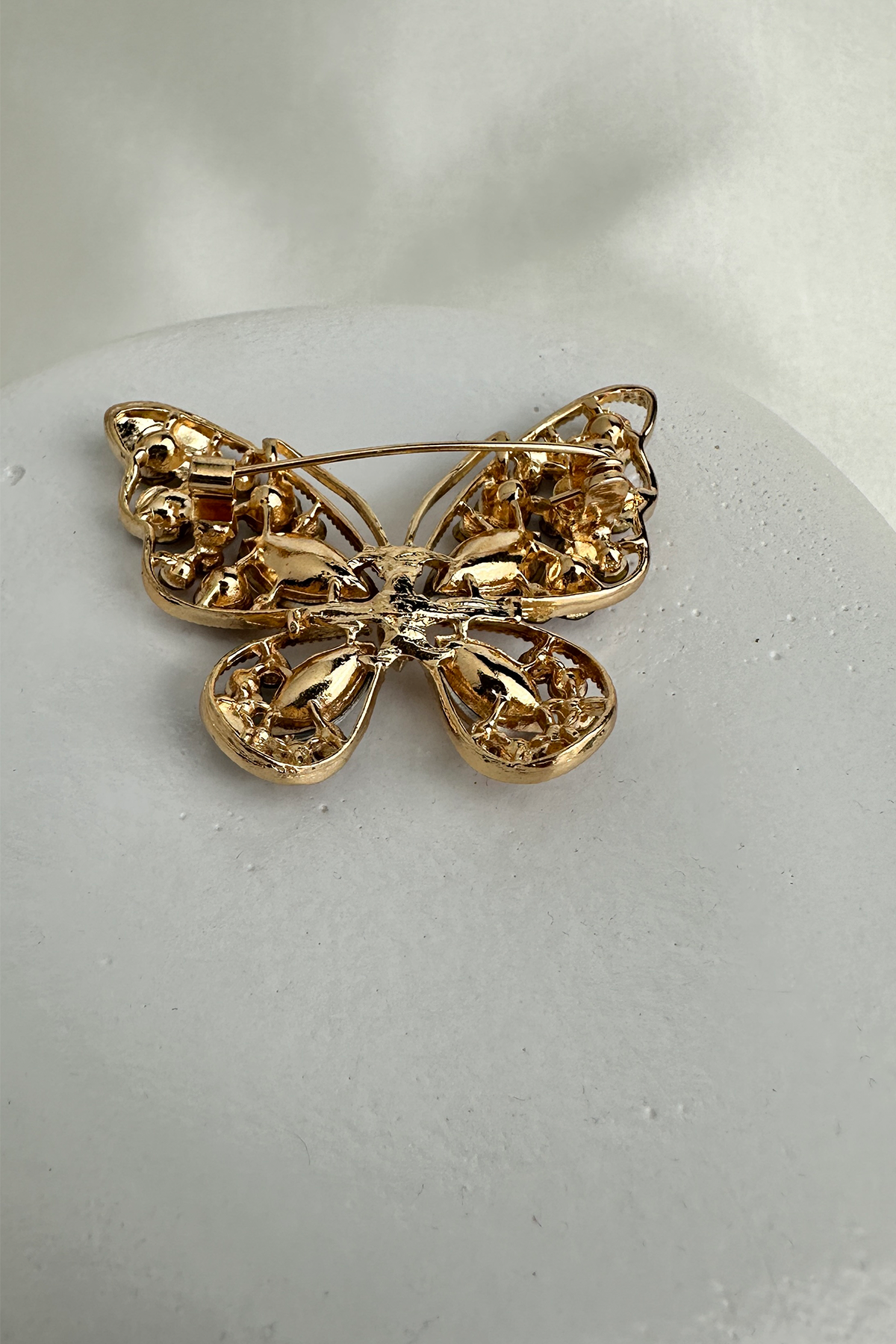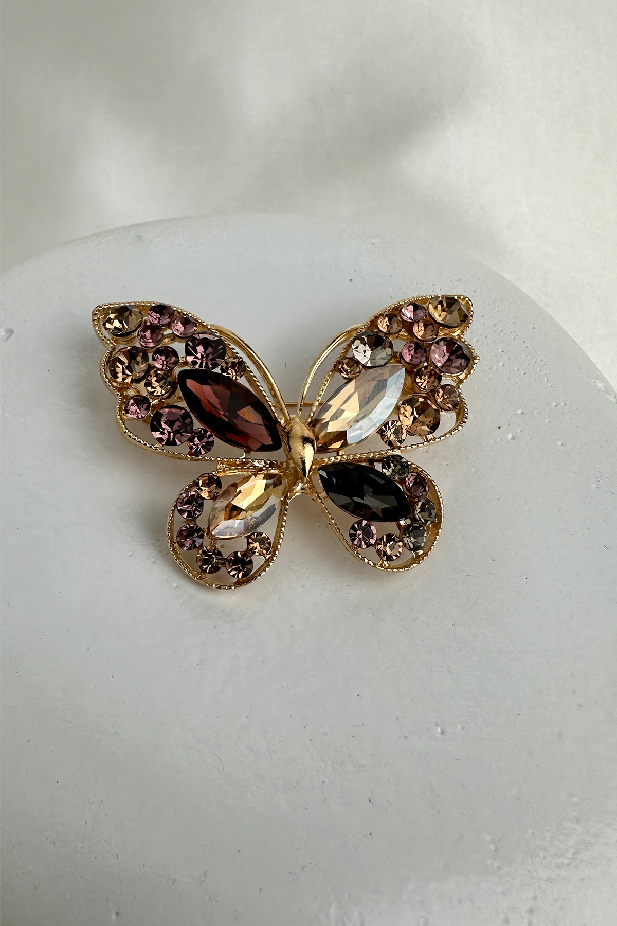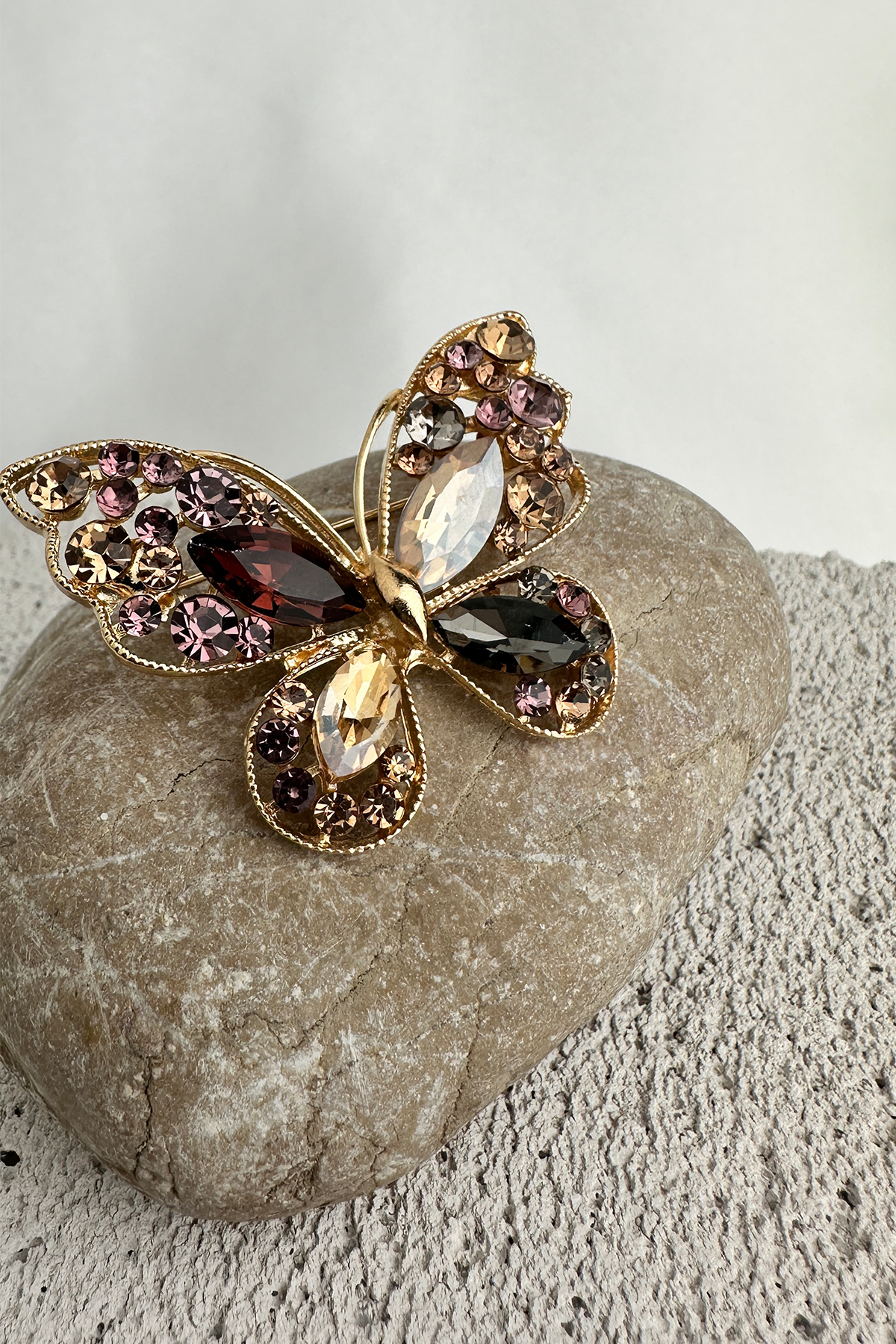 Altın rengi metal üzerine yerleştirilmiş renkli mekik kesim taşlar ile tasarlanan bu kelebek broş, zarif ve dikkat çekici bir duruş sergiler. 5 cm'lik ideal boyutu sayesinde hem günlük kombinlerde hem de özel davetlerde rahatlıkla kullanılabilir.