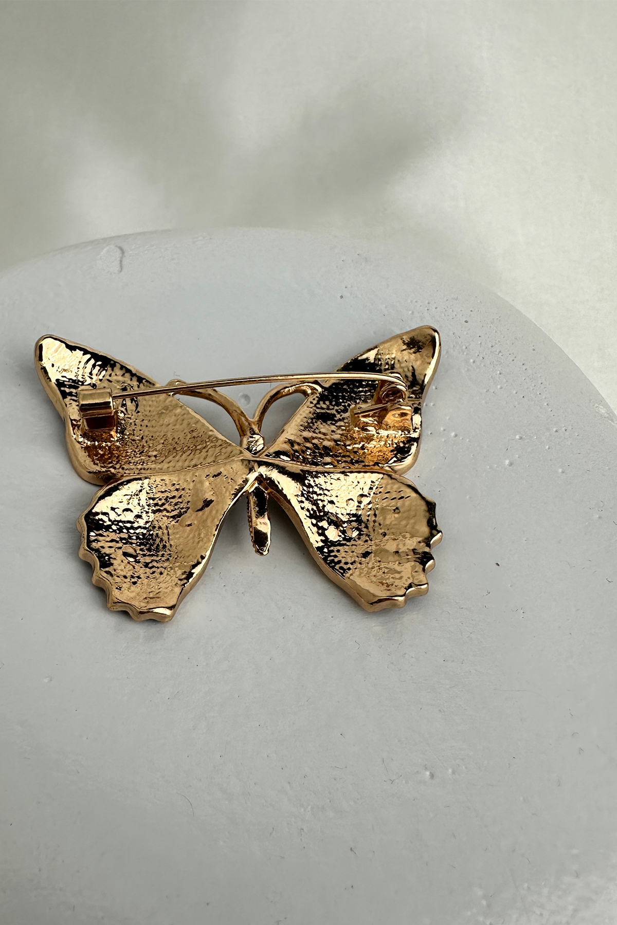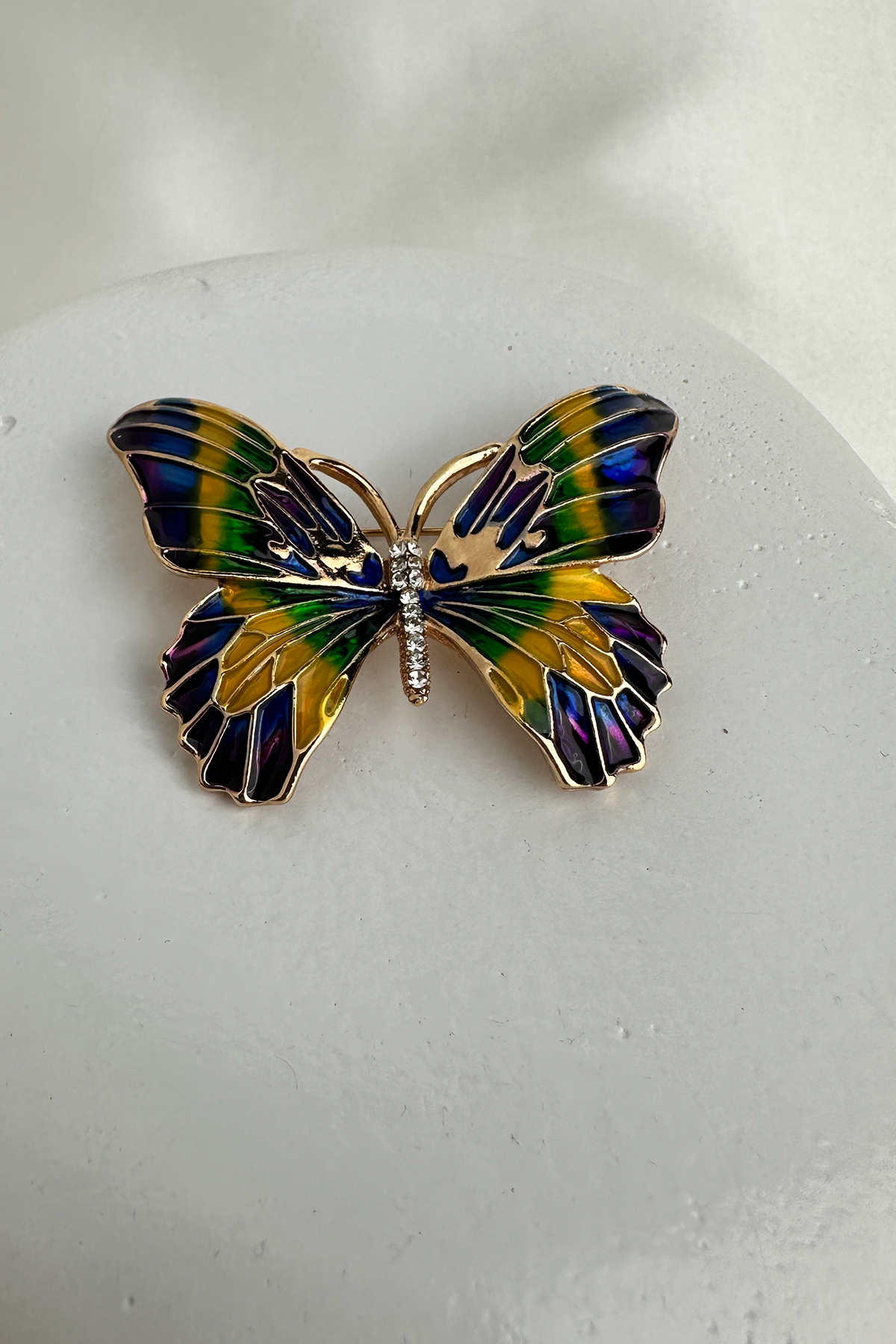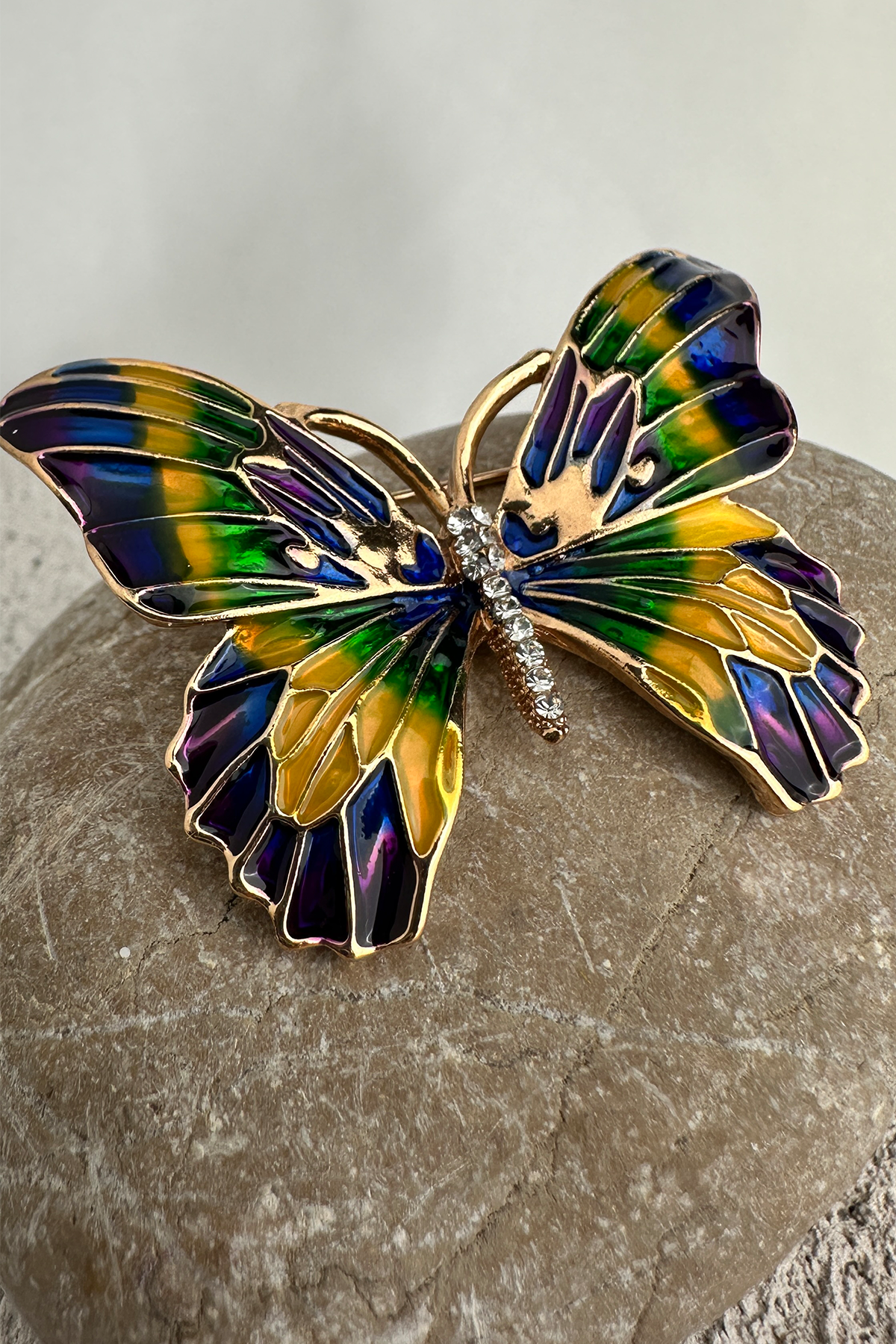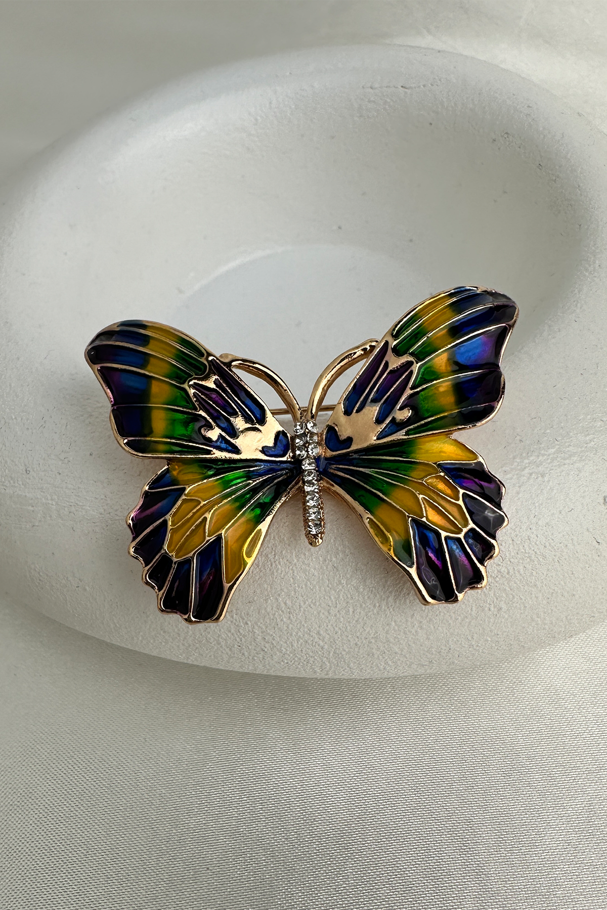 Göz alıcı renkli mine detayları ve zarif altın rengi metal dokusuyla tasarlanan bu kelebek broş, doğanın zarafetini ve enerjisini bir arada sunar. 5 cm’lik ideal boyutuyla kıyafetlerinizde dikkat çekici ama abartısız bir şıklık yaratır.
