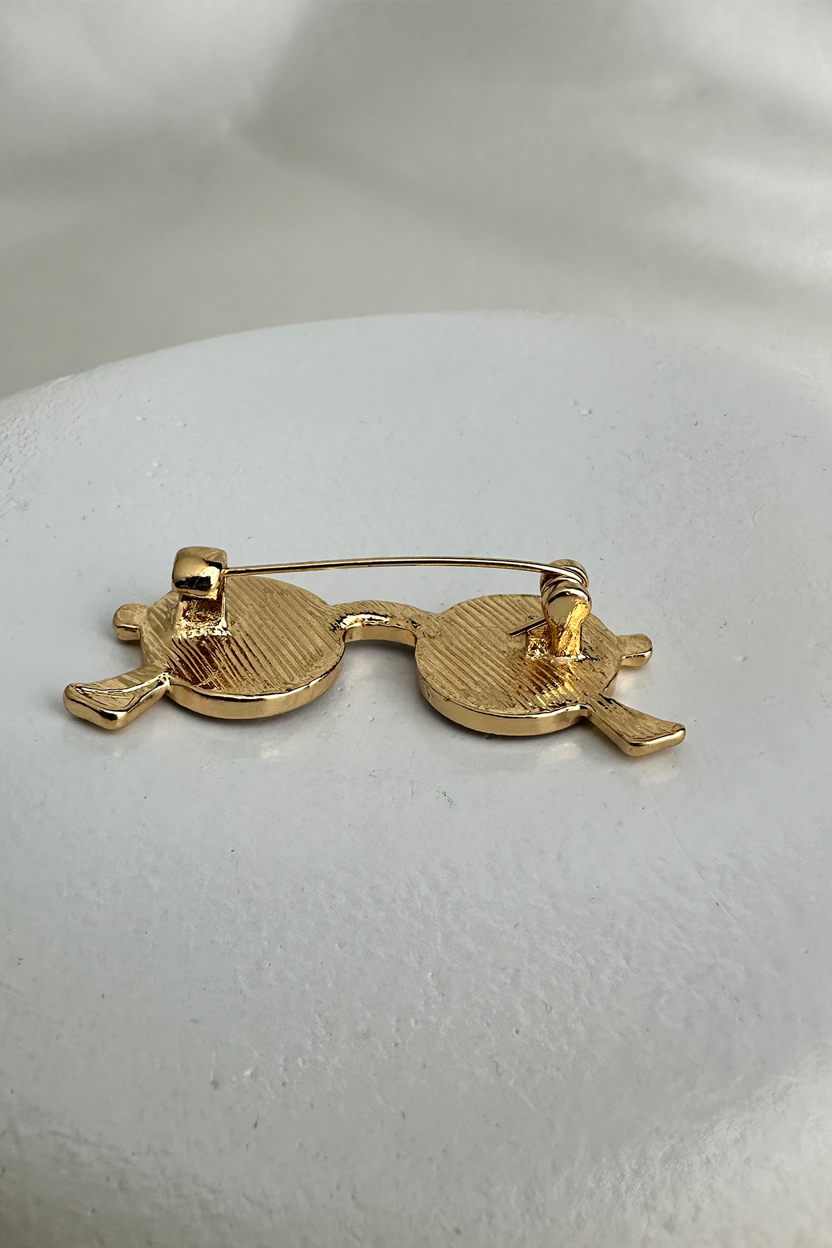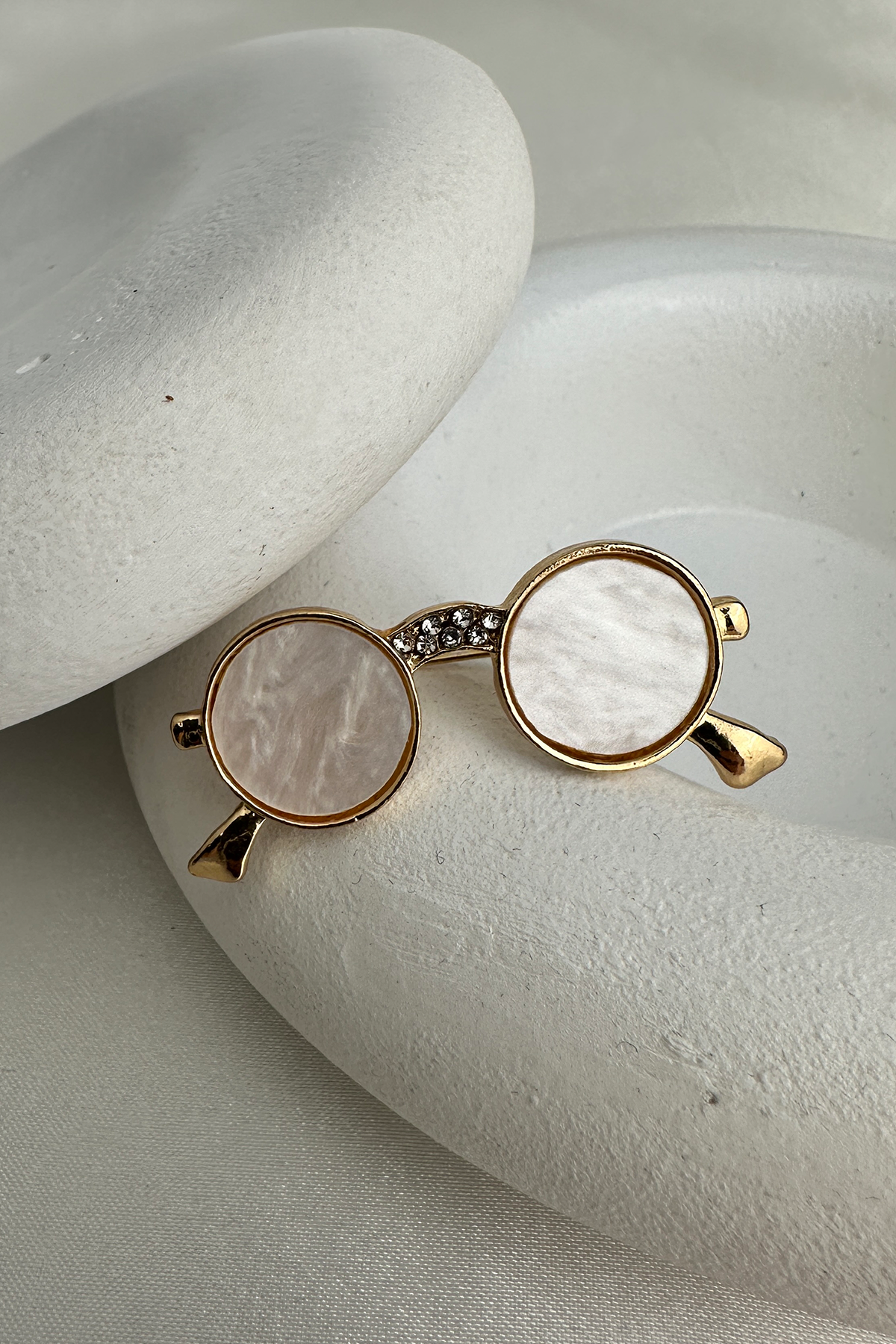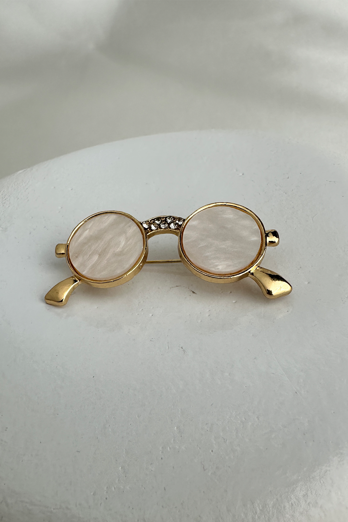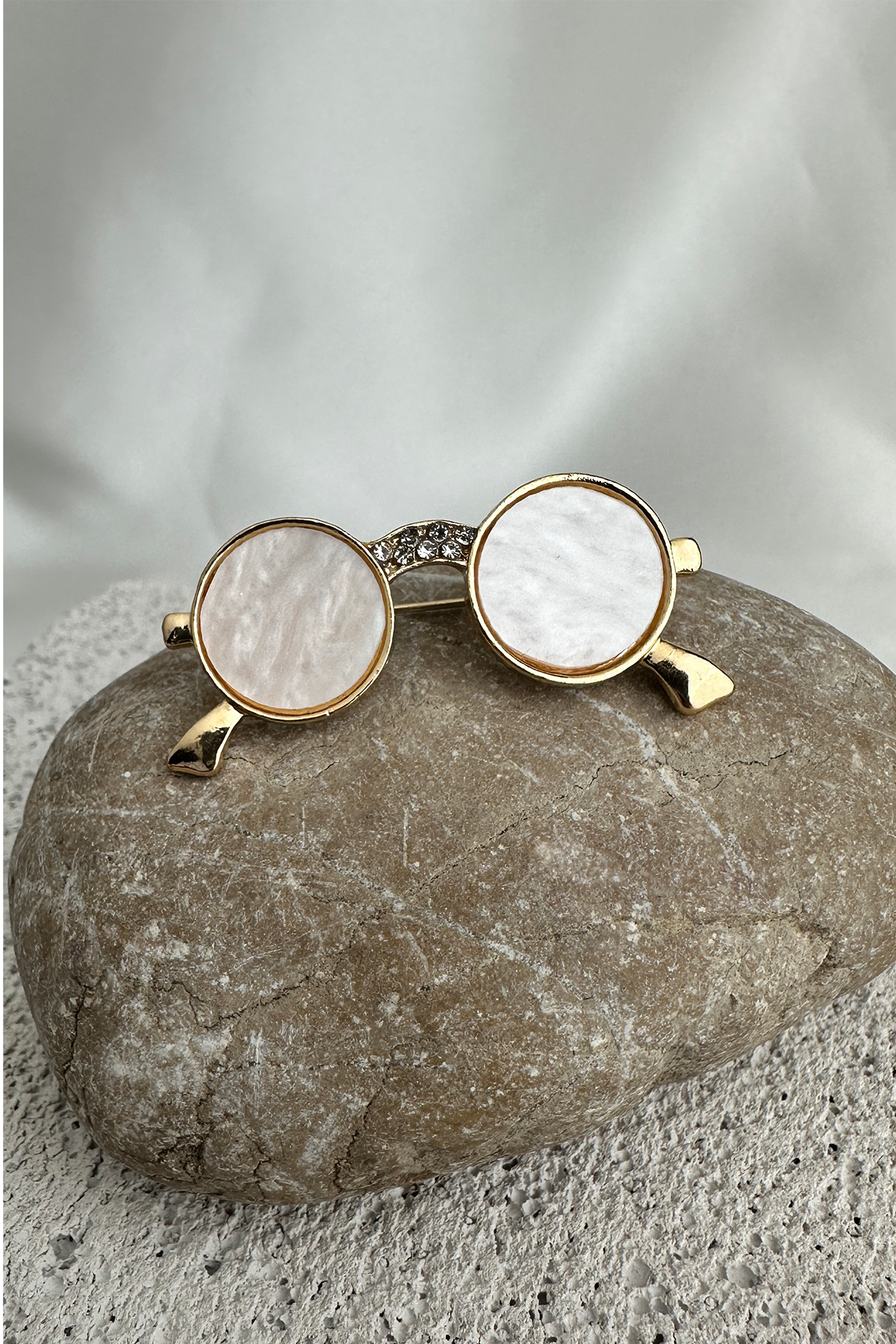 Yuvarlak gözlük formundaki bu yaratıcı broş, altın rengi metal yapısı ve beyaz sedef detaylarıyla hem dikkat çekici hem de şık bir görünüme sahip. Cam kısmında kullanılan sedef dokusu, ışığı yumuşakça yansıtarak zarif bir ışıltı yaratırken, kenarlardaki taş süslemeler tasarıma sofistike bir hava katıyor.
