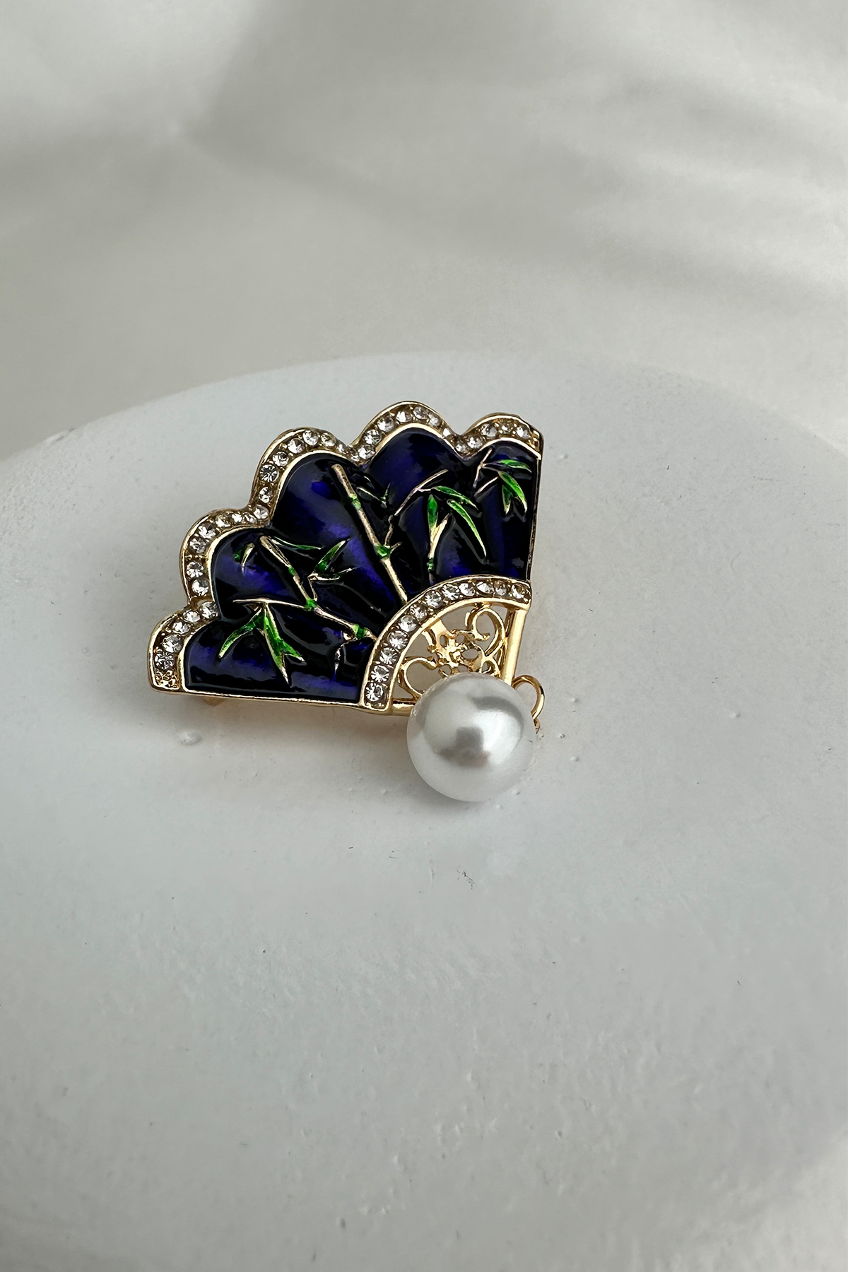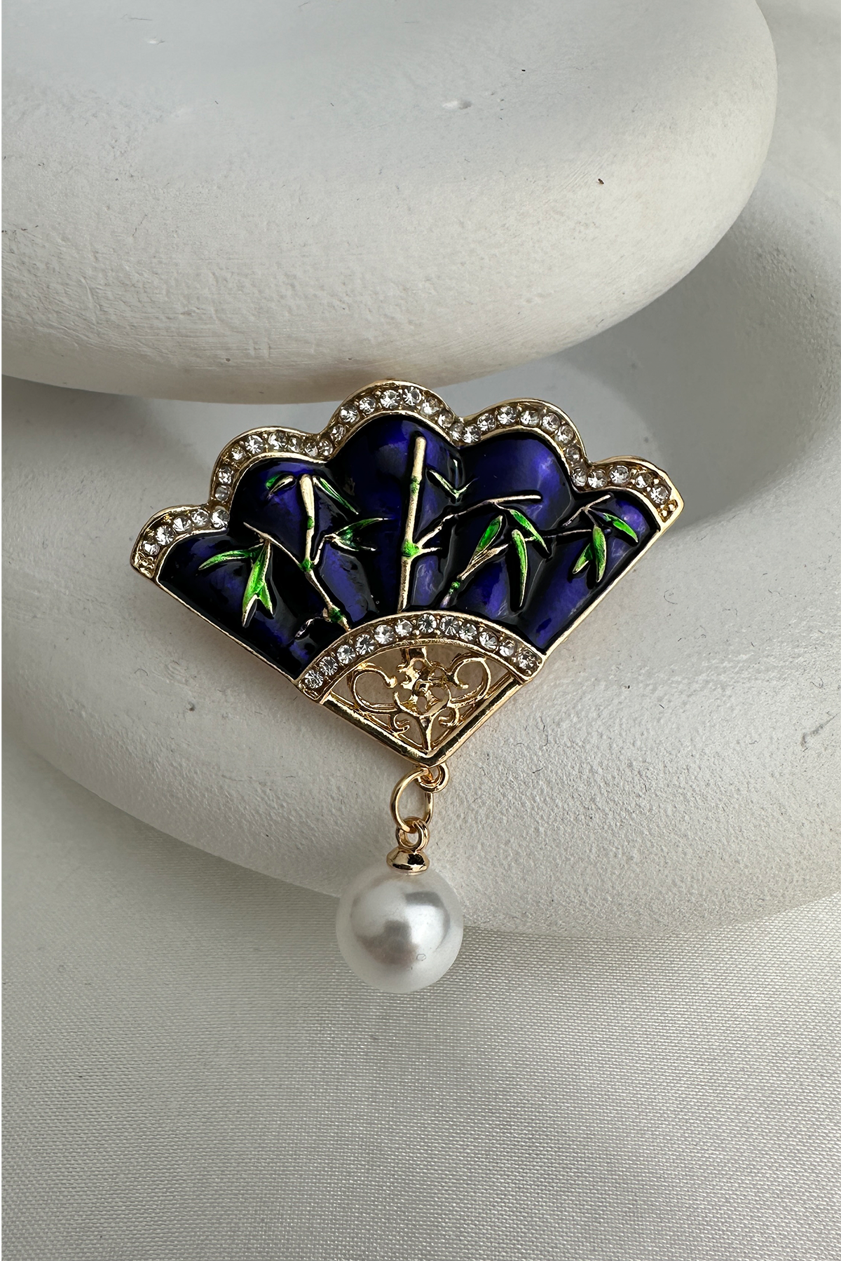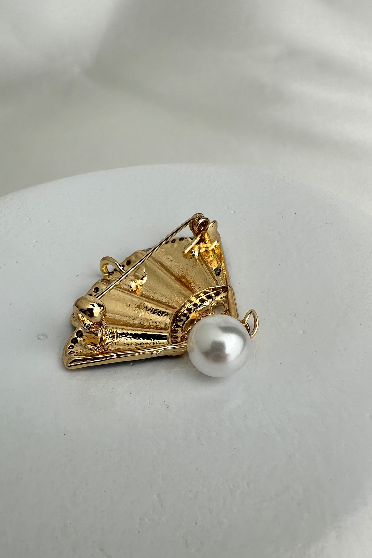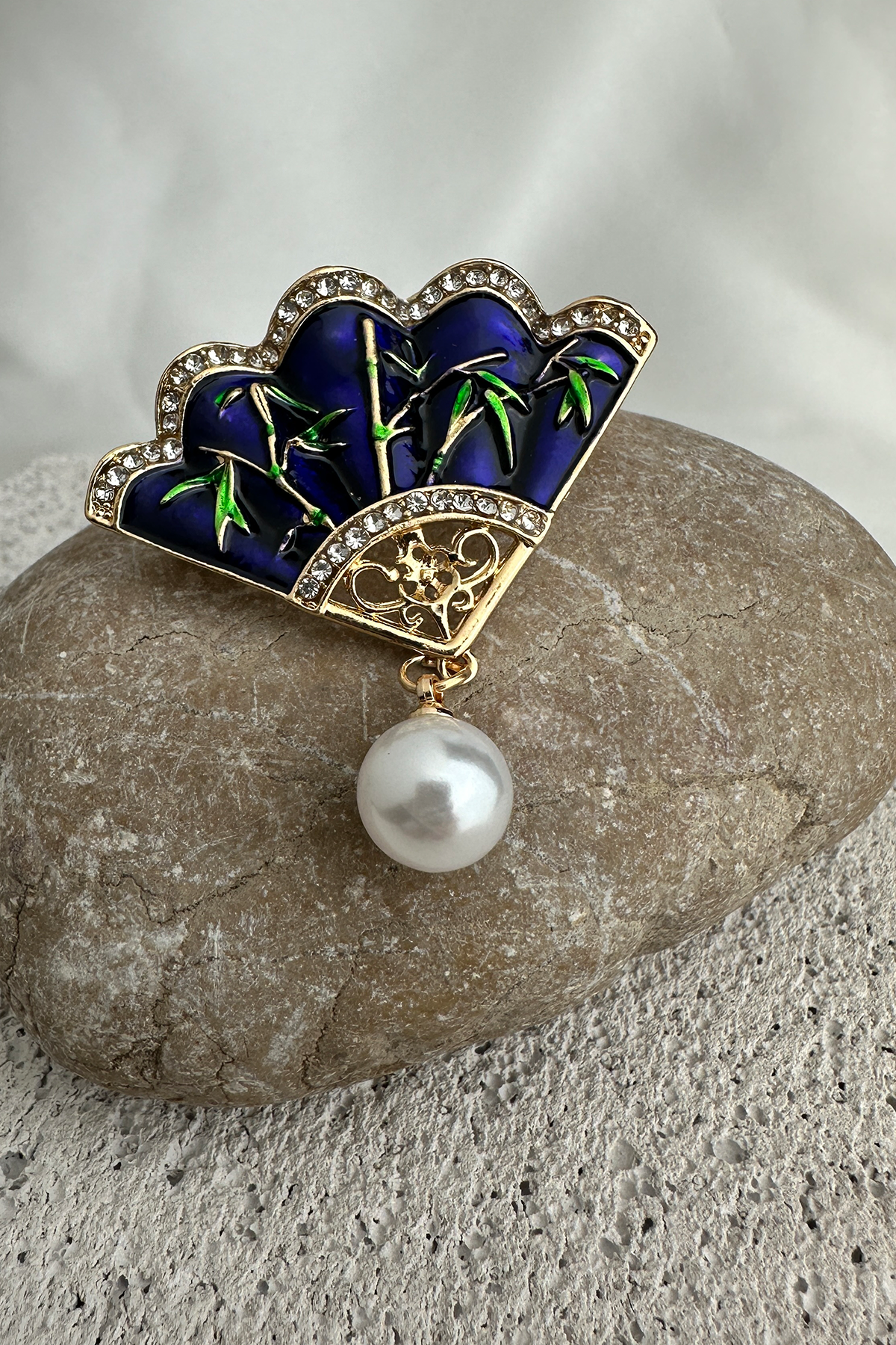 Altın rengin asaletiyle morun derin tonlarını buluşturan bu şık broş, zarafeti ve feminenliği bir arada sunuyor. Yelpaze formundaki tasarım, ince işçilikle işlenmiş taş detaylarla zenginleştirilmiş; alt kısmında ise hareketli bir inci sallantı, tasarıma nazik bir ışıltı katıyor.