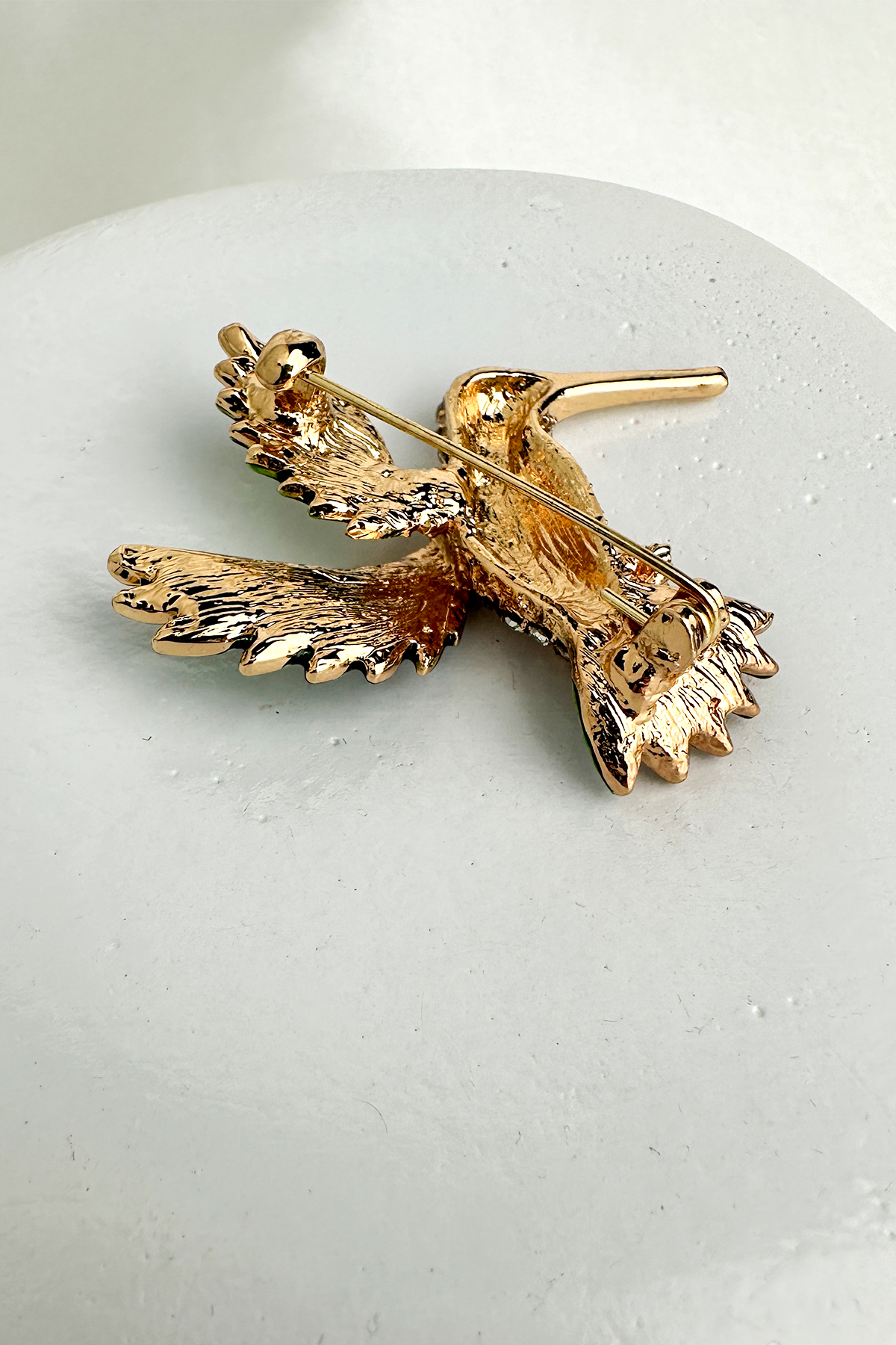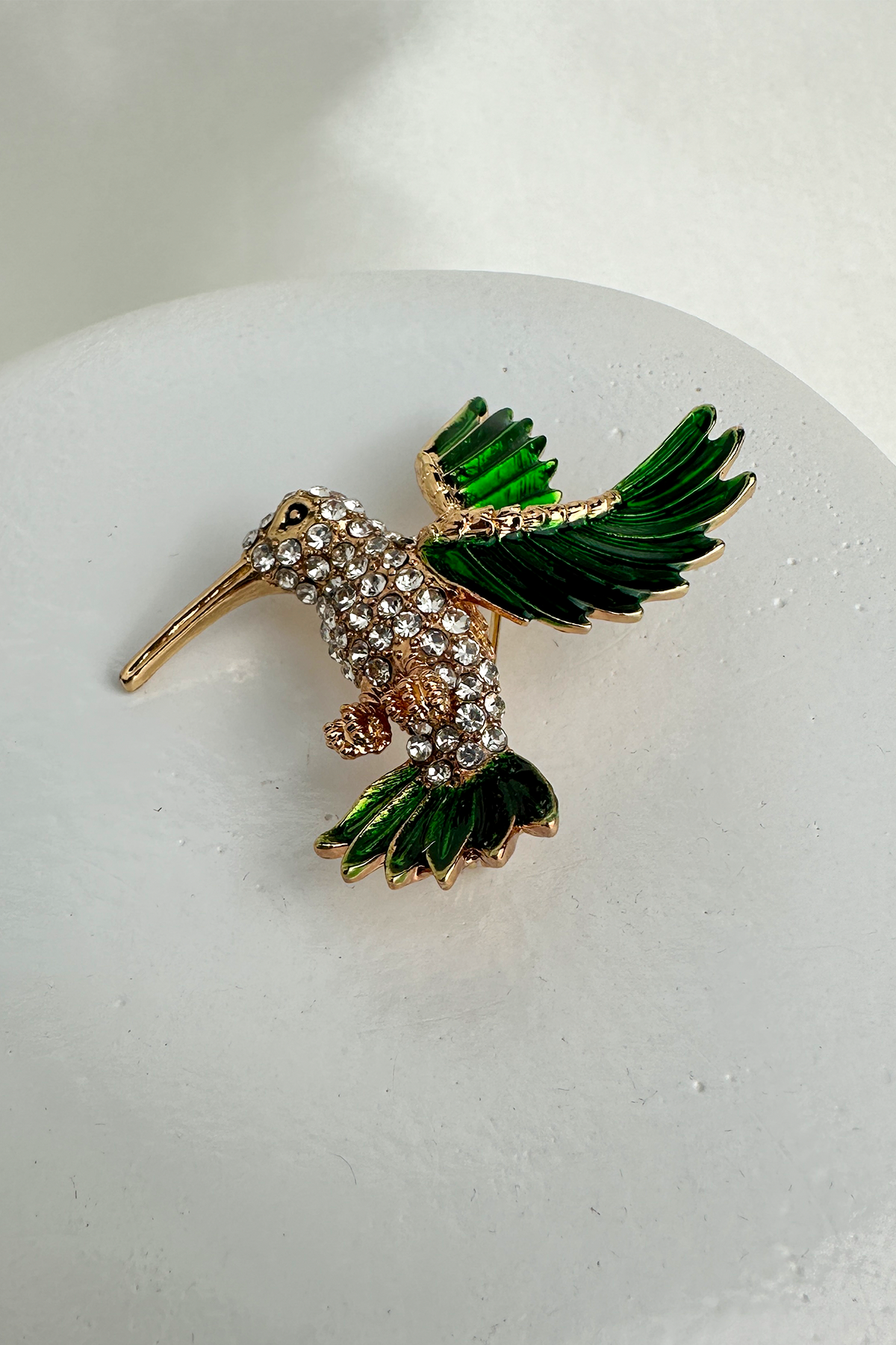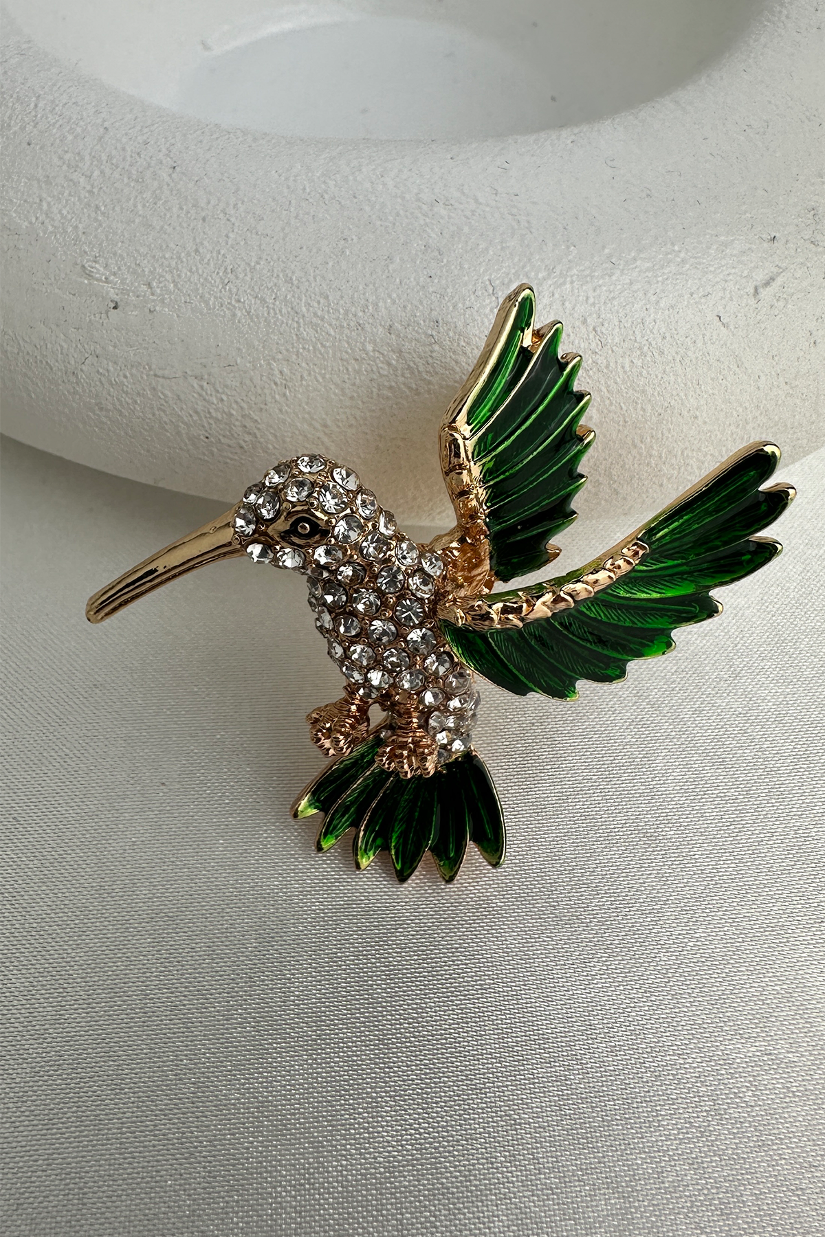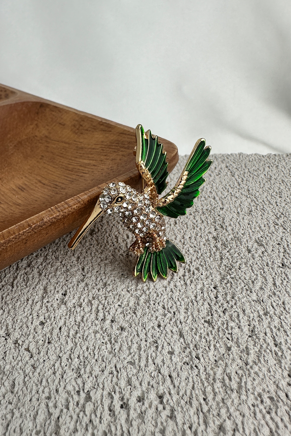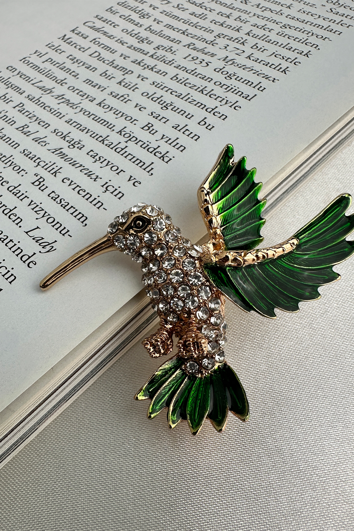 Doğanın en zarif kuşlarından ilham alınarak tasarlanan Altın Rengi Taş Detaylı Sinek Kuşu Broş, parıltılı taş süslemeleri ve ışıltılı altın rengiyle stilinize sofistike bir hava katıyor. 4 cm’lik kompakt boyutuyla hem sade hem de göz alıcı bir aksesuar arayanlar için ideal.