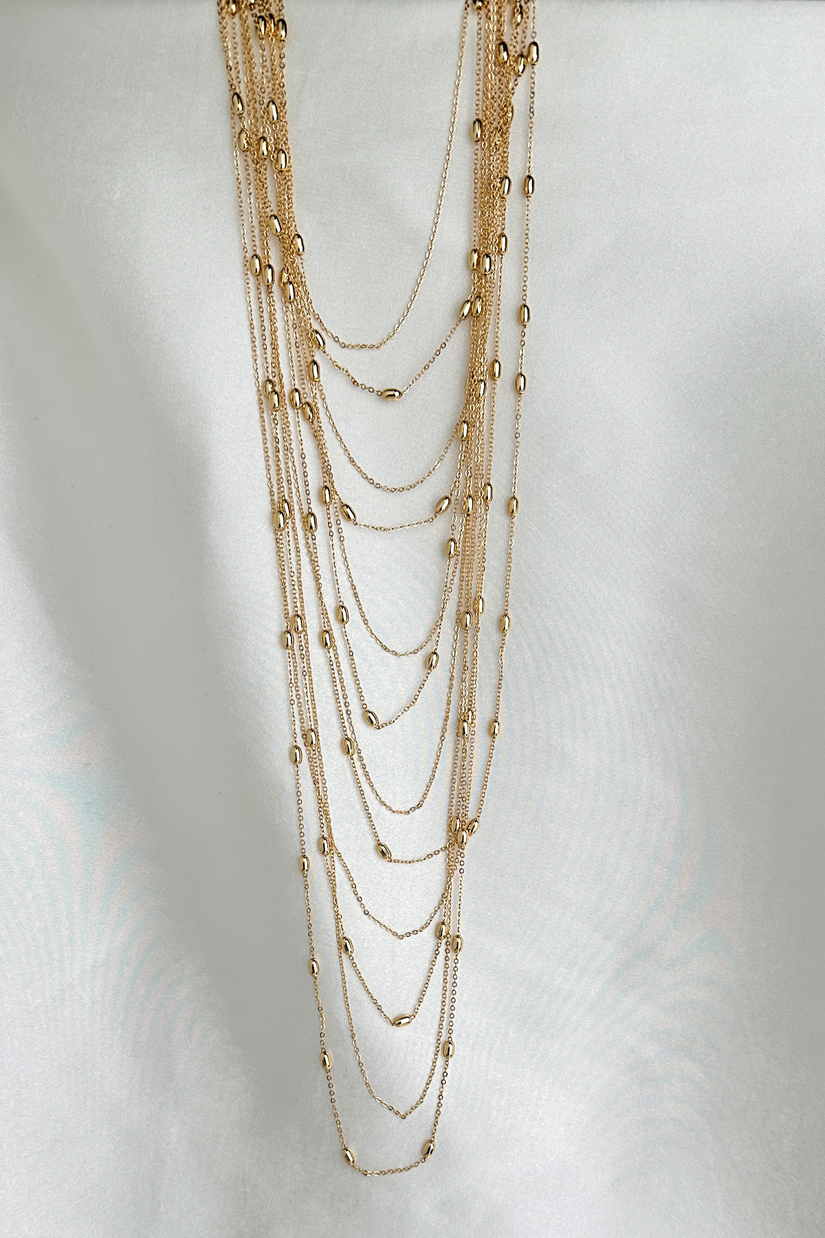 Şıklığın merkezinde yer almak isteyenler için özel olarak tasarlanan Altın Rengi Topçuk Detaylı Çok Katlı Zincir Kolye, göz alıcı detayları ve çok katlı yapısıyla stilinize güçlü bir dokunuş katıyor.