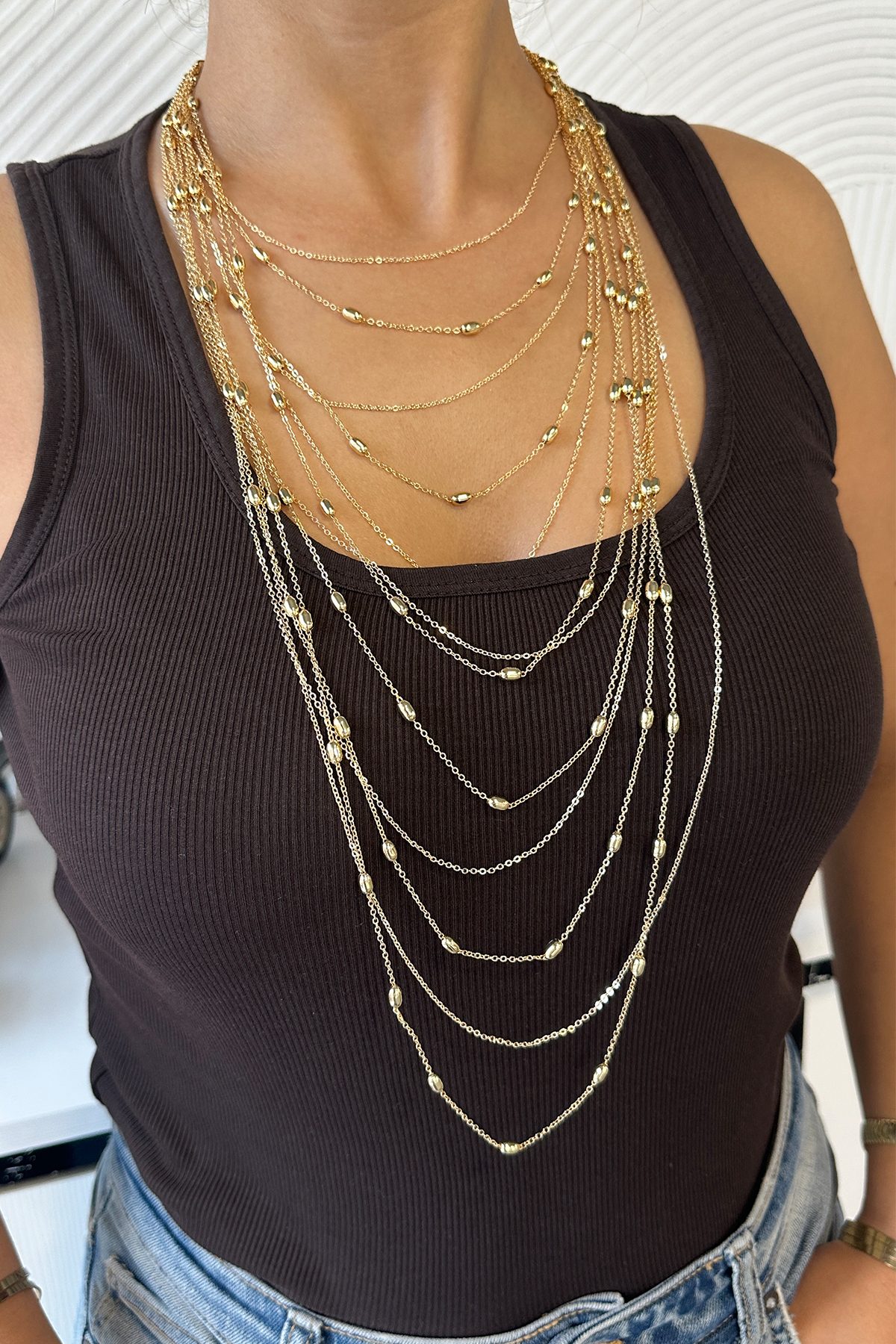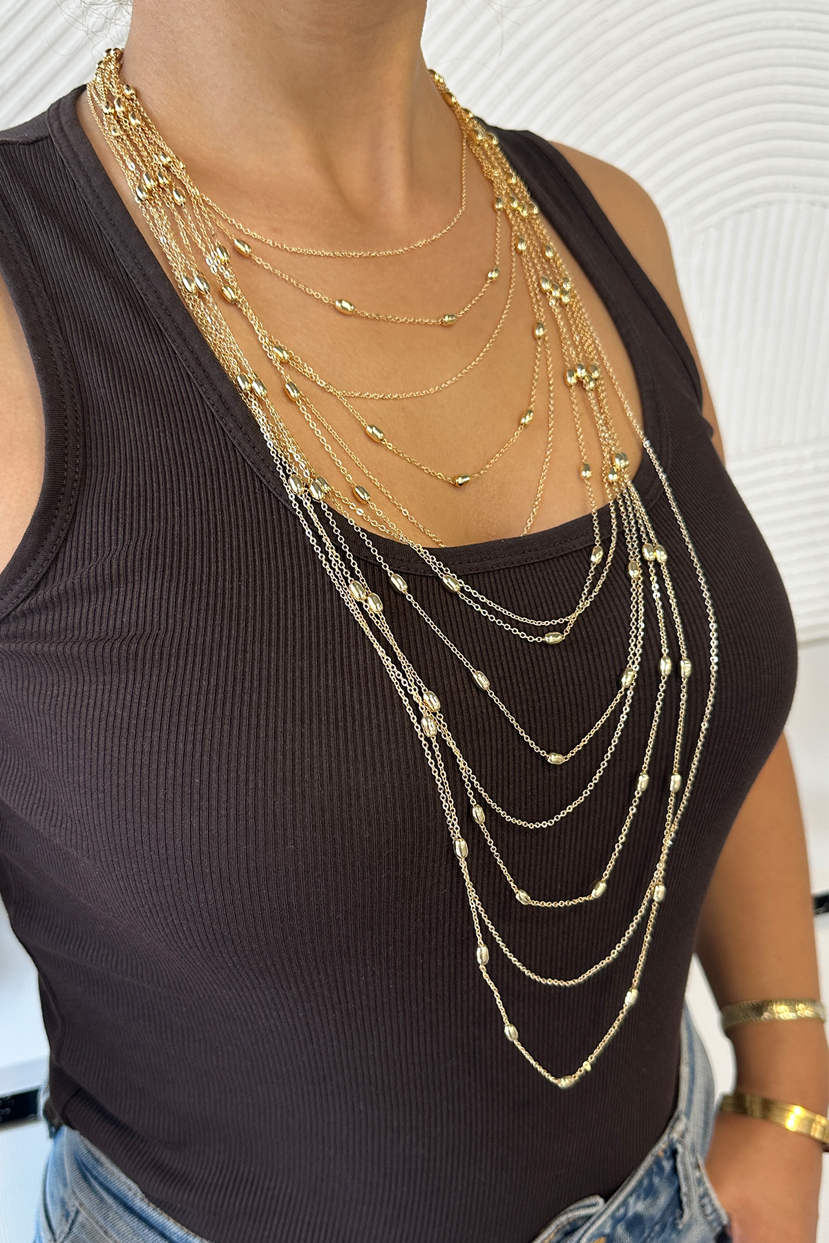 40 cm’den 95 cm’ye kadar uzanan farklı uzunluklardaki zincir katmanları, boyun hattınıza hacim ve derinlik kazandırırken; zincir üzerindeki topçuk detaylar, hareket ettikçe ışığı yansıtarak etkileyici bir parıltı sunar.