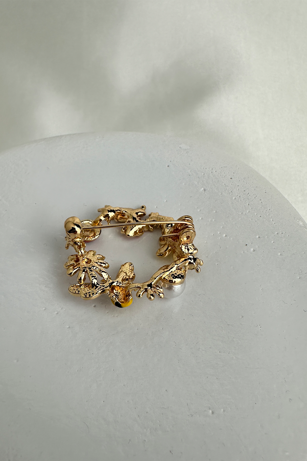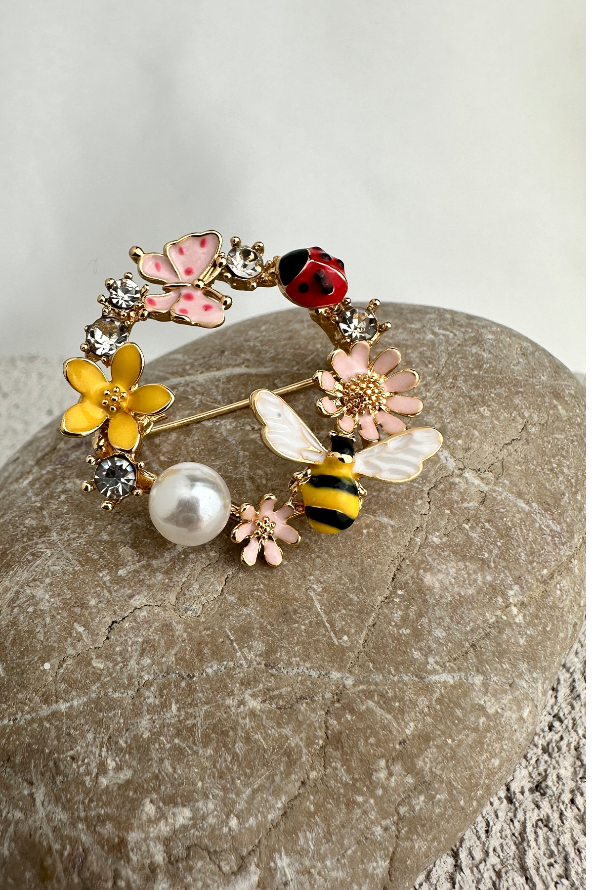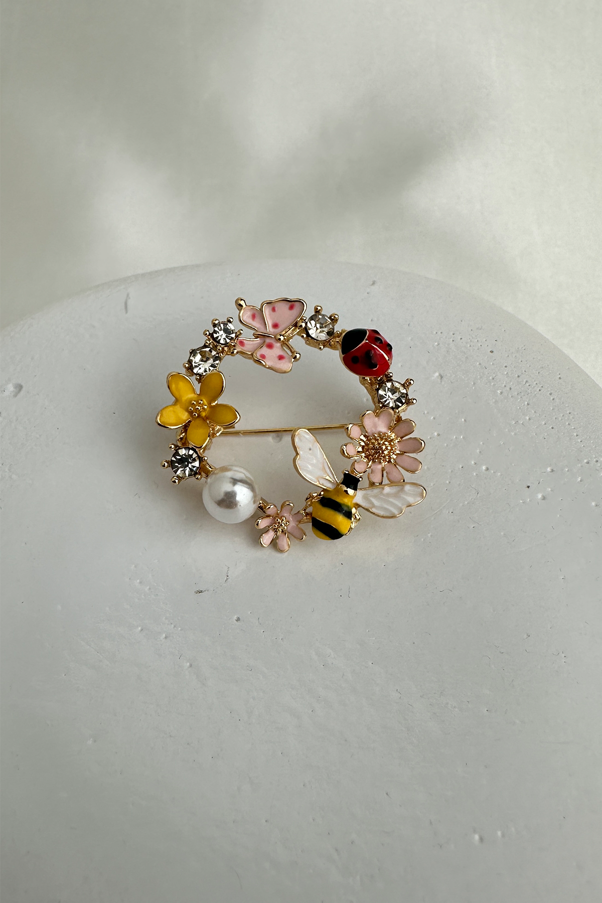 Altın rengi zarif çelenk formunun üzerinde yer alan uğur böceği, kelebek ve arı detayları ile tasarlanan bu özel broş, doğanın enerjisini ve neşesini yansıtan göz alıcı bir aksesuar. 3 cm’lik ideal boyutu sayesinde hem günlük hem de özel gün kombinlerinize zarif bir dokunuş katar.