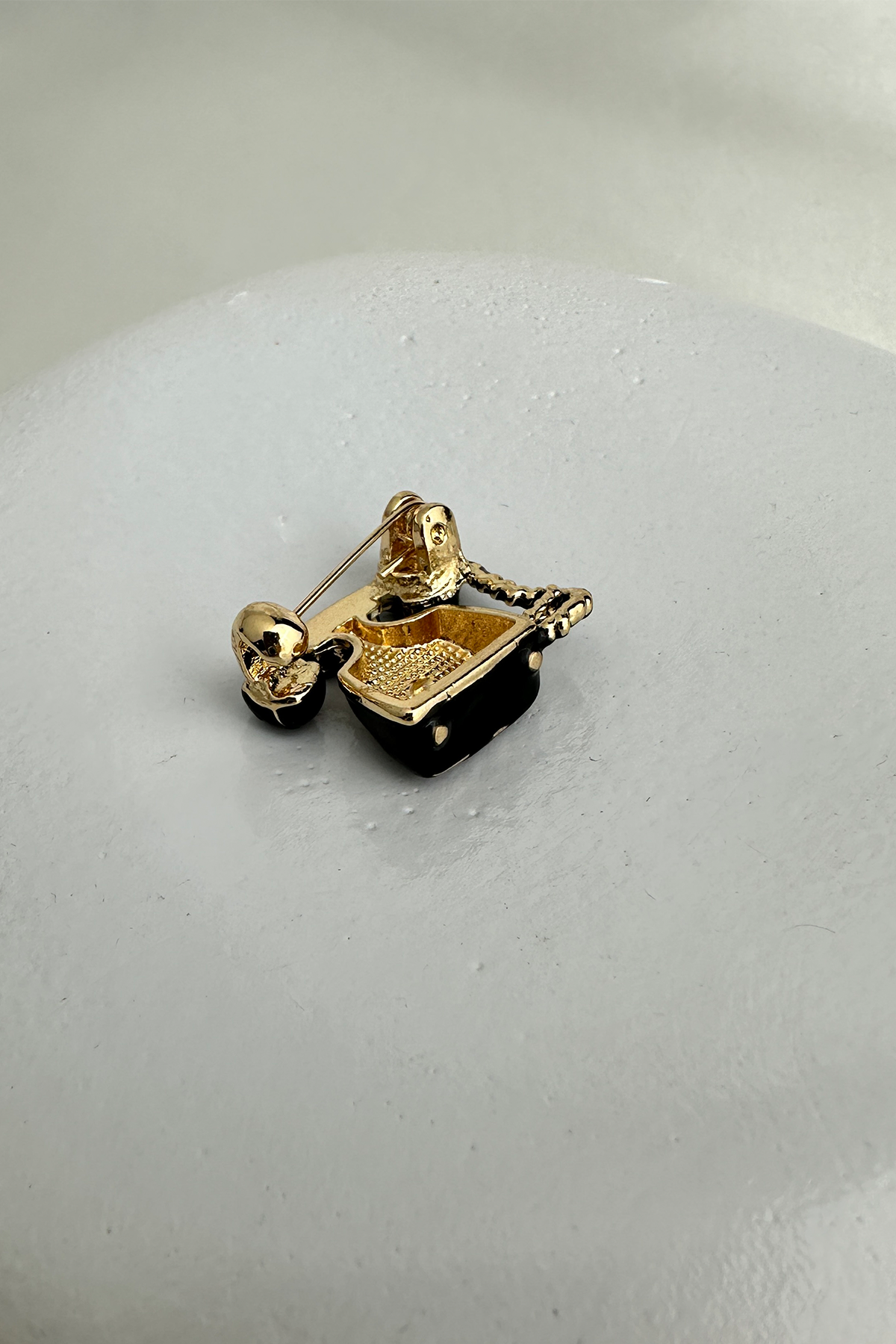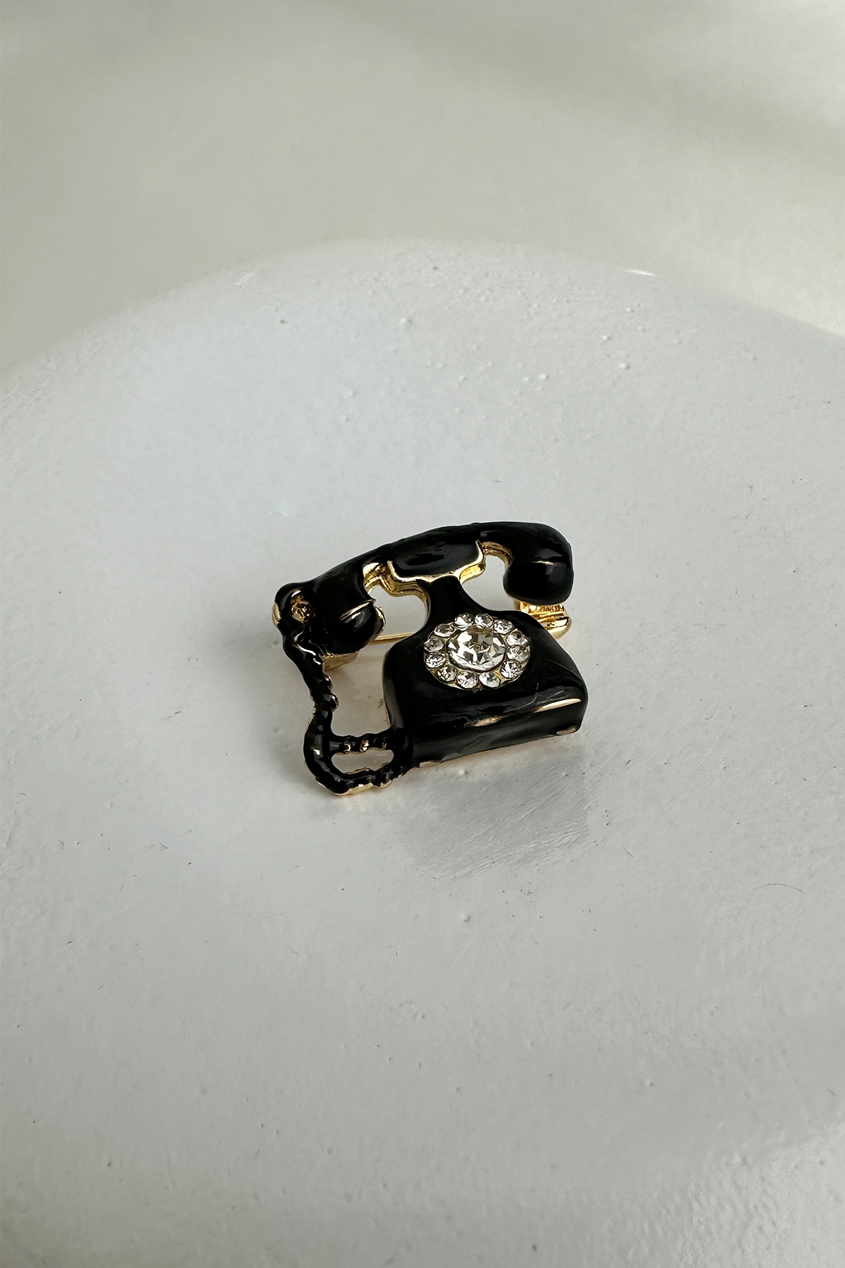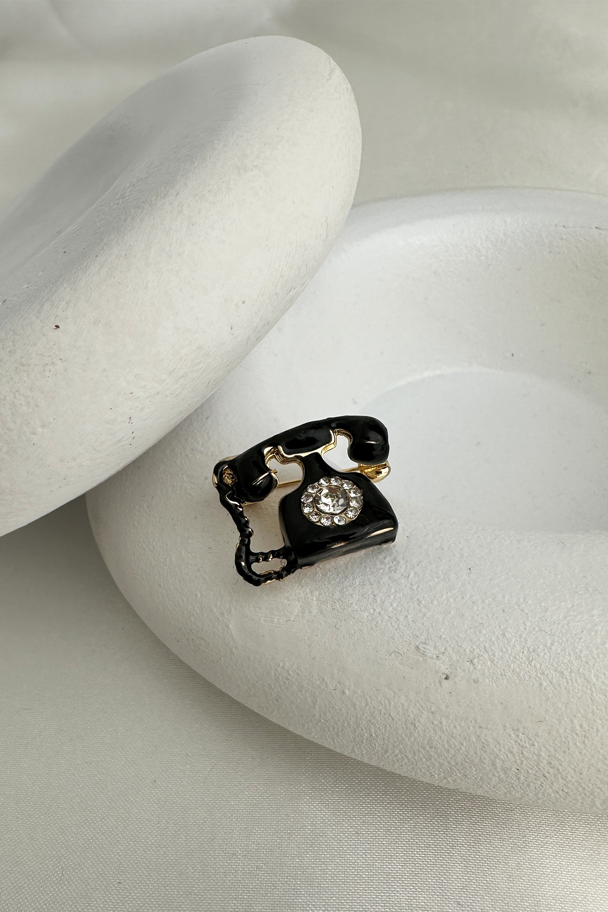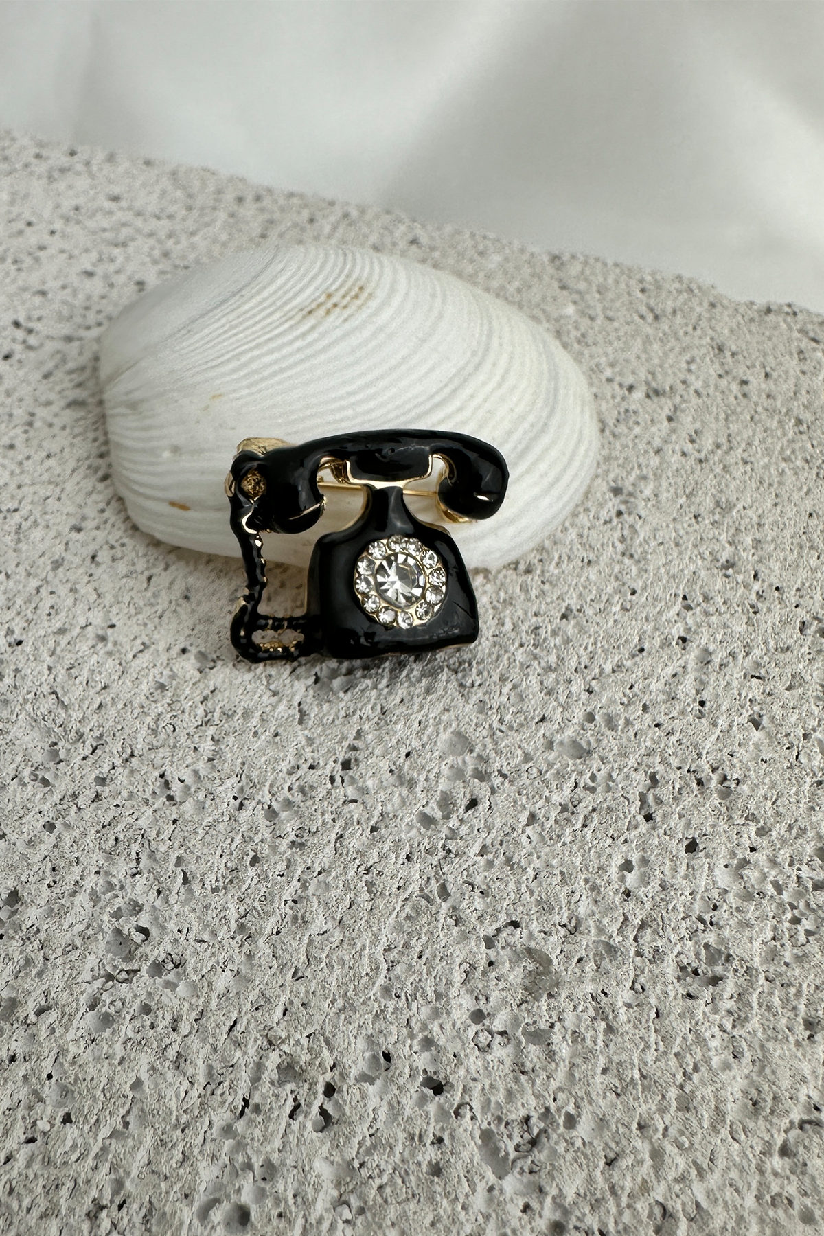 Altın sarısı metal üzerine siyah mineli detaylar ve ışıltılı taş süslemeleriyle tasarlanan bu telefon figürlü broş, küçük boyutuna rağmen stilinize sofistike bir dokunuş katıyor. Modern ve klasik çizgilerin birleştiği bu aksesuar, günlük kombinlerinizi tamamlamak için ideal.