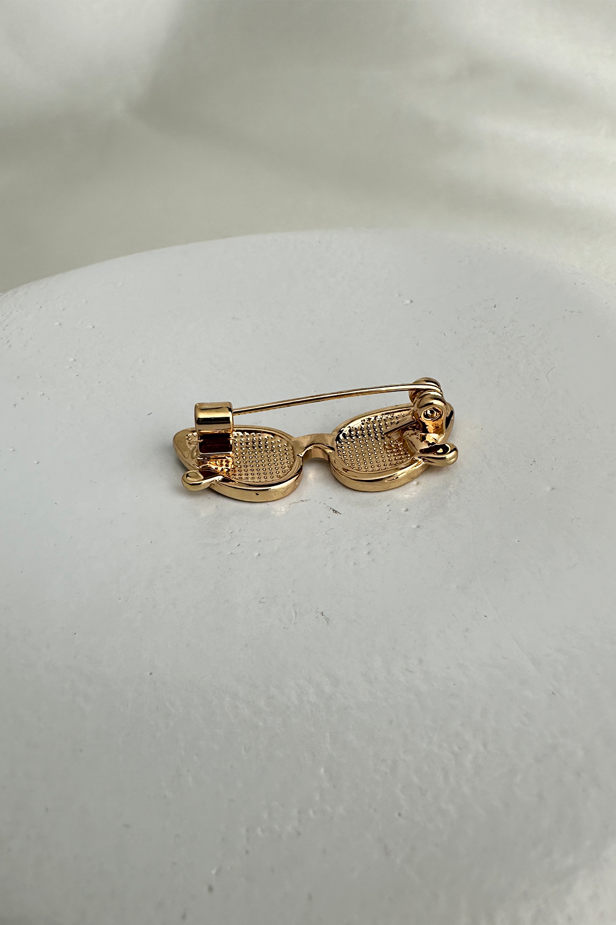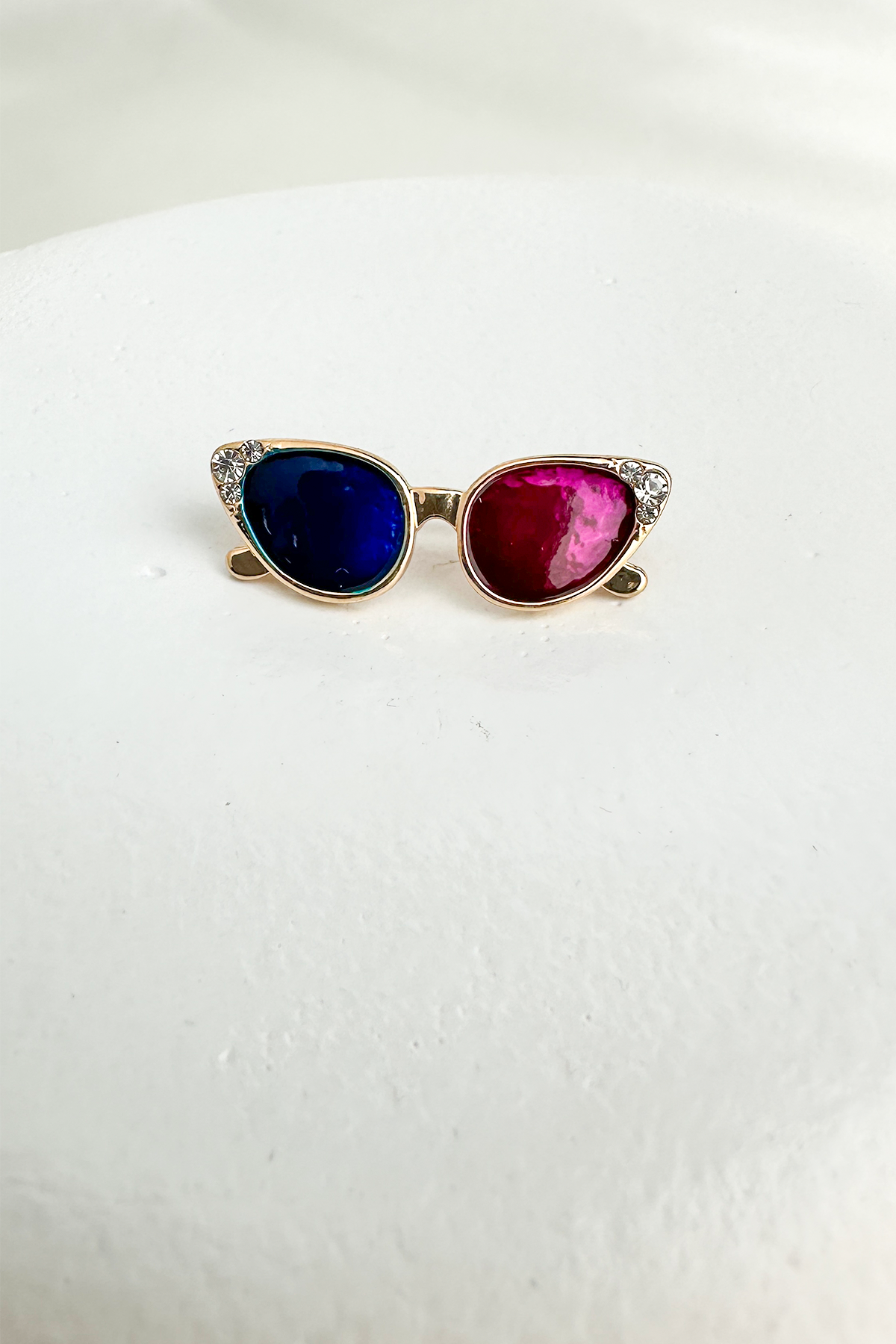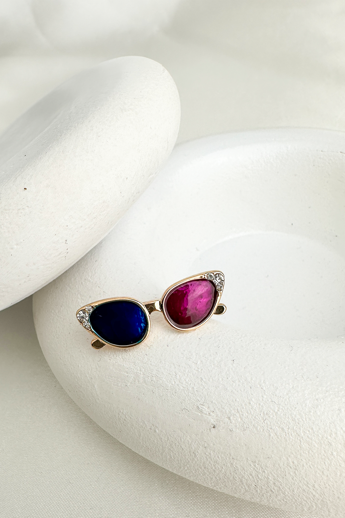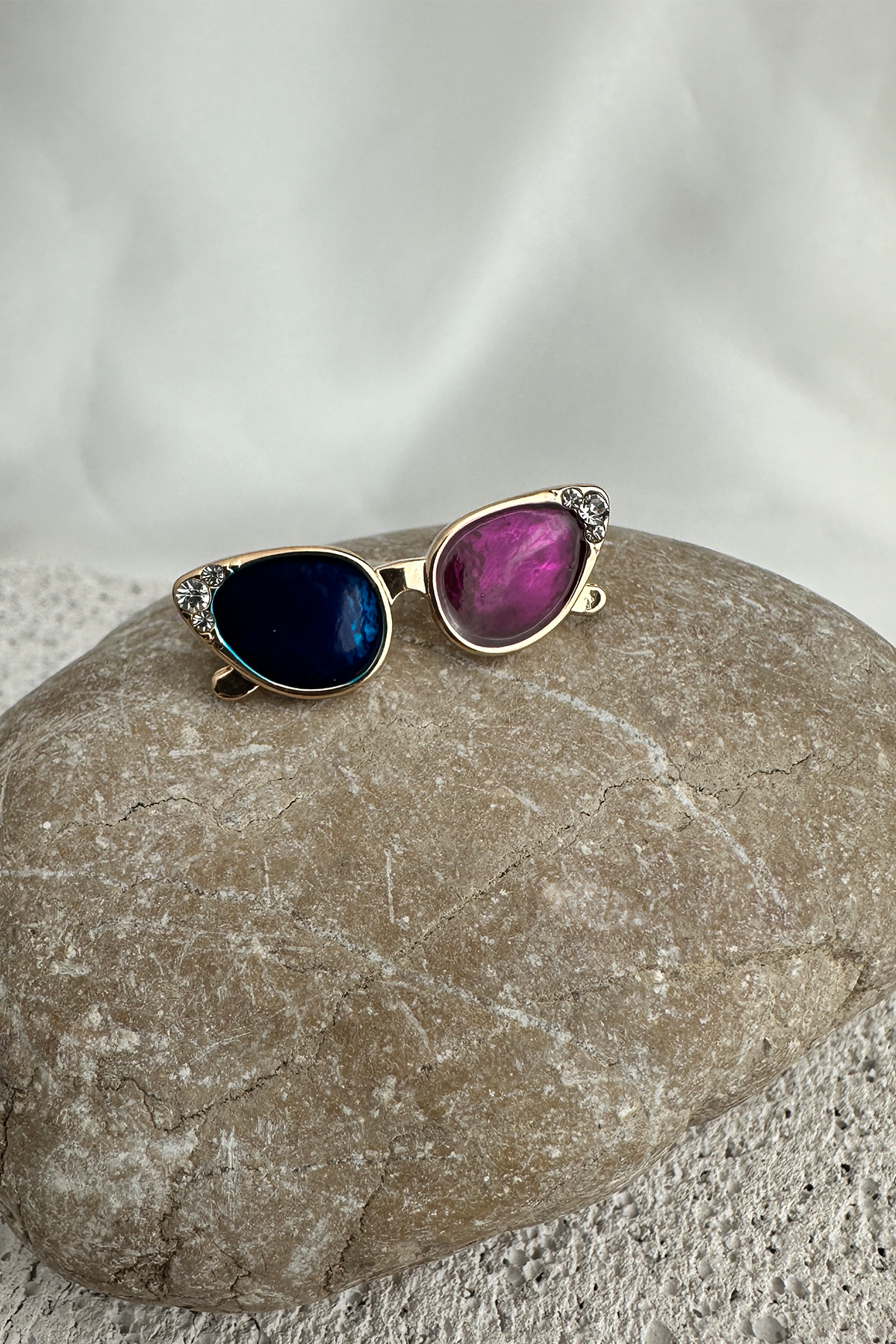 Bu eğlenceli ve stil sahibi broş, gözlük formundaki sıradışı tasarımıyla fark yaratıyor. Altın sarısı metal gövdesiyle şık bir duruş sergilerken, cam kısmındaki canlı renk detayları ve zarif taş süslemeleriyle modern bir görünüm sunuyor. Küçük boyutuna rağmen güçlü bir stil ifadesi yaratmak isteyenler için ideal.