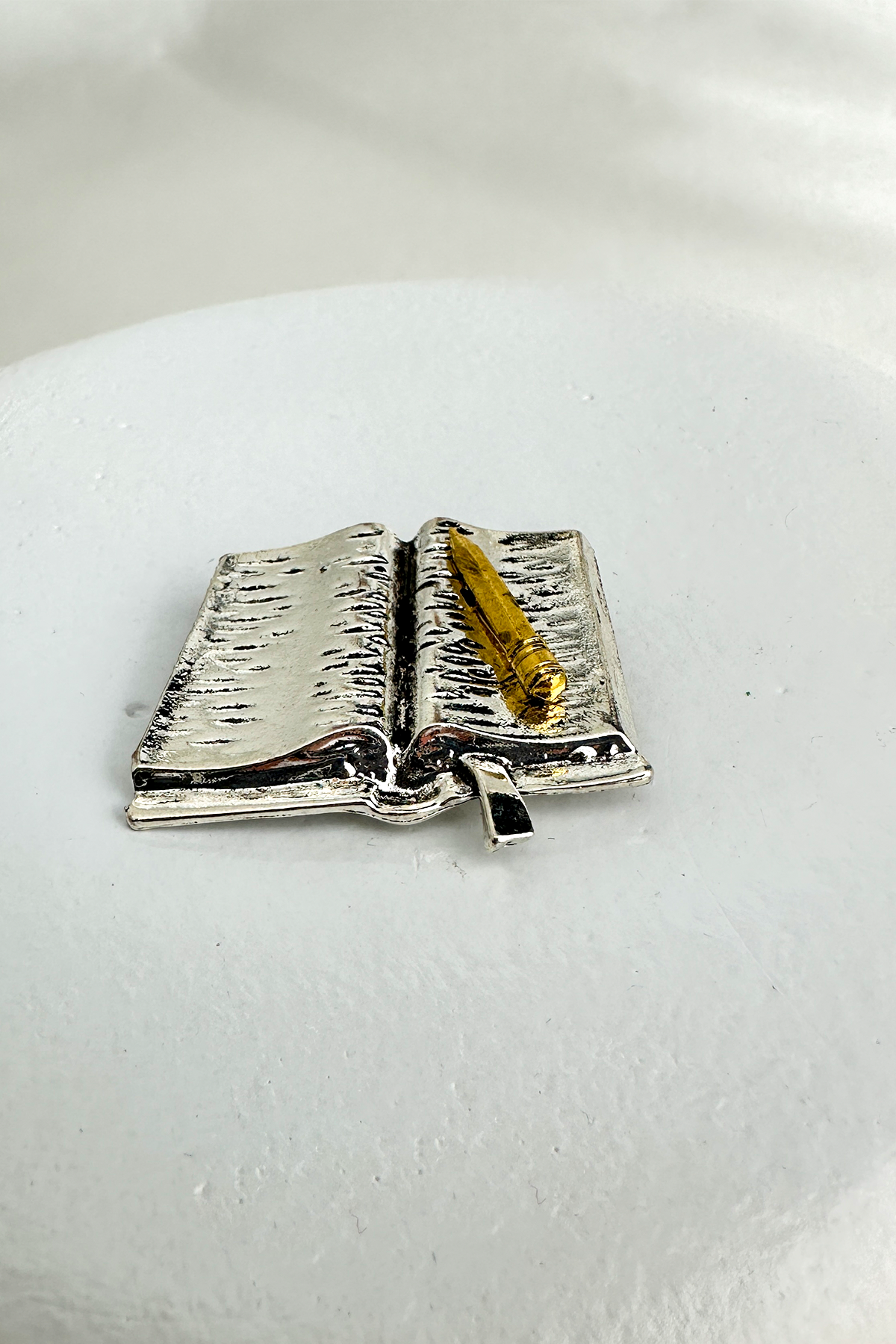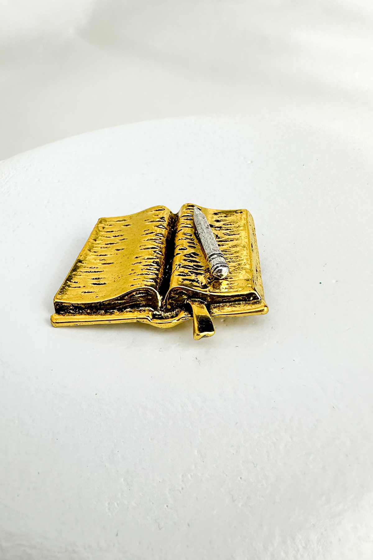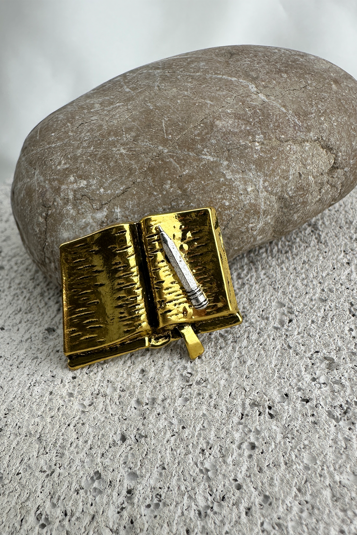 Kalem ve defter figürleriyle tasarlanan bu zarif broş; yazmayı, öğrenmeyi ve üretmeyi sevenler için özel olarak tasarlandı. Altın tonlu detayları ve minik figüratif dokunuşlarıyla sade ama anlam yüklü bir aksesuar sunar. Öğretmenler, yazarlar, öğrenciler ya da kalemi elinden düşürmeyen herkes için anlamlı bir seçim!