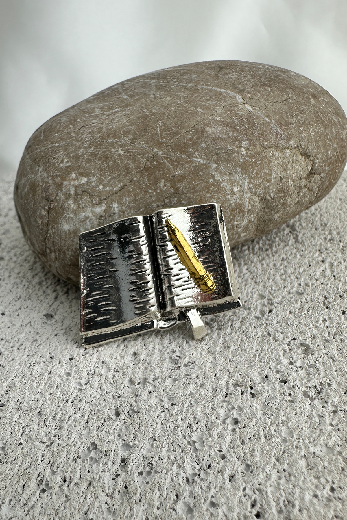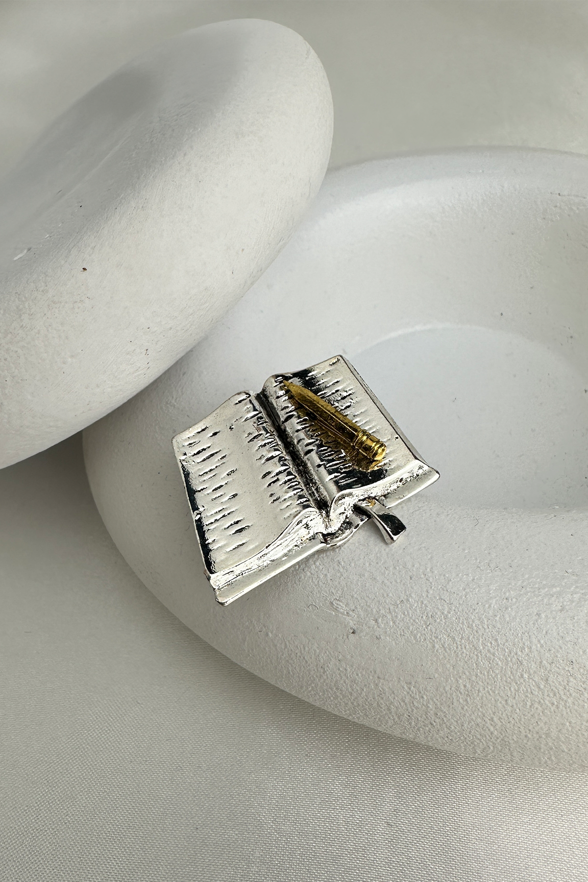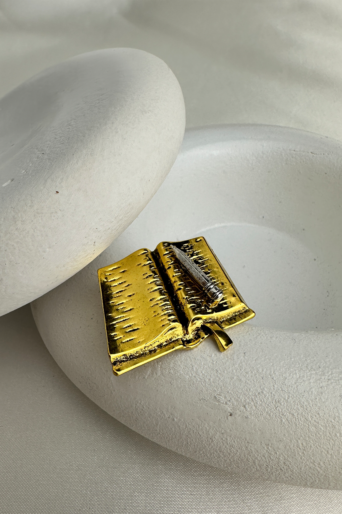 Kalem ve defter figürleriyle tasarlanan bu zarif broş; yazmayı, öğrenmeyi ve üretmeyi sevenler için özel olarak tasarlandı. Altın tonlu detayları ve minik figüratif dokunuşlarıyla sade ama anlam yüklü bir aksesuar sunar. Öğretmenler, yazarlar, öğrenciler ya da kalemi elinden düşürmeyen herkes için anlamlı bir seçim!