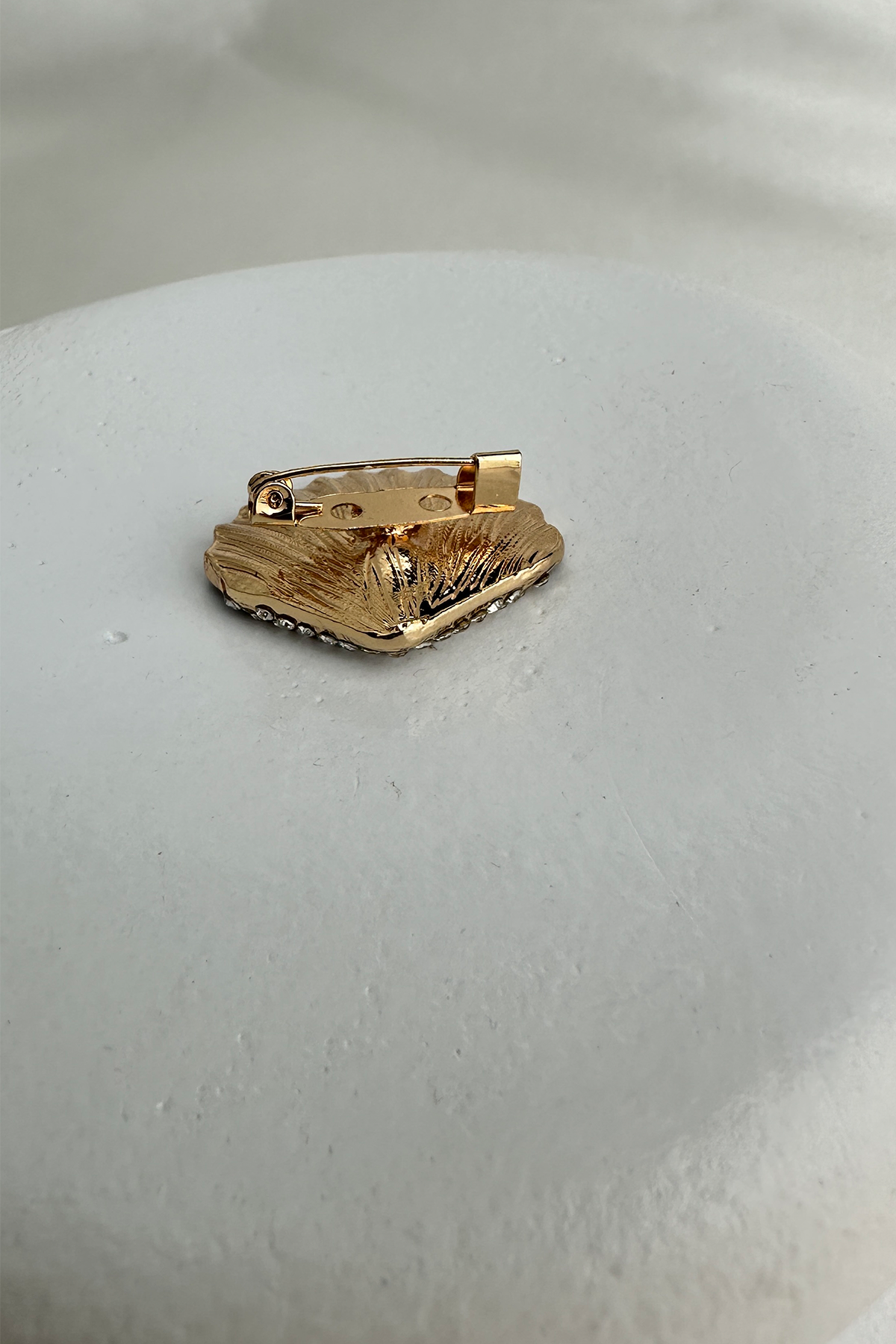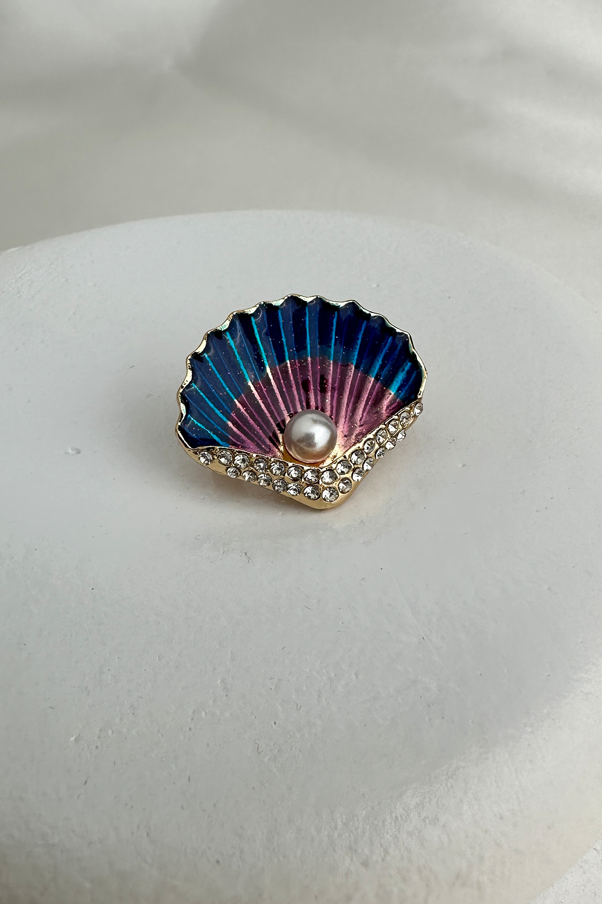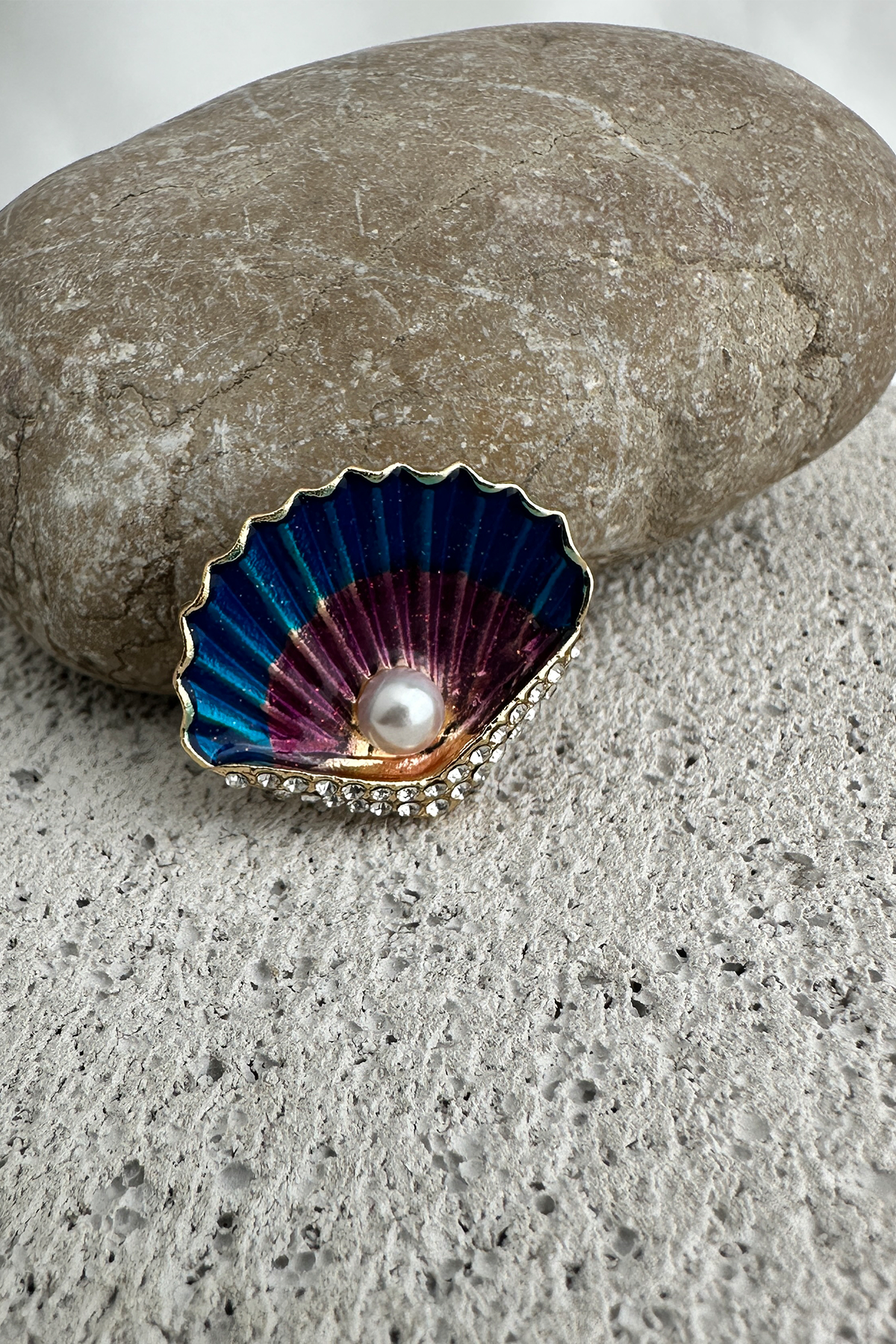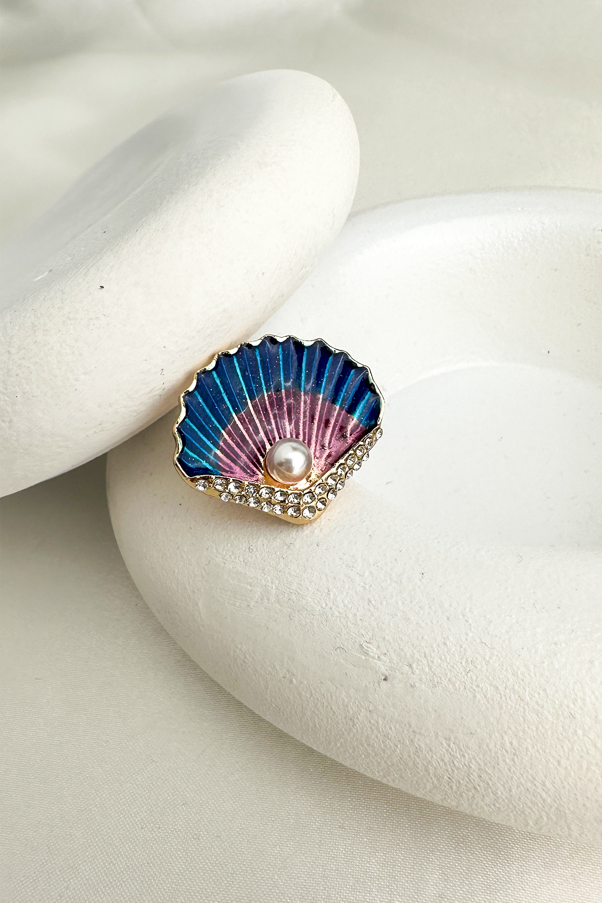 Deniz kabuğu formunda tasarlanan bu özel broş, doğallığın ve şıklığın kusursuz birleşimini yansıtıyor. Kabuk detaylarının ortasında zarif bir inci yer alırken, çevresindeki ışıltılı taş süslemeler tasarıma göz alıcı bir parıltı katıyor. Altın tonlarıyla tamamlanan bu parça, her stile zarif bir dokunuş sunar.