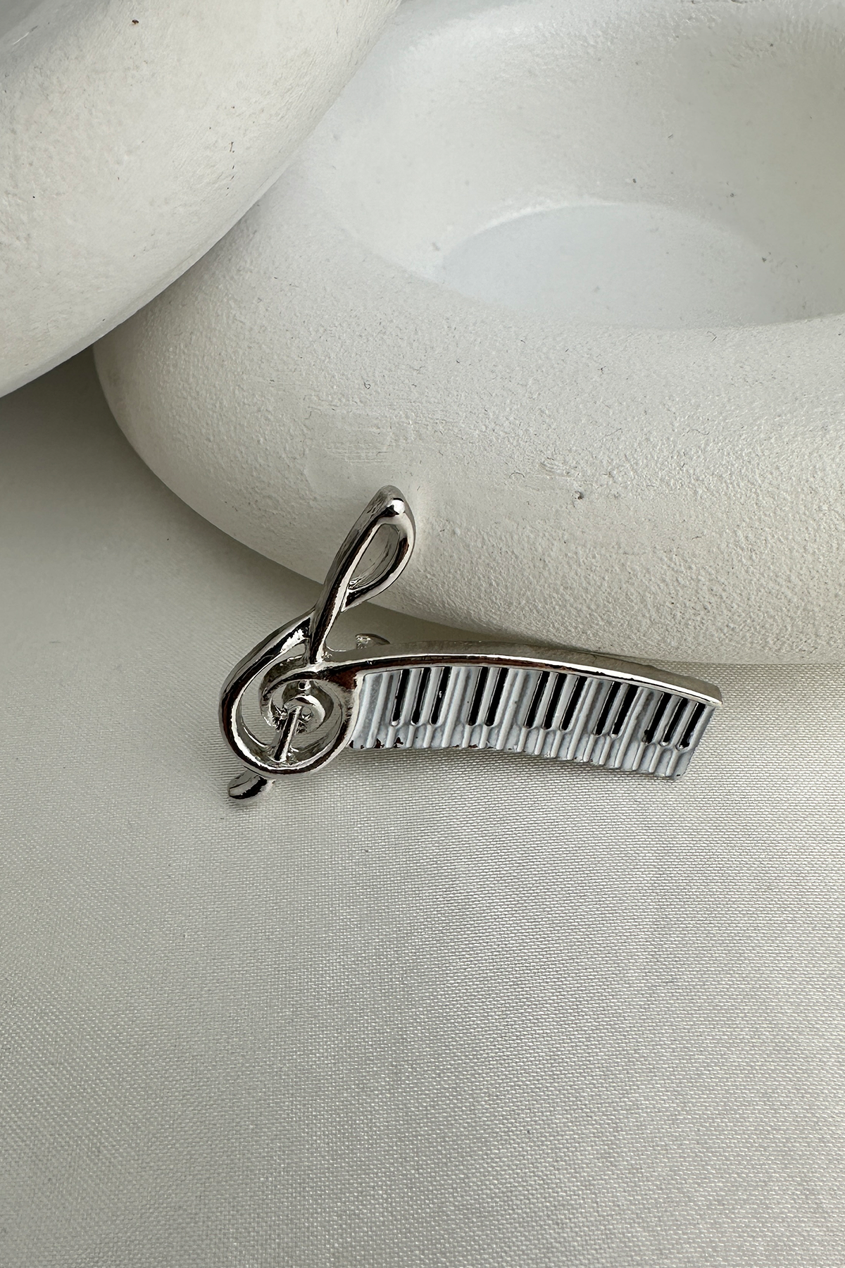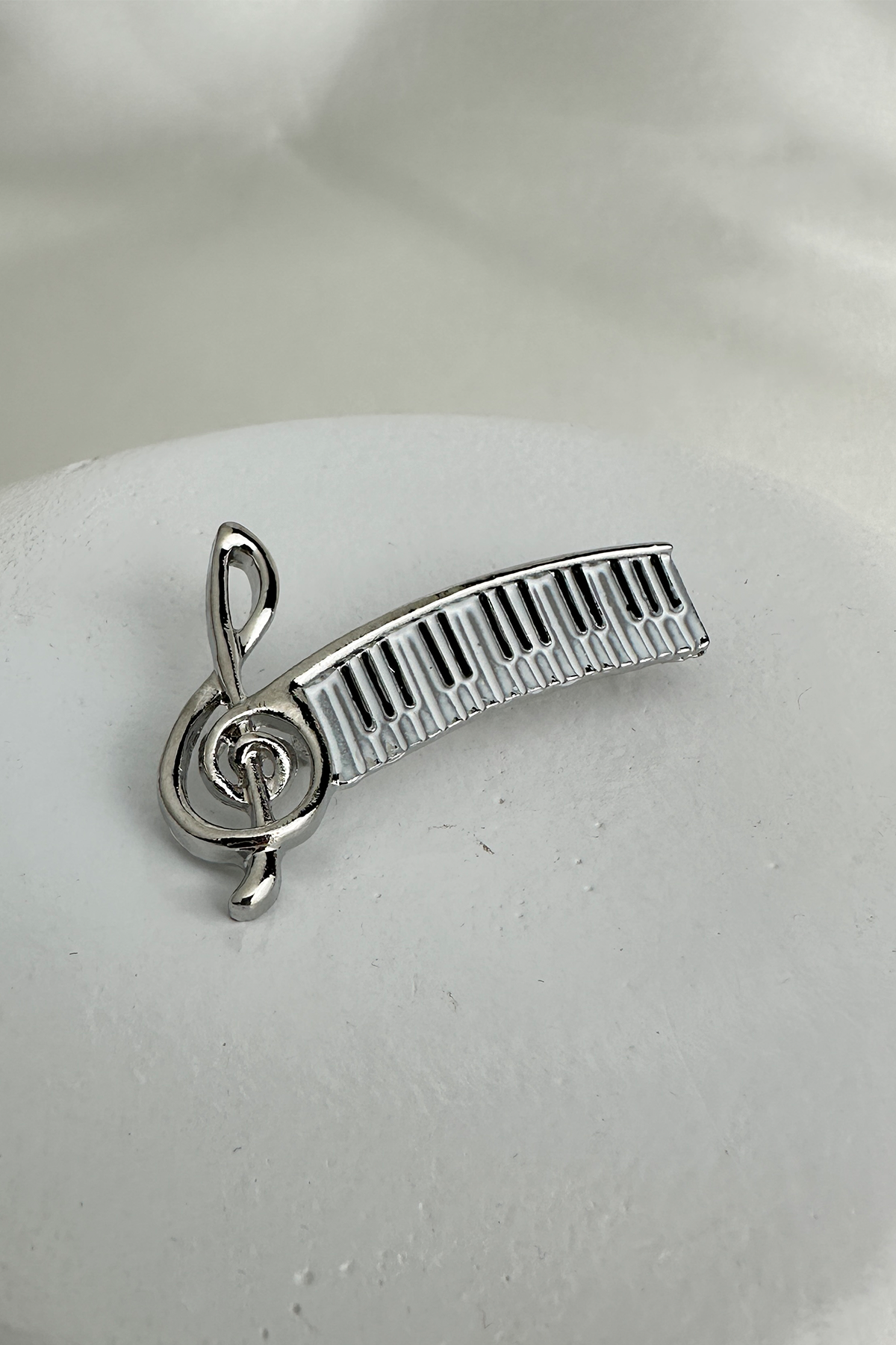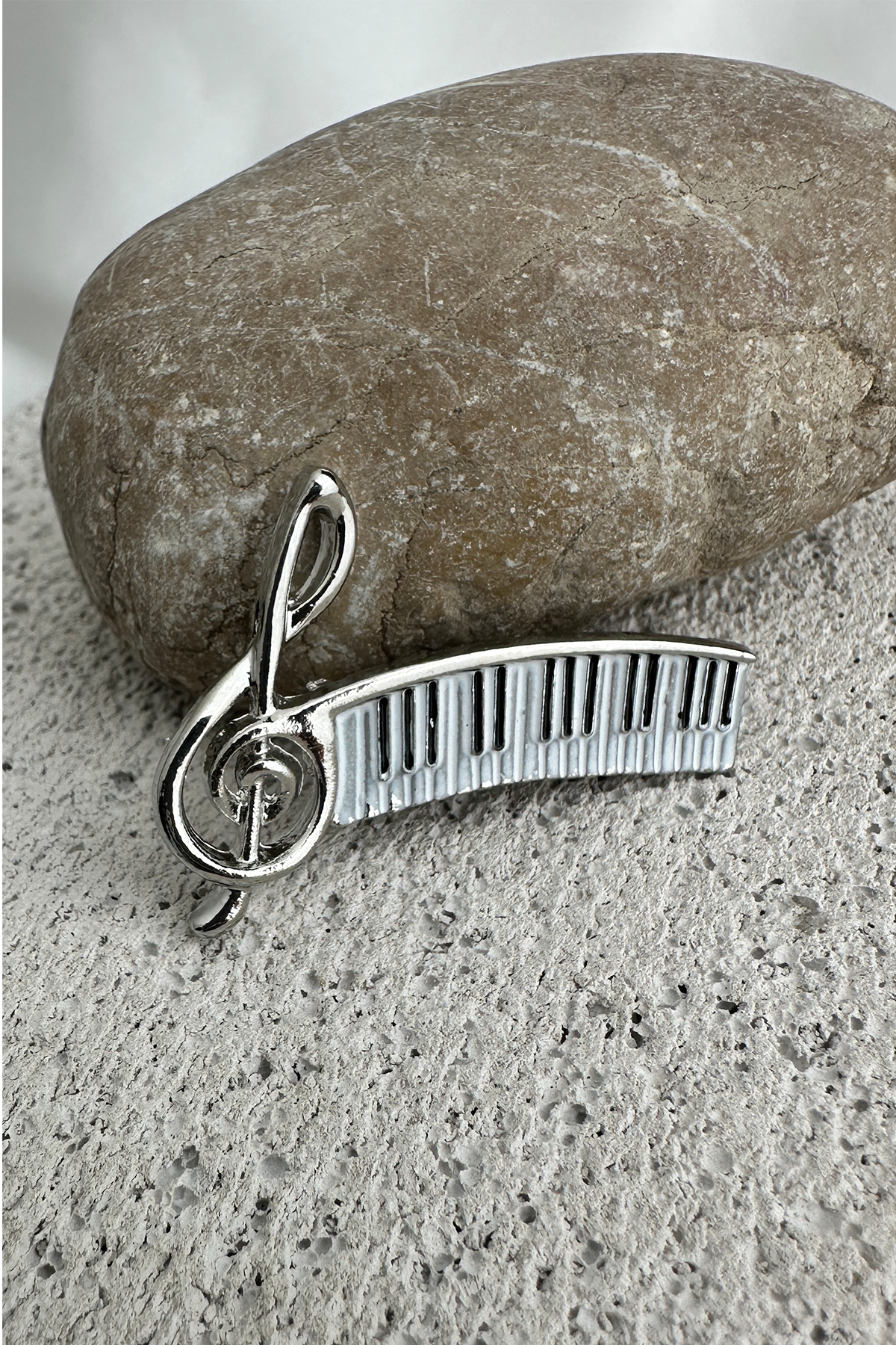 Piyano formunda tasarlanan bu şık broş, gümüş rengin asil ışıltısıyla ve müzik notası detaylarıyla dikkat çekiyor. Zarif çizgileri ve ince işçiliğiyle hem klasik hem modern görünümlere uyum sağlayan bu özel parça, müzik tutkusunu şıklıkla ifade etmenin en zarif yollarından biri.