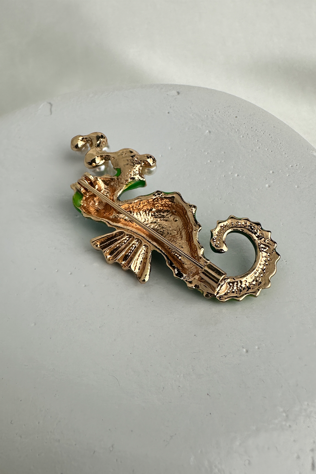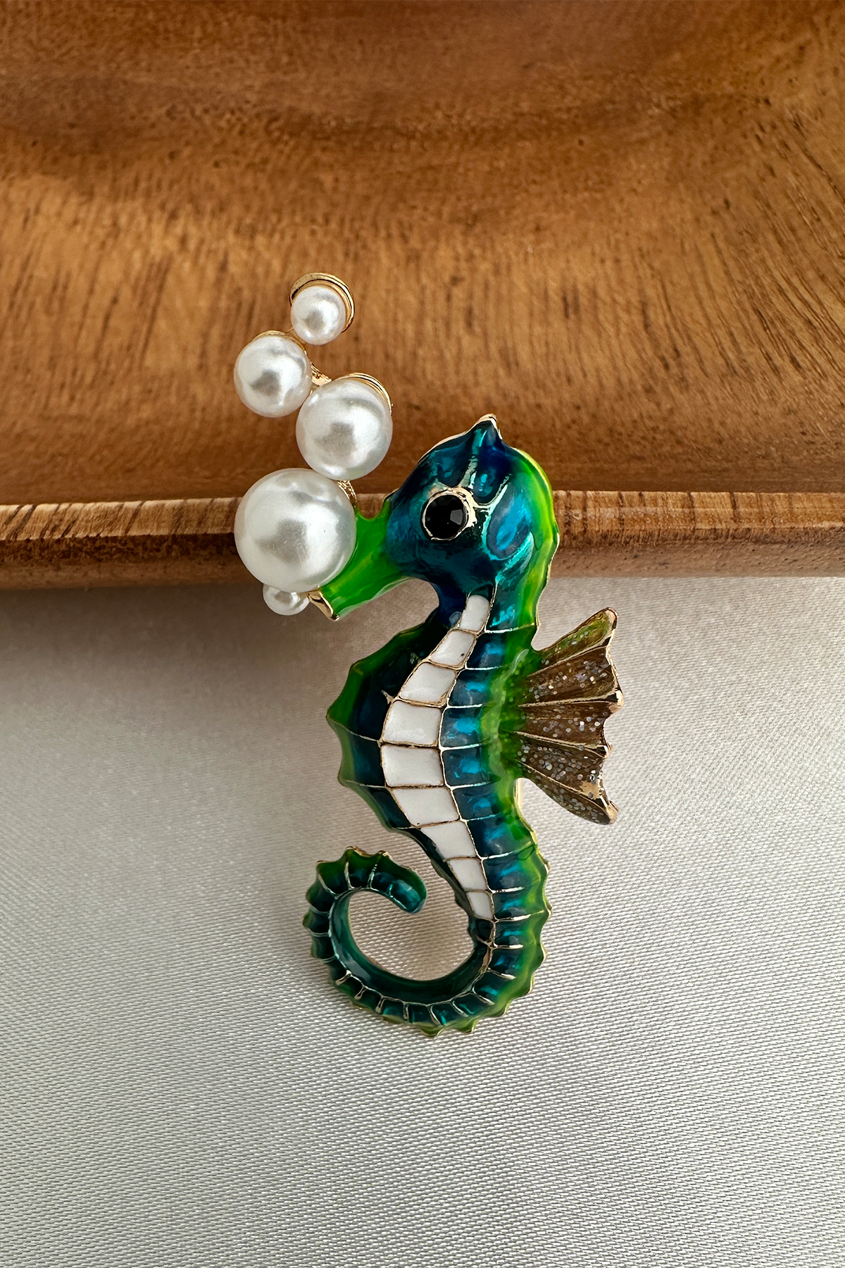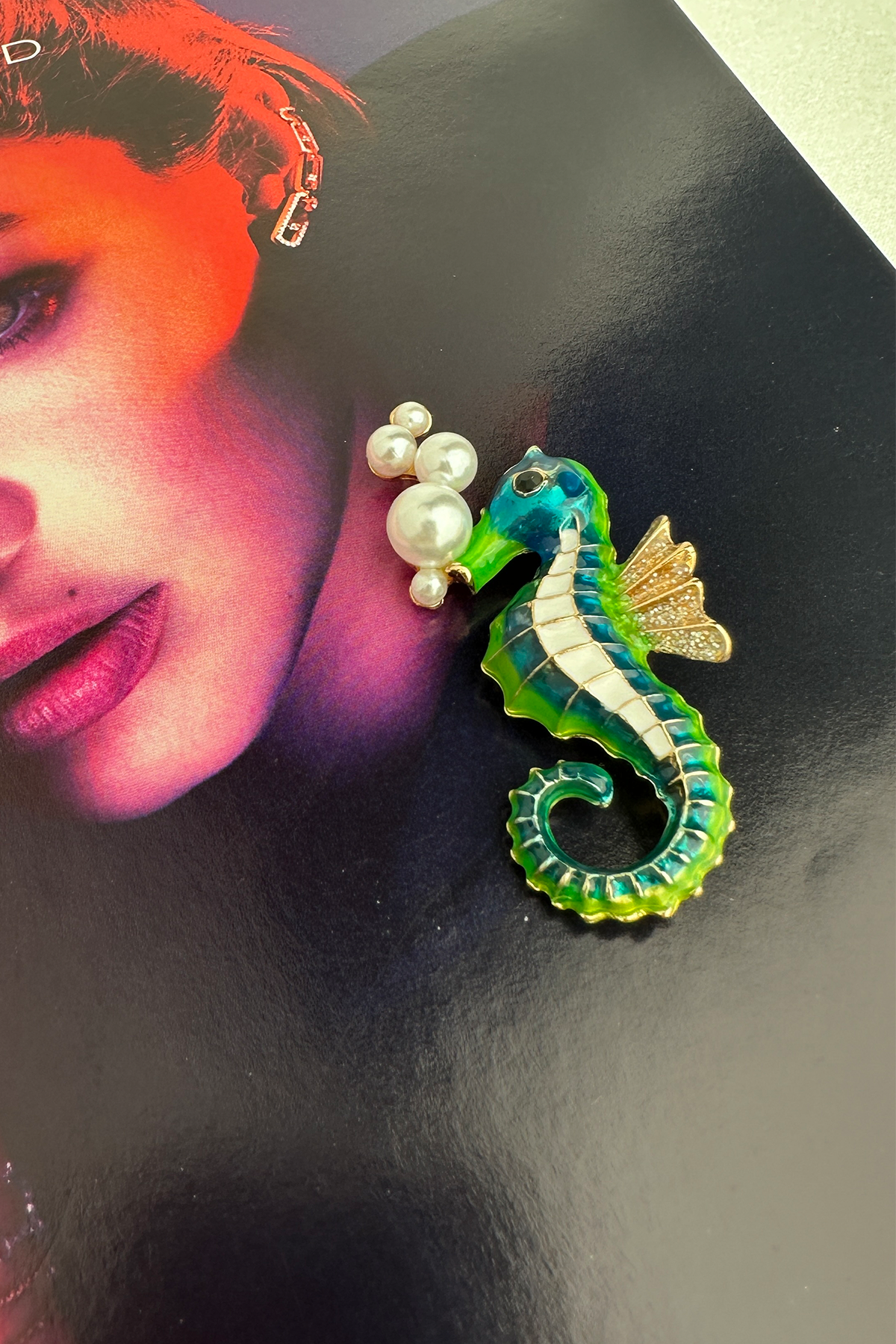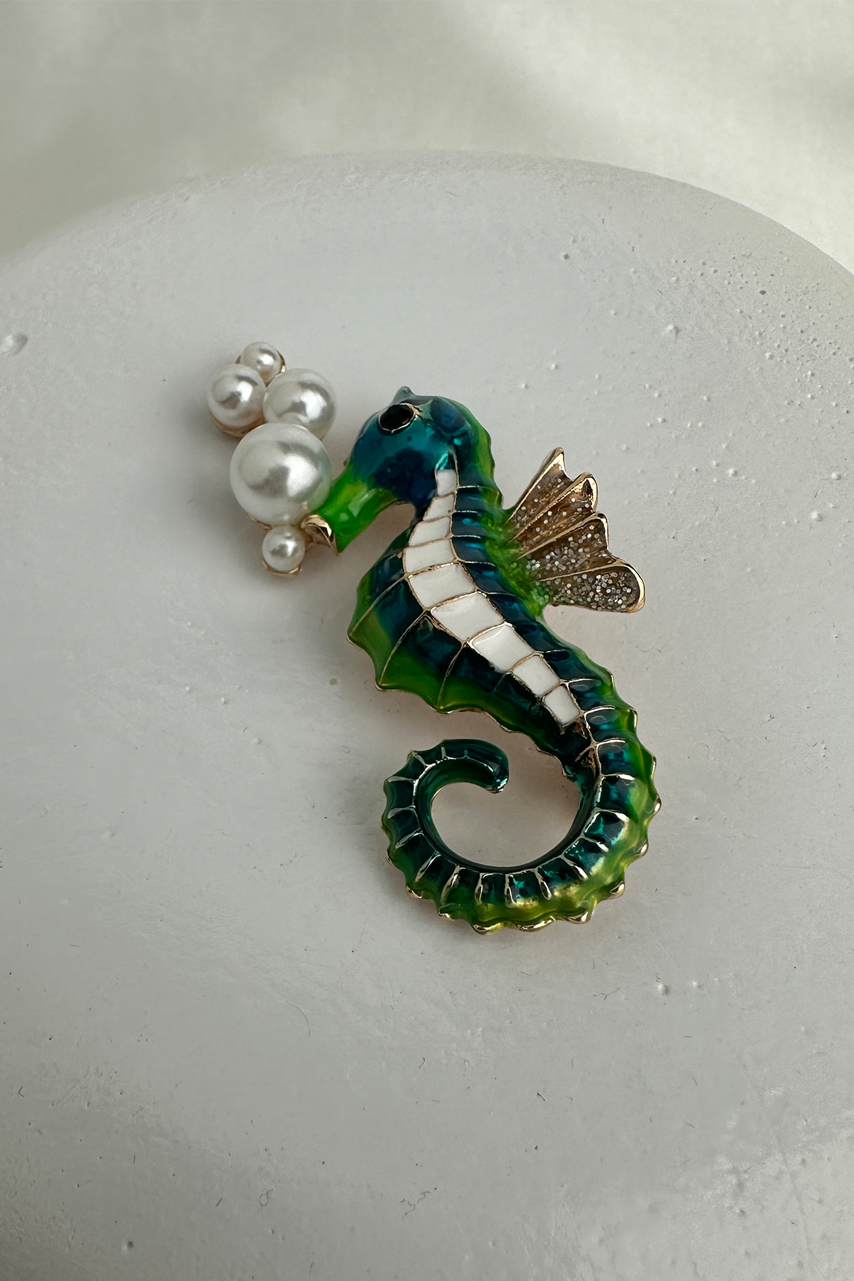 Denizlerin zarif simgesi deniz atı, bu eşsiz broş tasarımıyla stilinize hayat veriyor! Göz alıcı yeşil tonları ve zarif inci detayıyla tasarlanan bu deniz atı broş, hem şık hem de doğal bir görünüm sunuyor.