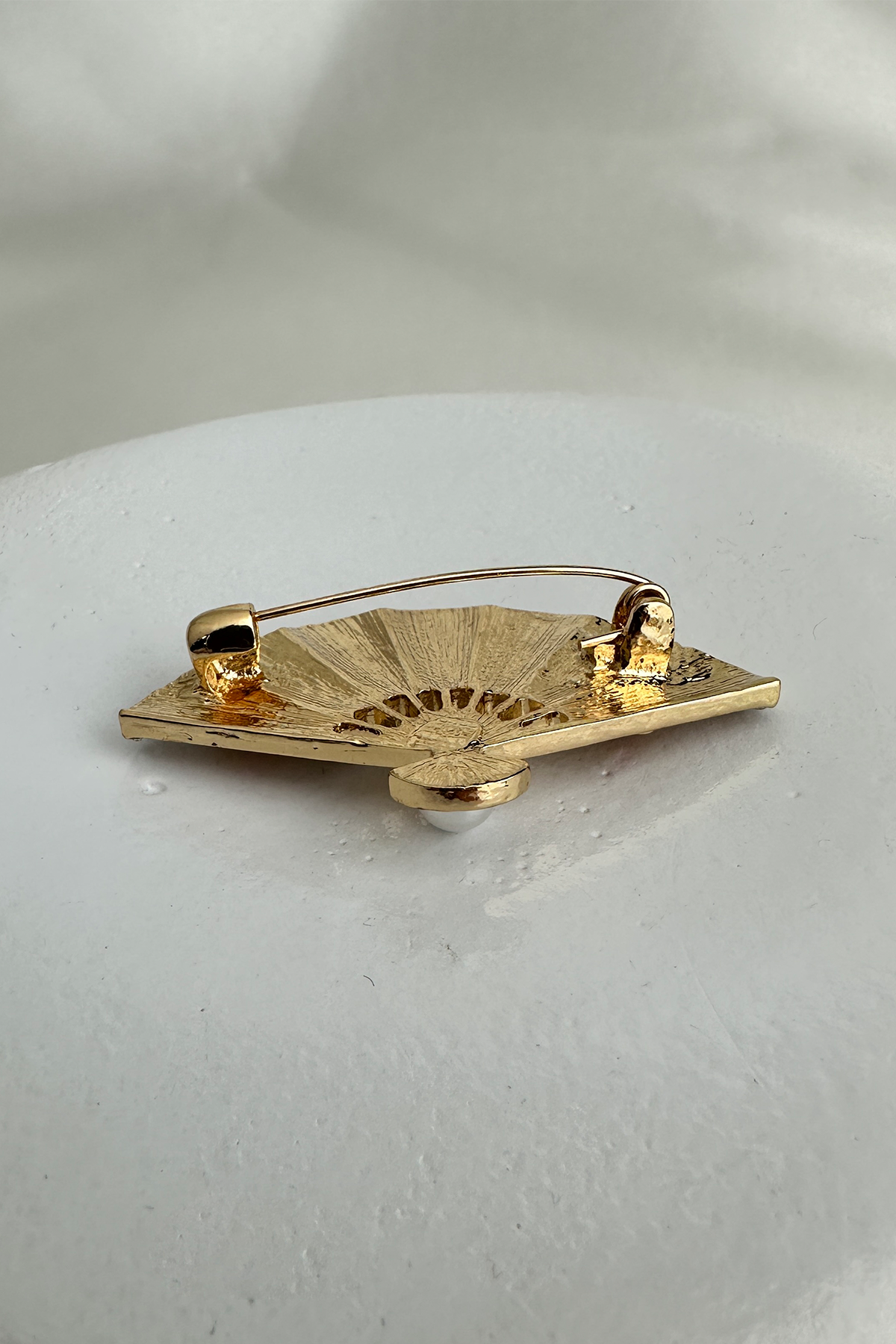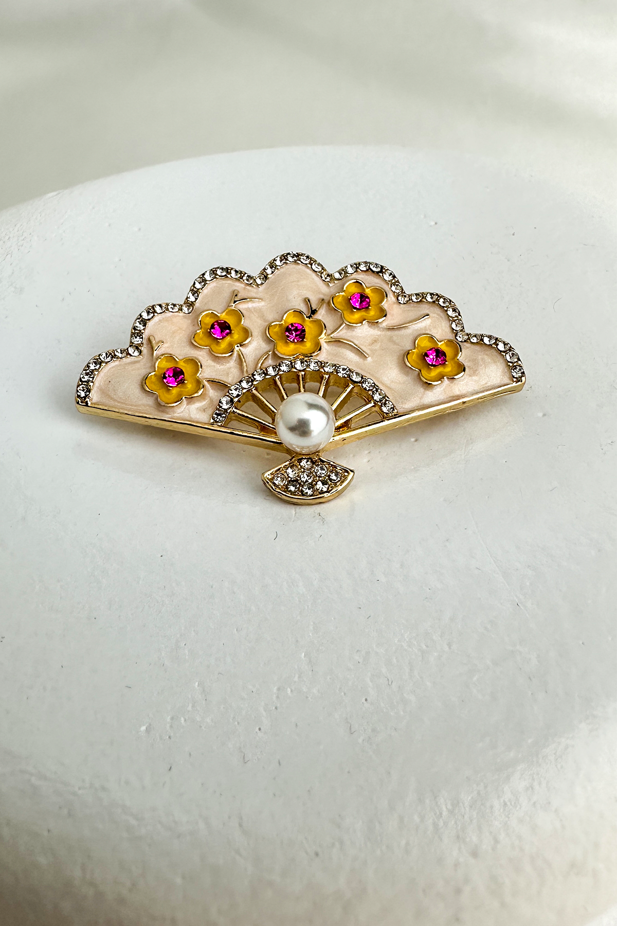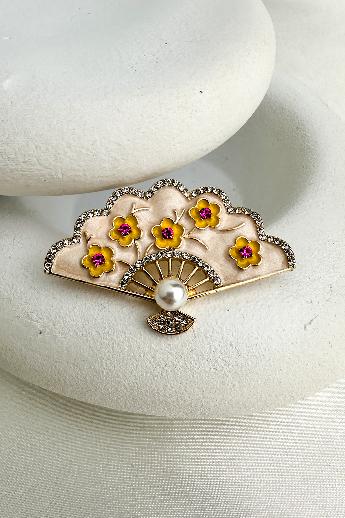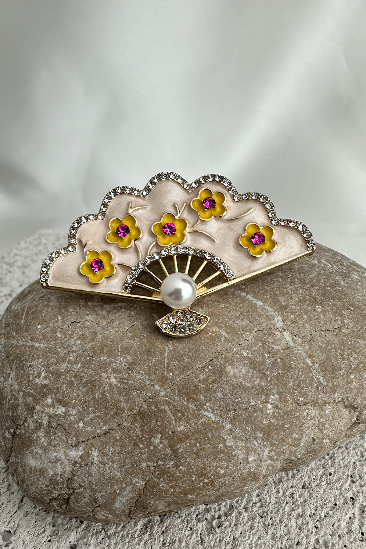 Yelpaze formundaki bu şık broş, sarı çiçek işlemeleriyle canlı ve neşeli bir dokunuş sunarken, taş süslemeleri ve inci detayıyla da sofistike bir ışıltı yaratıyor. Altın tonlarının sıcaklığı ile bütünleşen tasarımı, hem klasik hem modern stillere uyum sağlar.