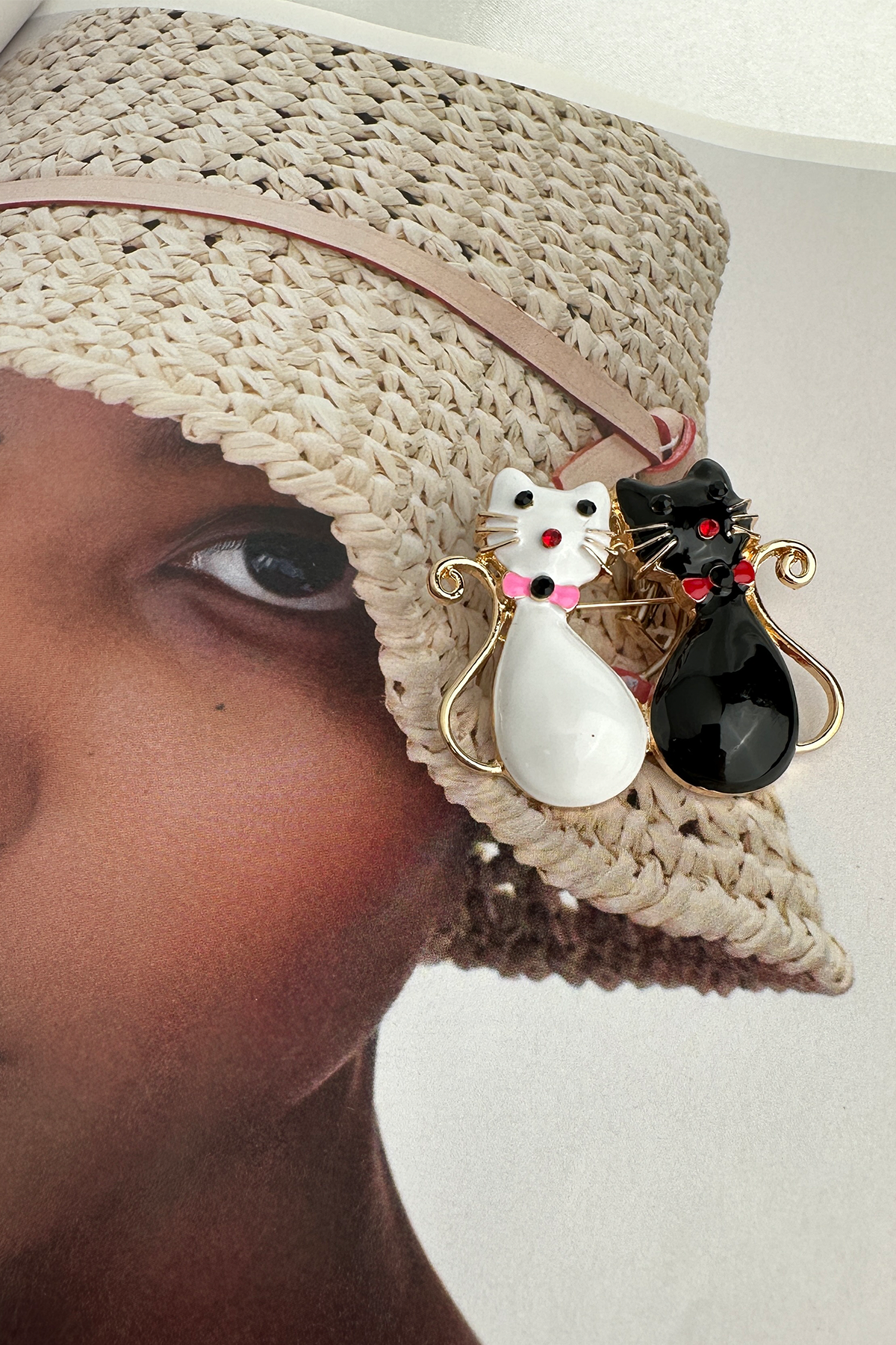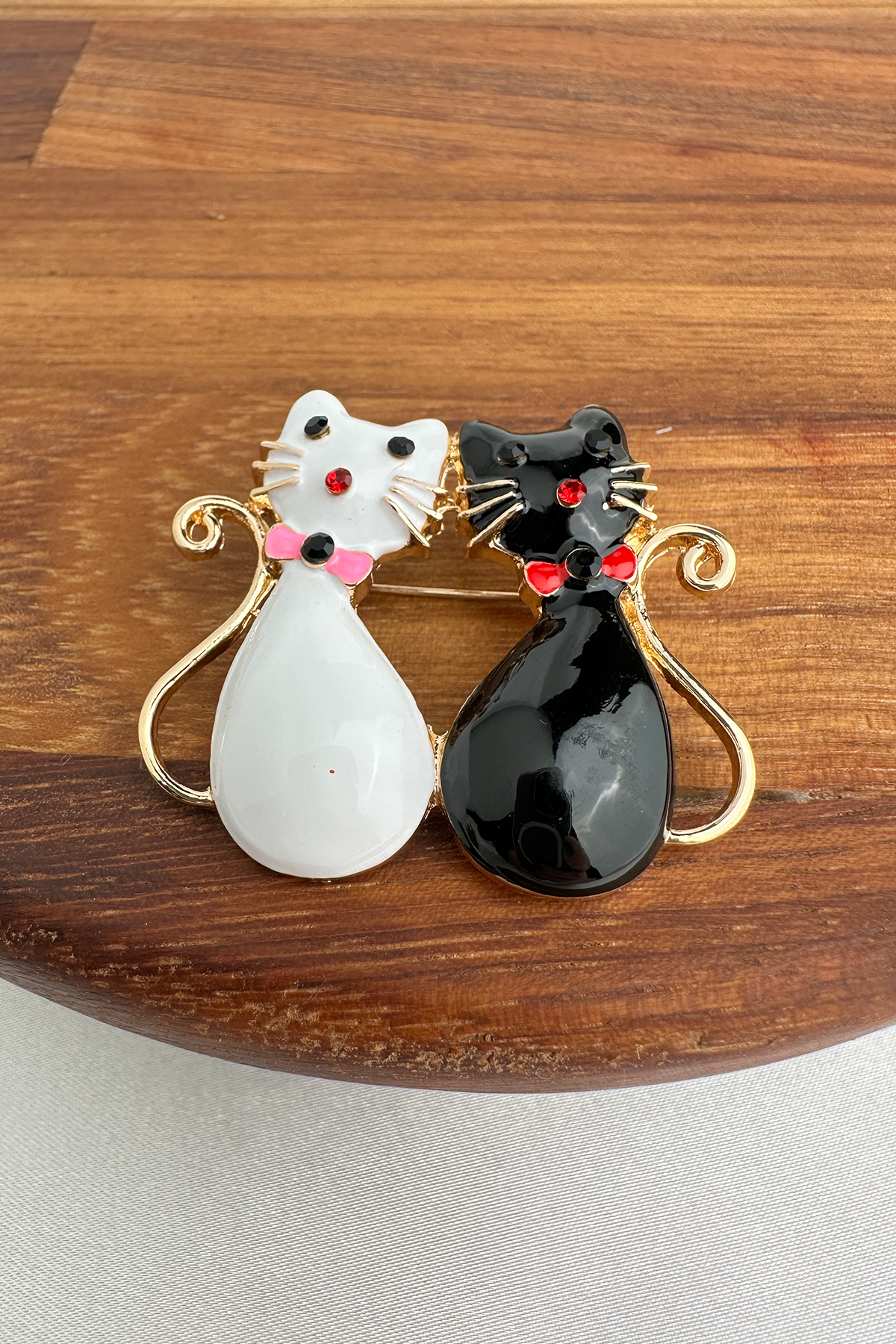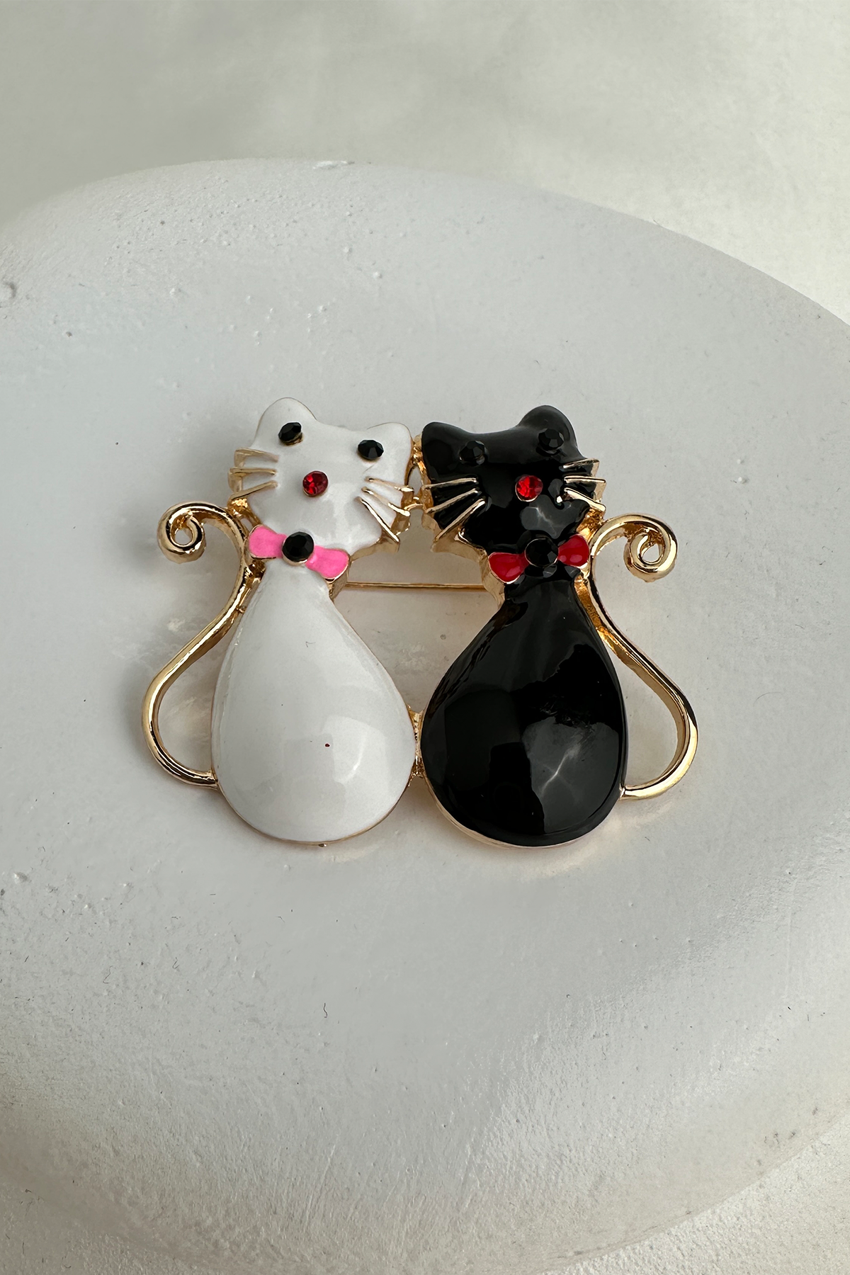 Şıklık ve sevimlilik bir arada! Siyah beyaz renklerin zarif uyumunu taşıyan bu ikili kedi broş, papyon detayıyla stilinize eğlenceli bir dokunuş katıyor. 4 cm boyutundaki ideal ölçüsü sayesinde ceketten çantaya, şaldan şapkaya kadar birçok alanda rahatlıkla kullanılabilir.