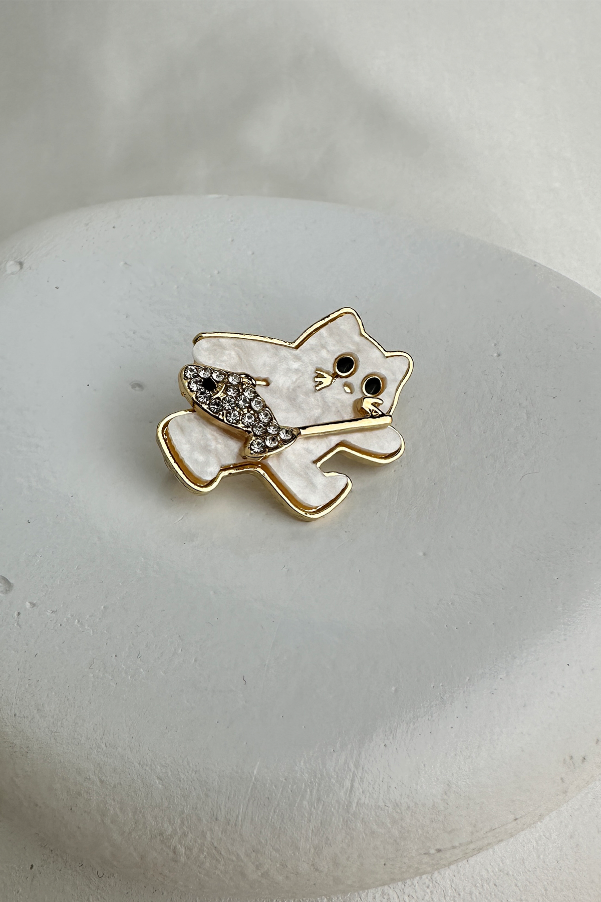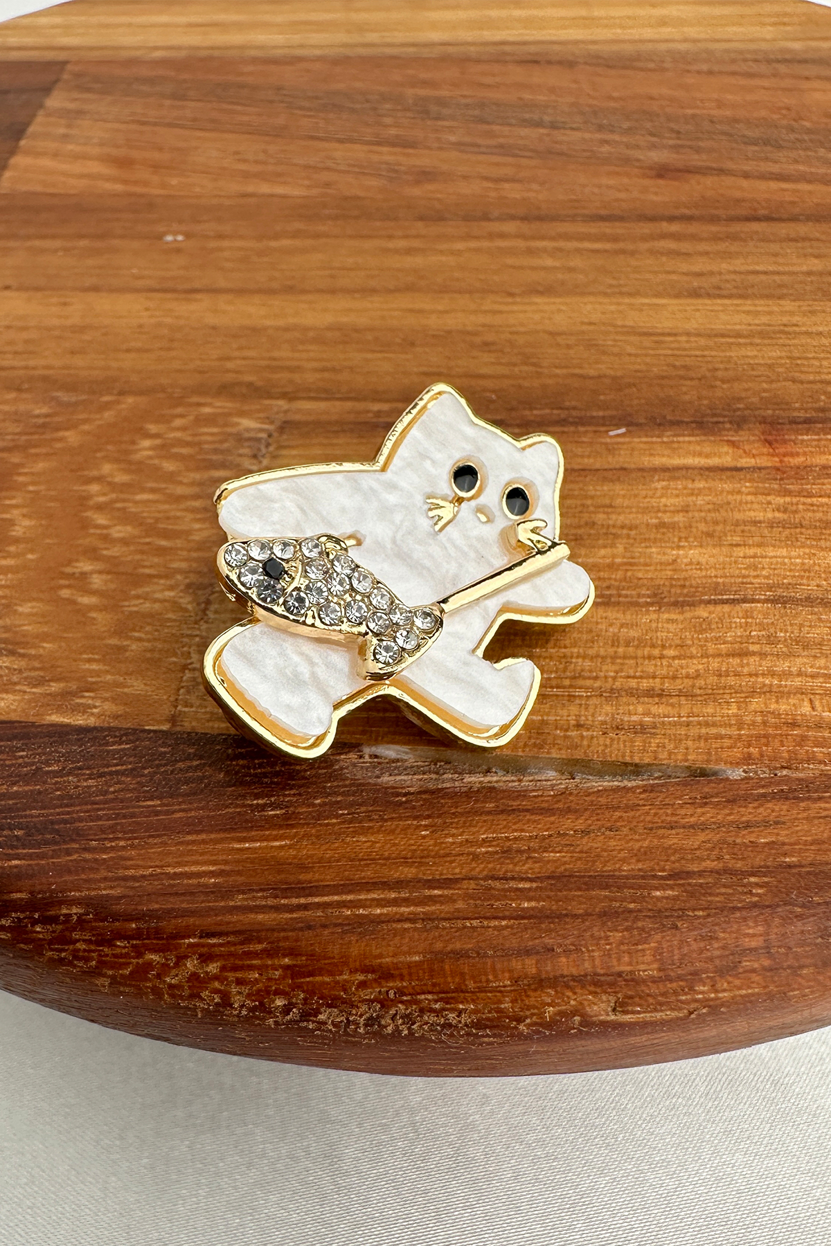 Tasarım: Beyaz mineli kedi figürü, taşlı balık detayıyla
