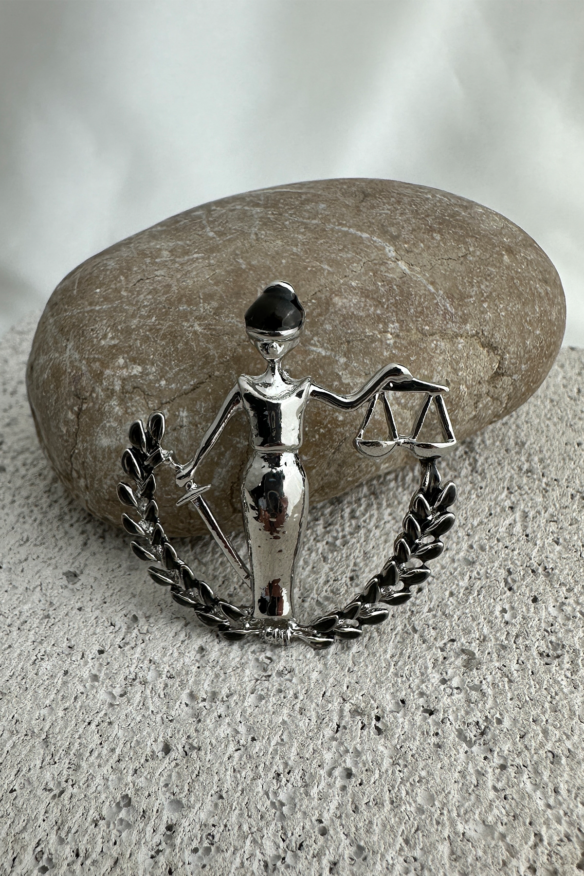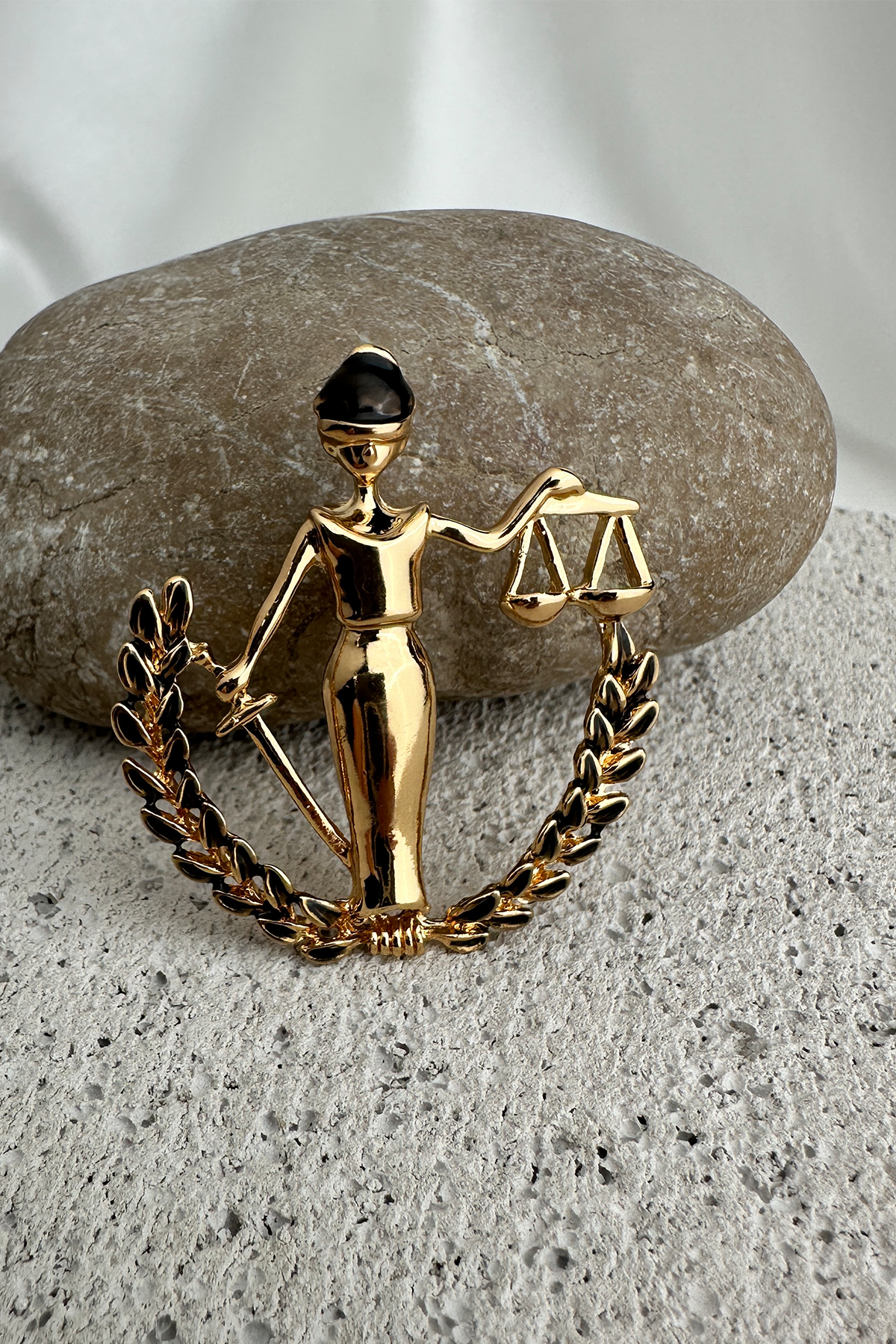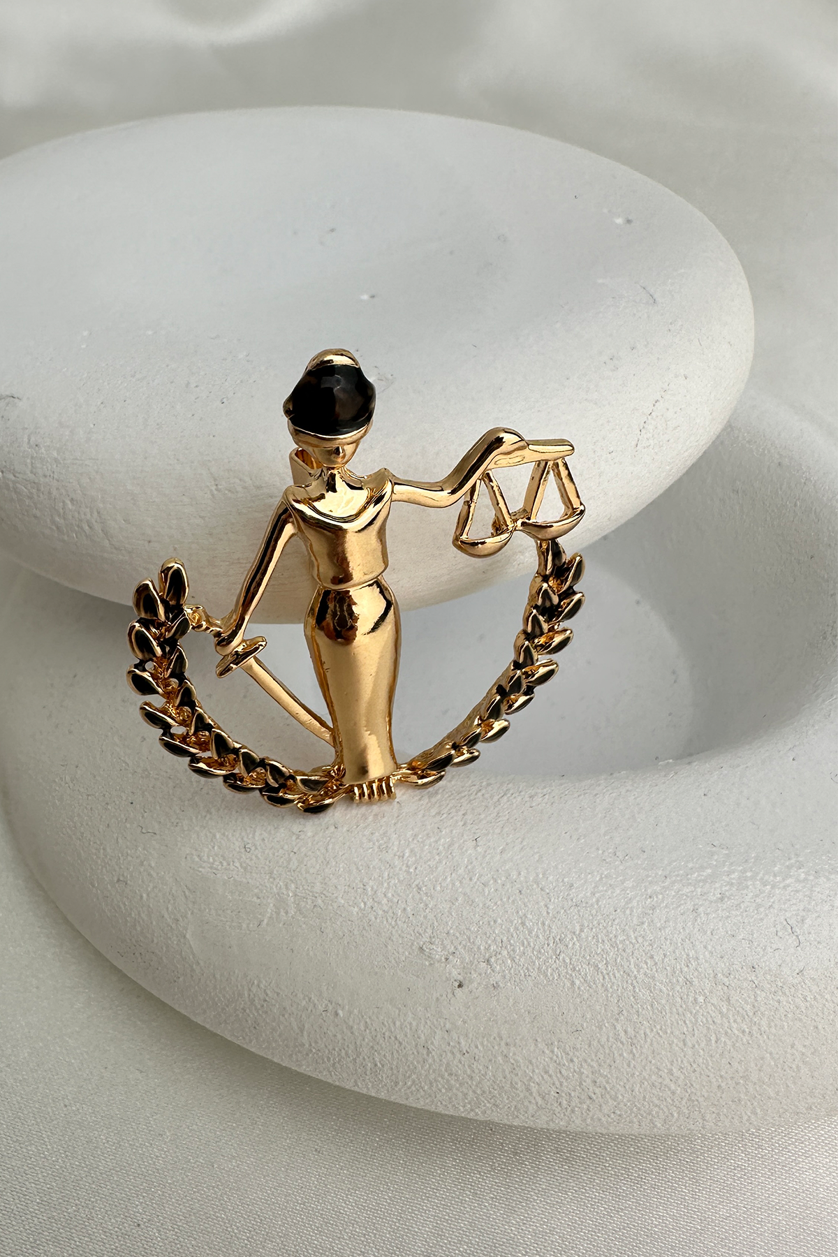 Klasik Adalet Heykeli figüründen ilham alınarak tasarlanan bu özel broş; elindeki terazi detayı ve mineli yüzeyiyle anlam yüklü ve estetik bir duruş sergiliyor. Göz alıcı işçiliğiyle dikkat çeken bu parça, adaleti, tarafsızlığı ve gücü stilinize zarif bir şekilde taşır.