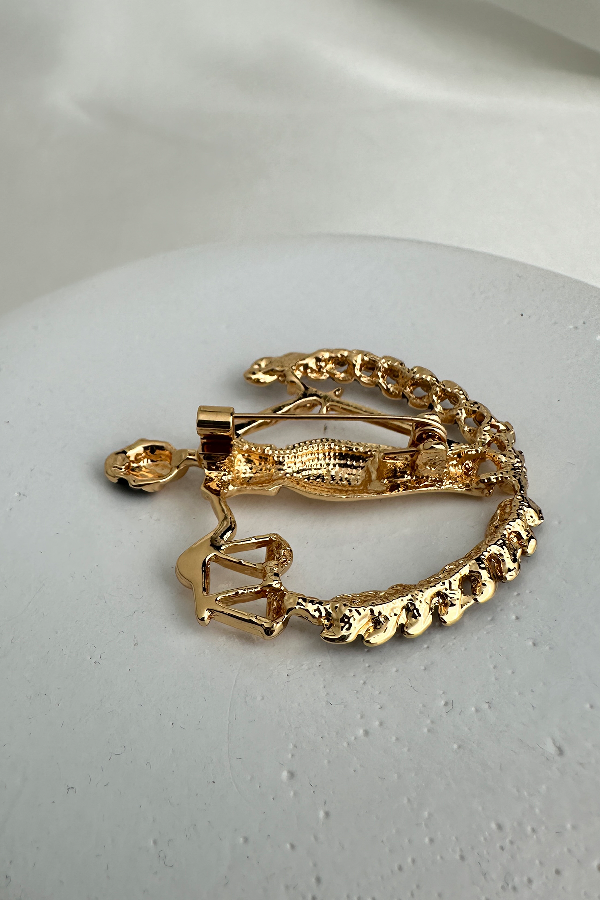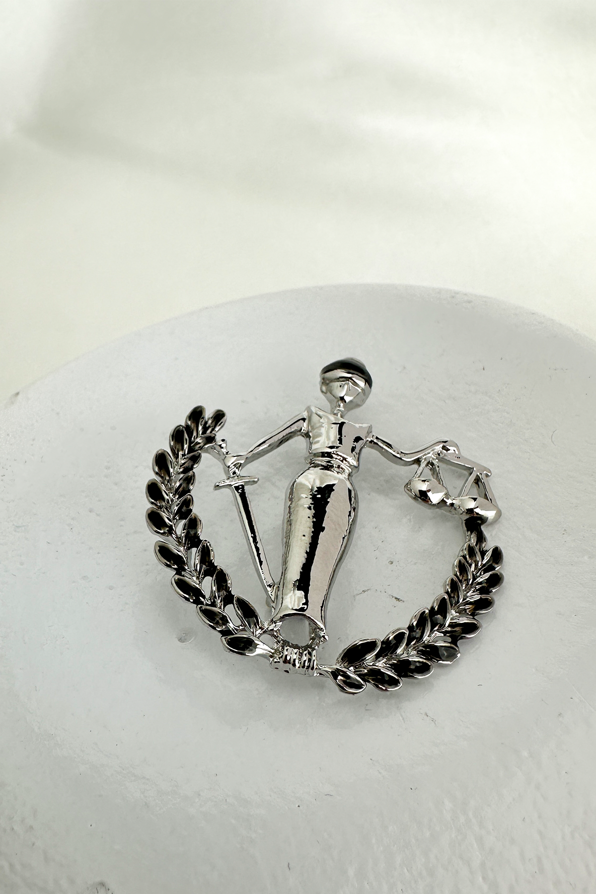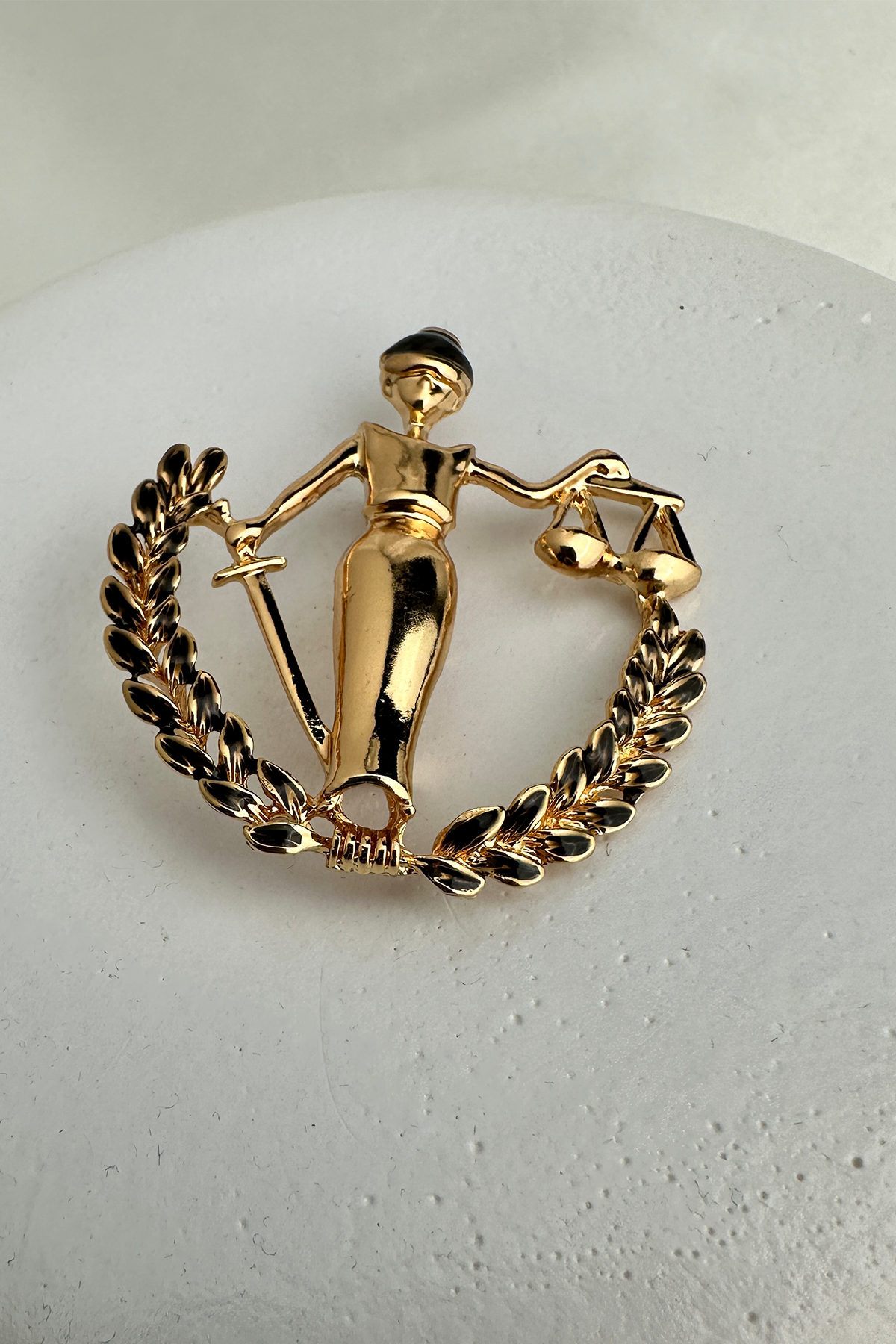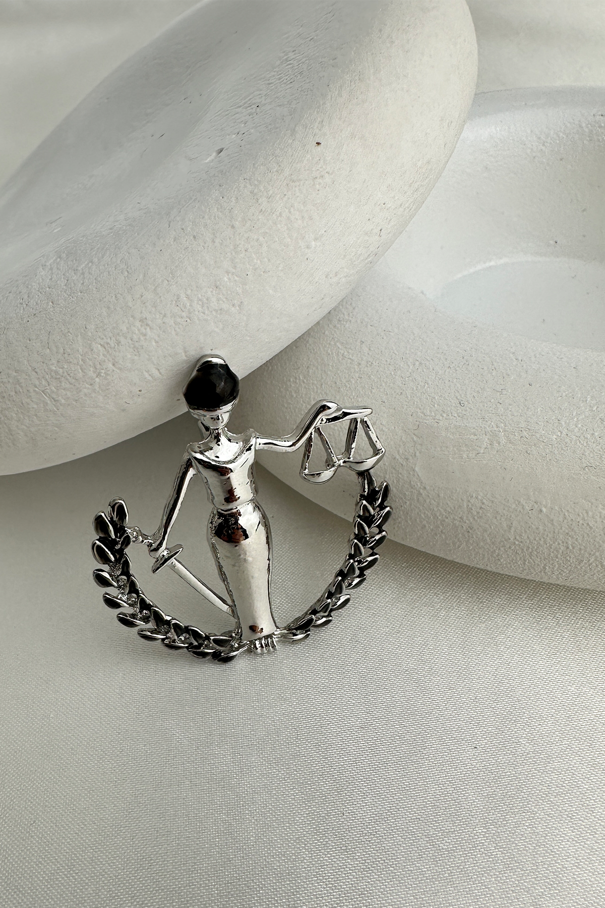 Klasik Adalet Heykeli figüründen ilham alınarak tasarlanan bu özel broş; elindeki terazi detayı ve mineli yüzeyiyle anlam yüklü ve estetik bir duruş sergiliyor. Göz alıcı işçiliğiyle dikkat çeken bu parça, adaleti, tarafsızlığı ve gücü stilinize zarif bir şekilde taşır.