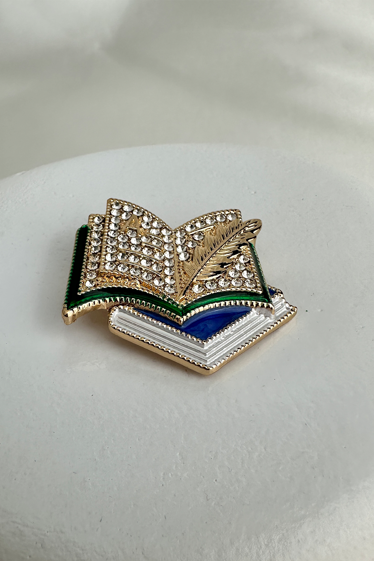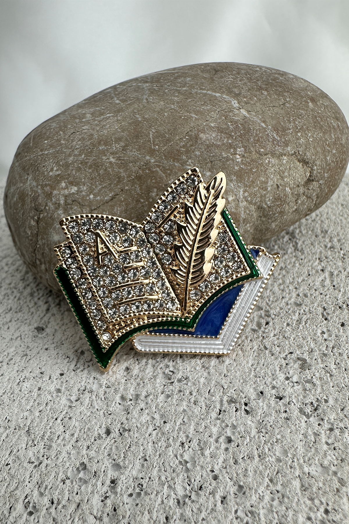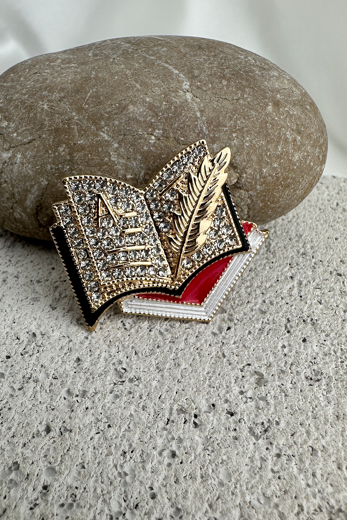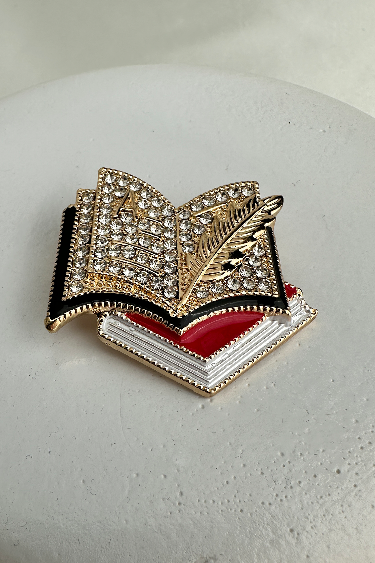 Tüy kalem, kitap ve defter figürlerinden oluşan bu anlam yüklü broş; yazmayı, okumayı ve bilgiyi sevenler için zarif bir sembol niteliğinde. Renkli detaylar ve ışıltılı taş süslemeler, bu özel tasarımı daha da dikkat çekici hale getiriyor. Küçük ama etkili boyutuyla her kombine anlamlı bir dokunuş katıyor.