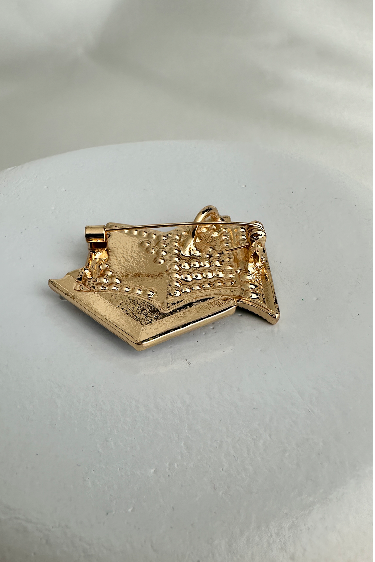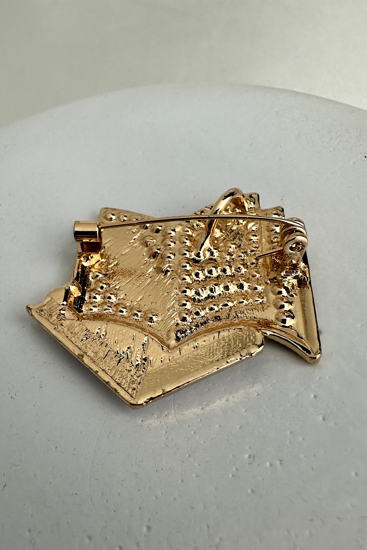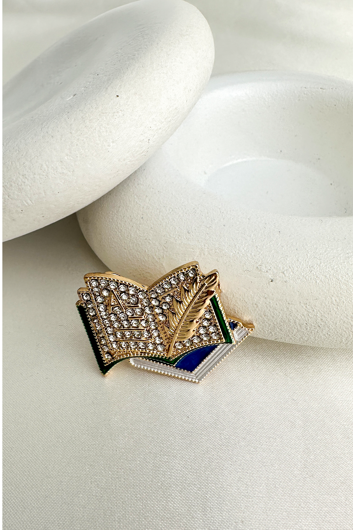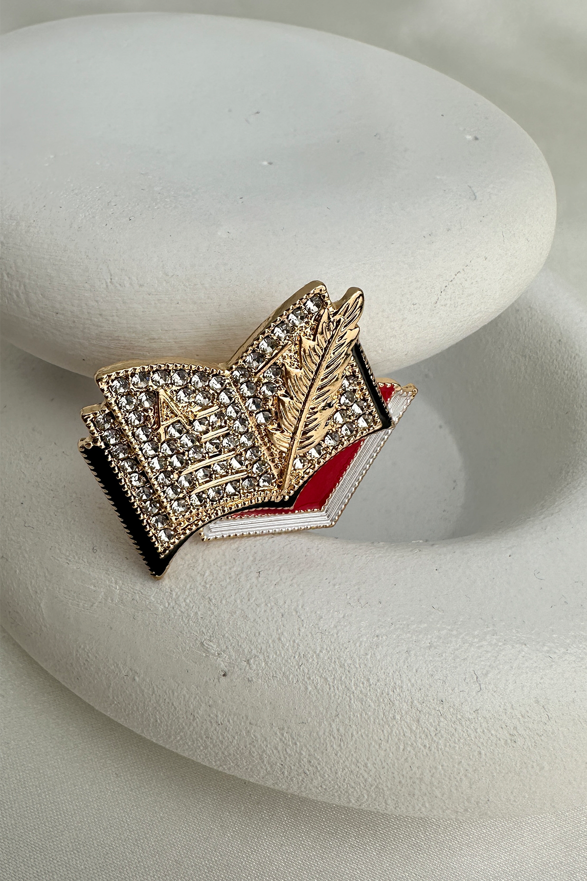 Tüy kalem, kitap ve defter figürlerinden oluşan bu anlam yüklü broş; yazmayı, okumayı ve bilgiyi sevenler için zarif bir sembol niteliğinde. Renkli detaylar ve ışıltılı taş süslemeler, bu özel tasarımı daha da dikkat çekici hale getiriyor. Küçük ama etkili boyutuyla her kombine anlamlı bir dokunuş katıyor.