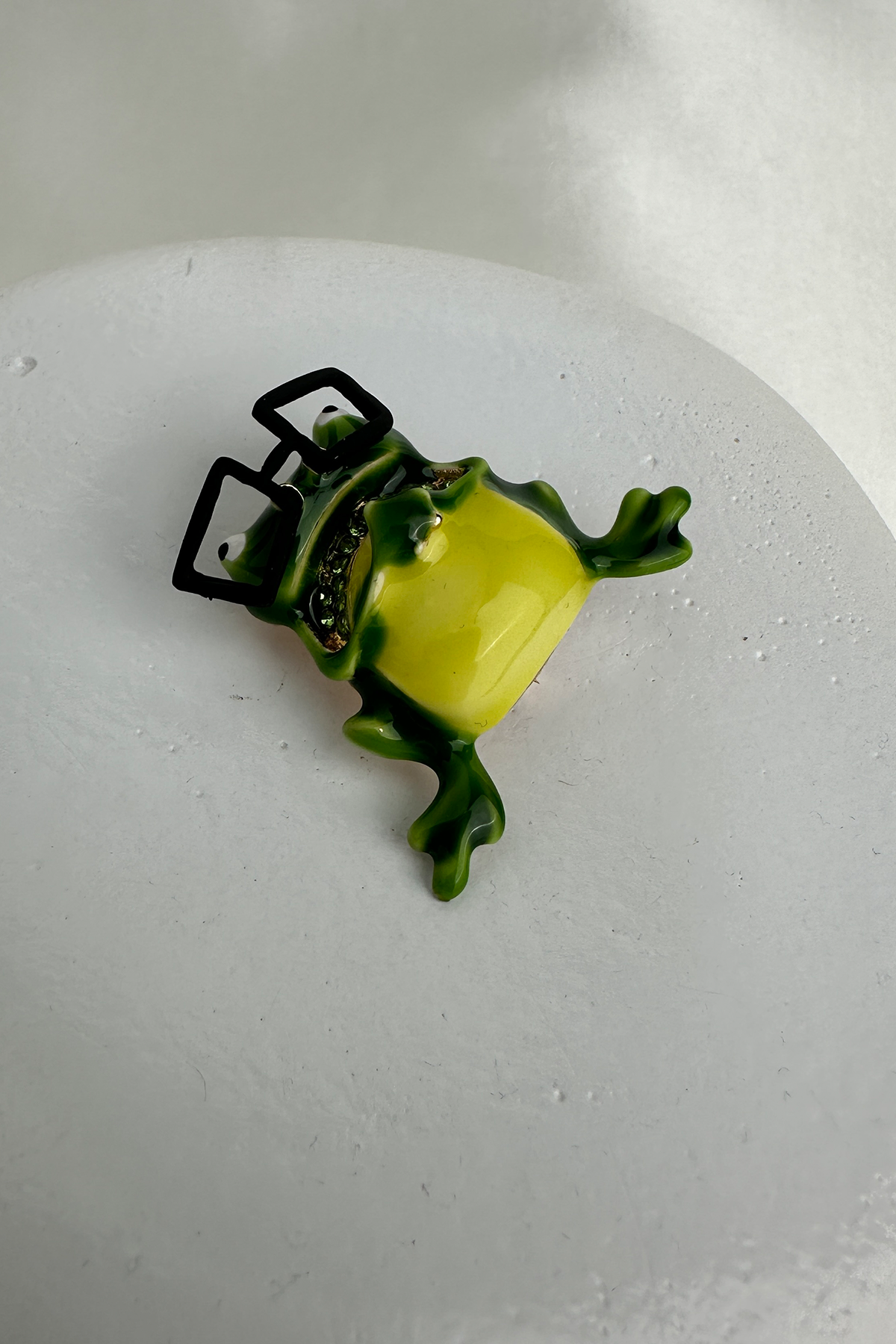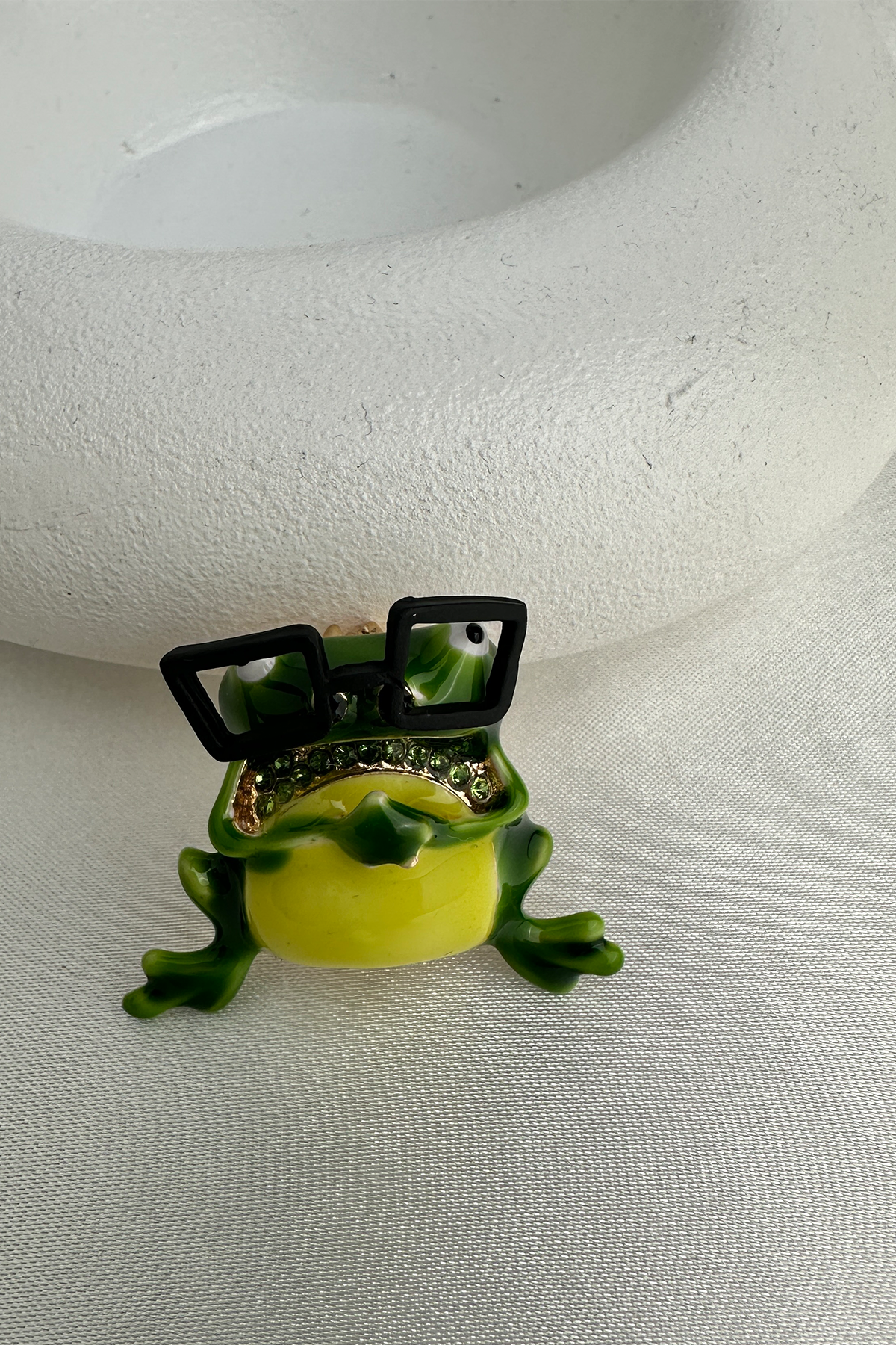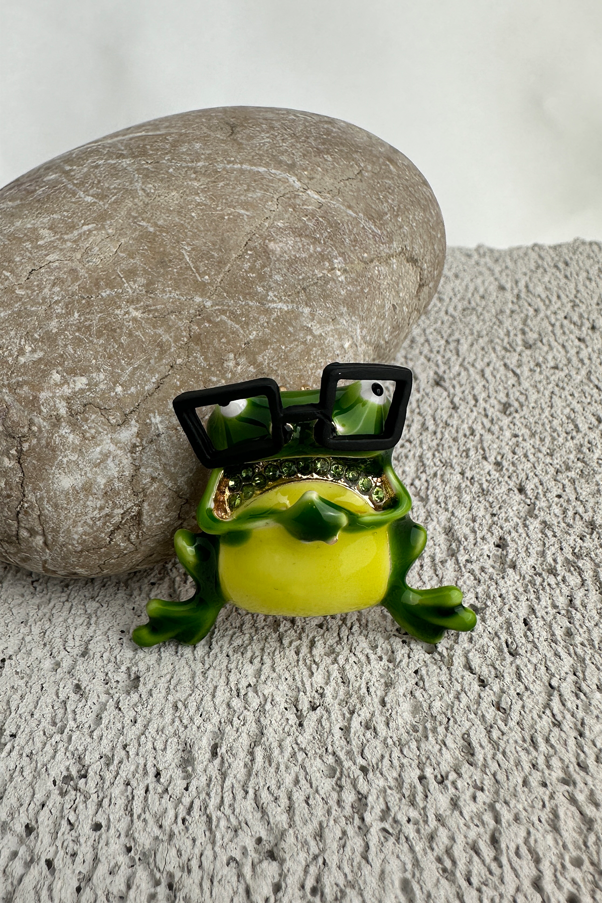Tarzınıza neşe katacak bu özel tasarım Yeşil Renk Siyah Gözlük Detaylı Sevimli Kurbağa Broş, sıradanlıktan uzaklaşmak isteyenler için ideal! 3 cm'lik kompakt boyutu, canlı yeşil rengi ve minik siyah gözlük detayıyla dikkat çeken bu broş, enerjik kişiliğinizi yansıtmanın en şirin yolu.