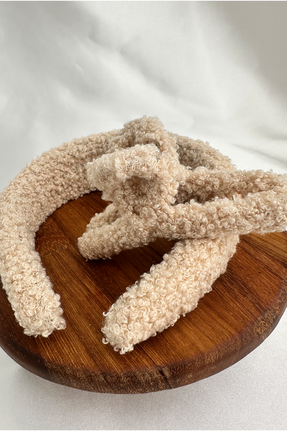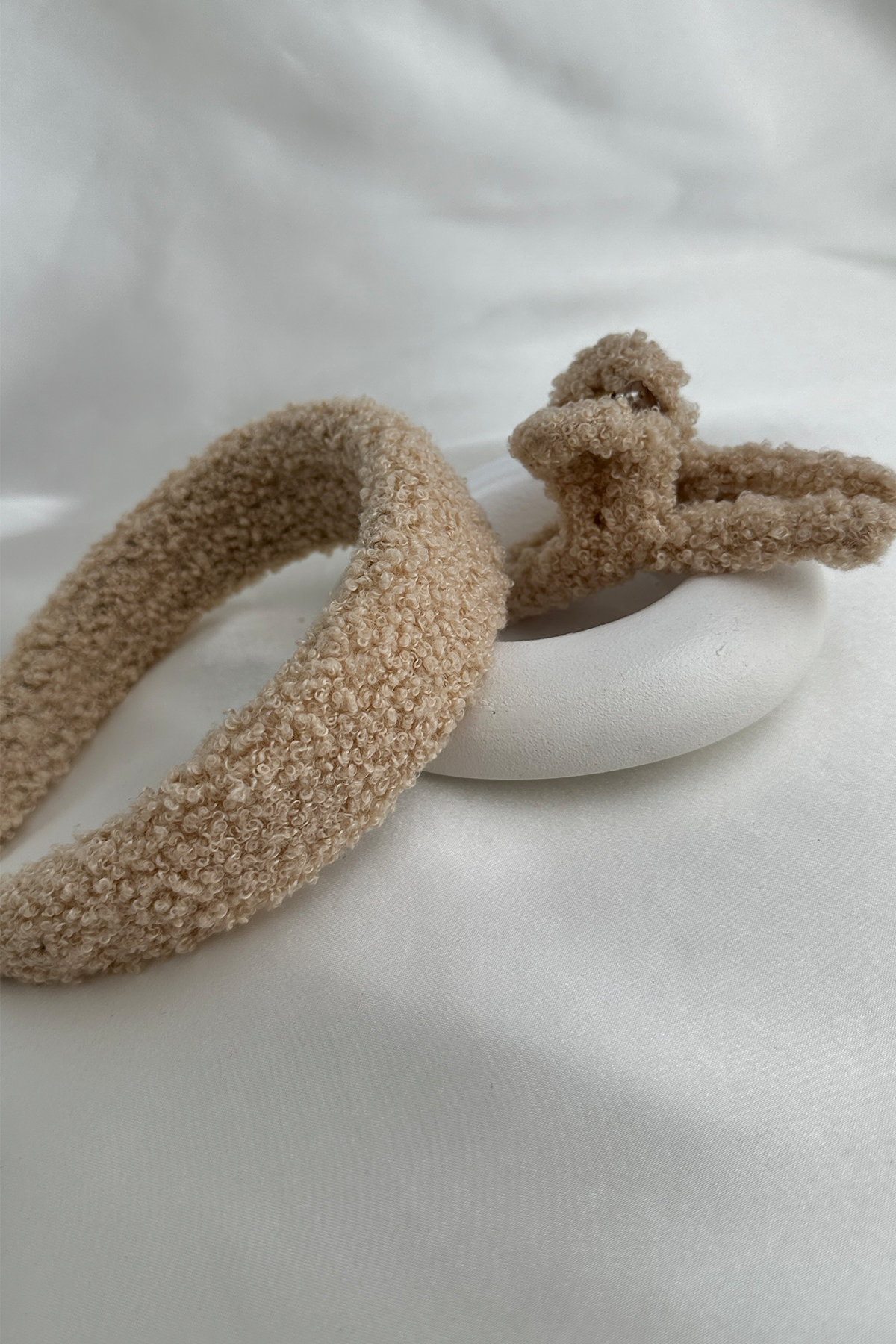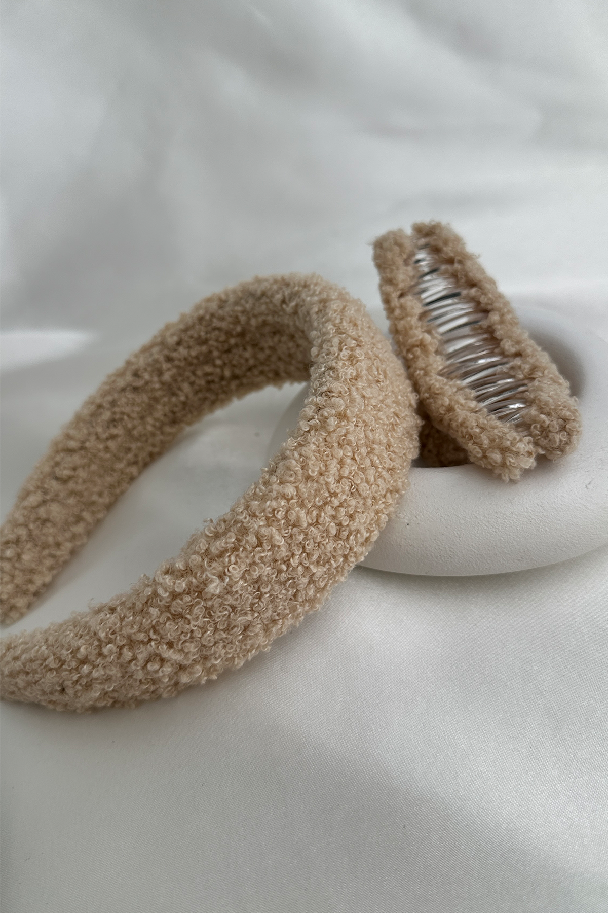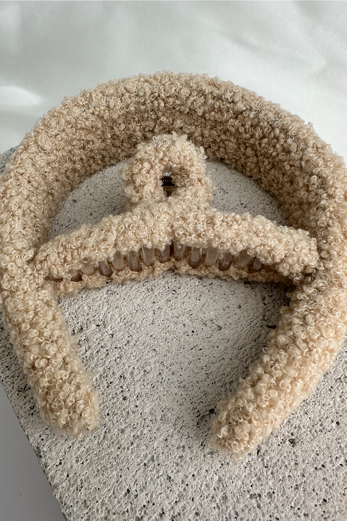 Bukle formundaki tüylü taç, yumuşacık yapısıyla başınızı sıkmadan gün boyu konfor sağlar. Mandal tokası ise hem şık hem pratik; saçları kolayca toplar, kayma yapmaz. Bej rengin doğal ve sade havasıyla her tarza uyum sağlar.