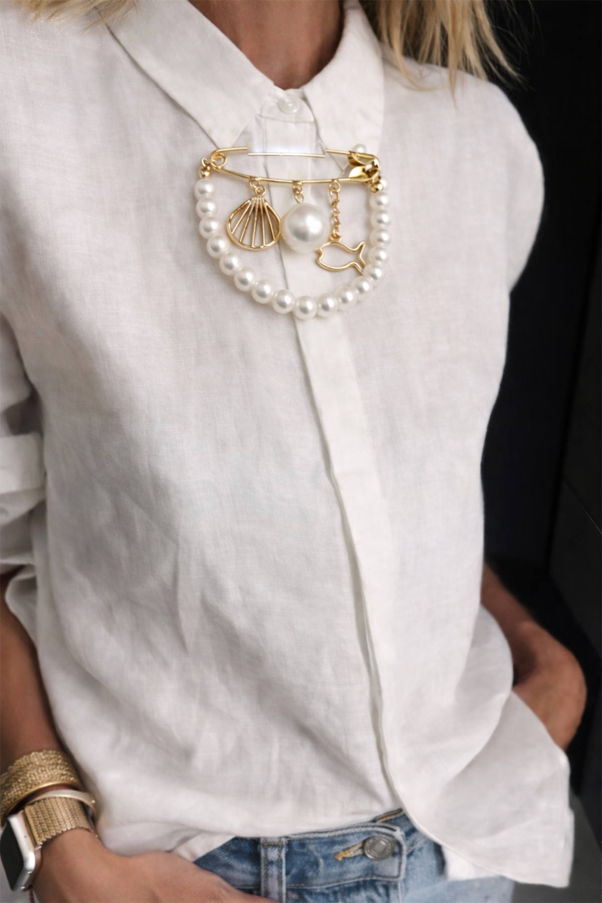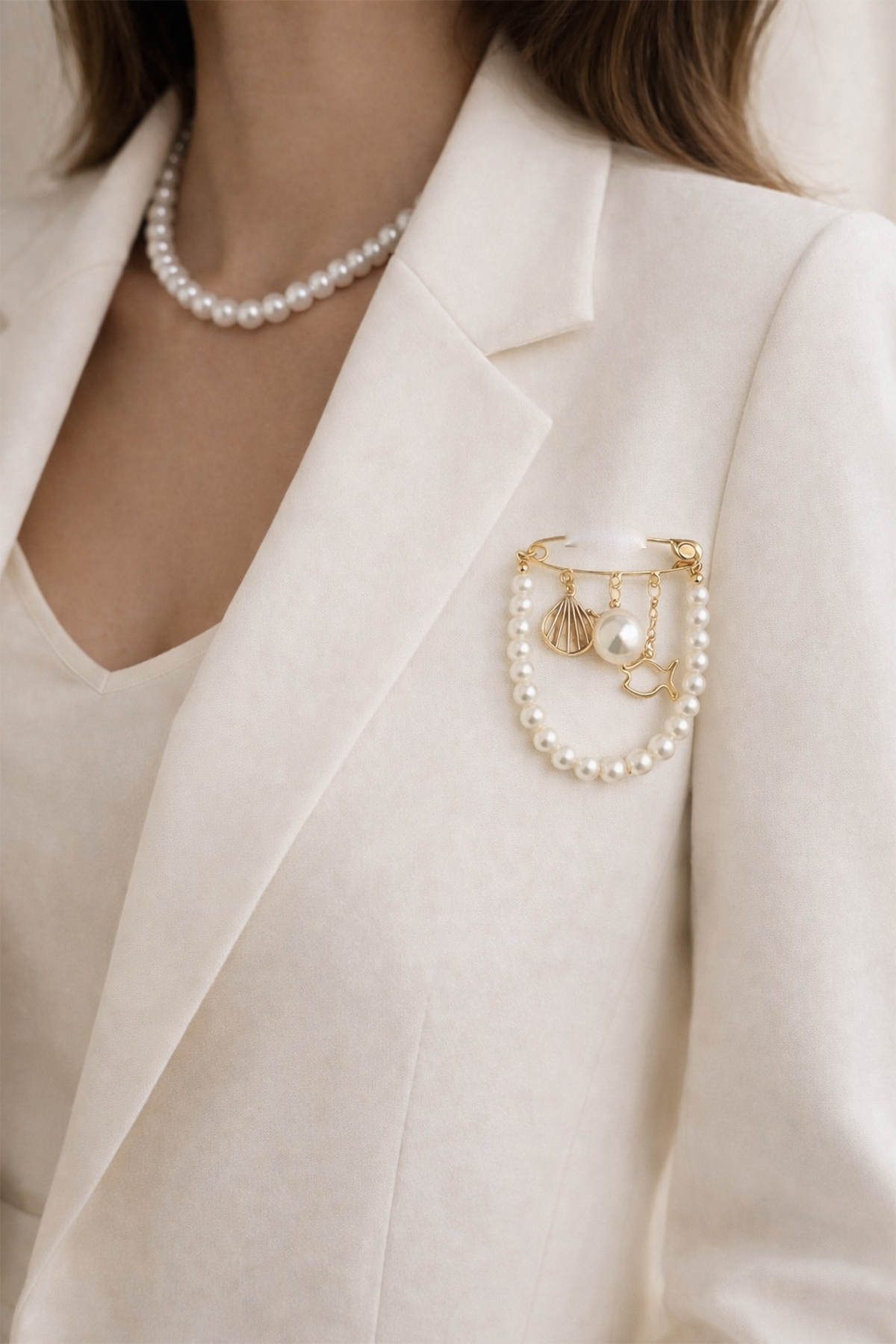 Zarif tasarımıyla dikkat çeken bu özel broş, deniz esintisini stilinize taşıyor. Balık dış kabuğu figürü ve inci detaylarının uyumu, ürüne hem şık hem de sofistike bir görünüm kazandırır. Çoklu iğne yapısı sayesinde kıyafetlerinize sağlam bir şekilde tutunur ve gün boyu güvenle kullanılabilir.