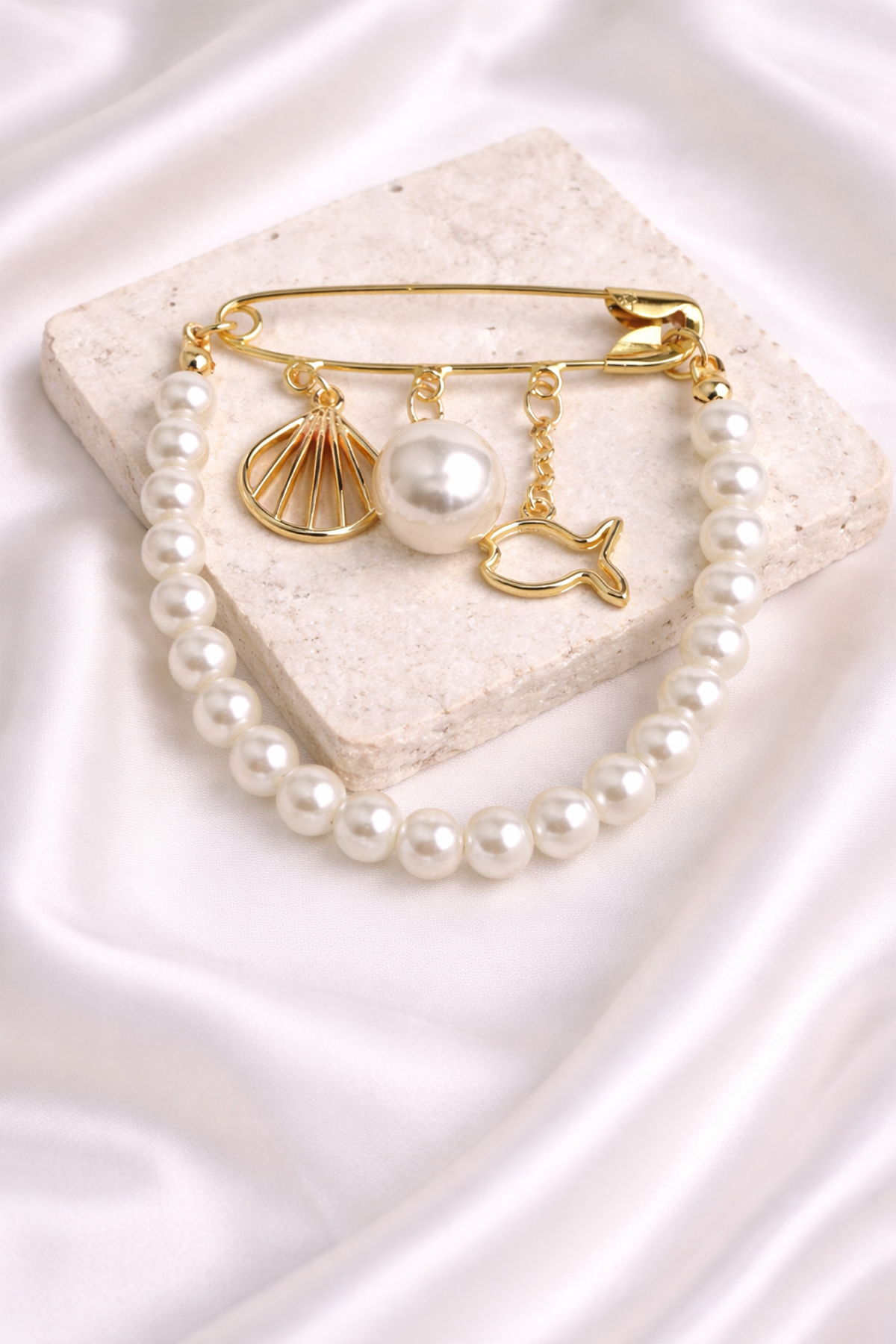 İnci Detay Balık Dış Kabuğu Figürlü Çoklu İğne Broş (4x5 cm)