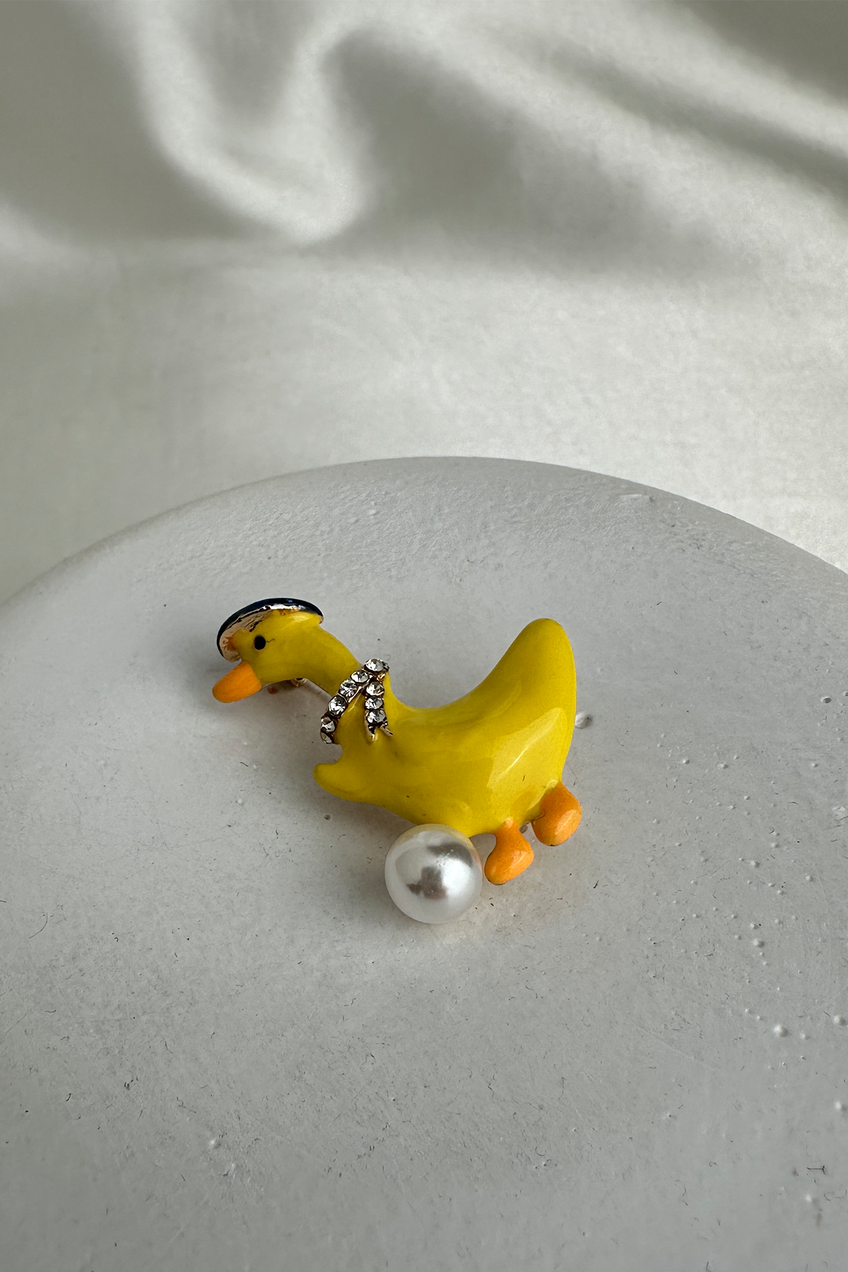Sevimli ördek figürü, şapka detayı ve inci dokunuşuyla tasarlanan bu özel broş; neşeli tasarımıyla kombinlerinize eğlenceli ve zarif bir hava katar. Sarı rengiyle enerjik bir görünüm sunarken, inci detayı şıklığı tamamlar.